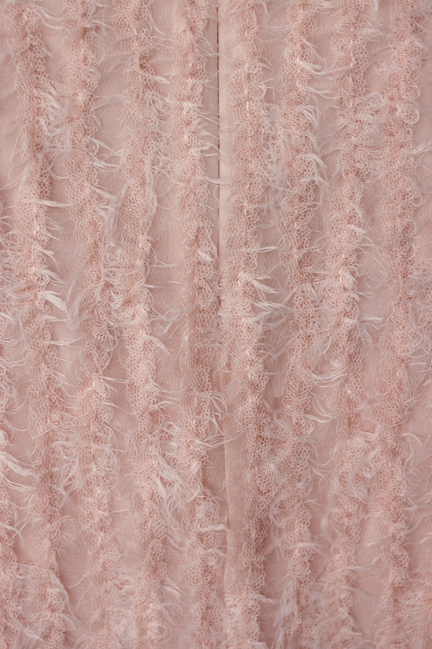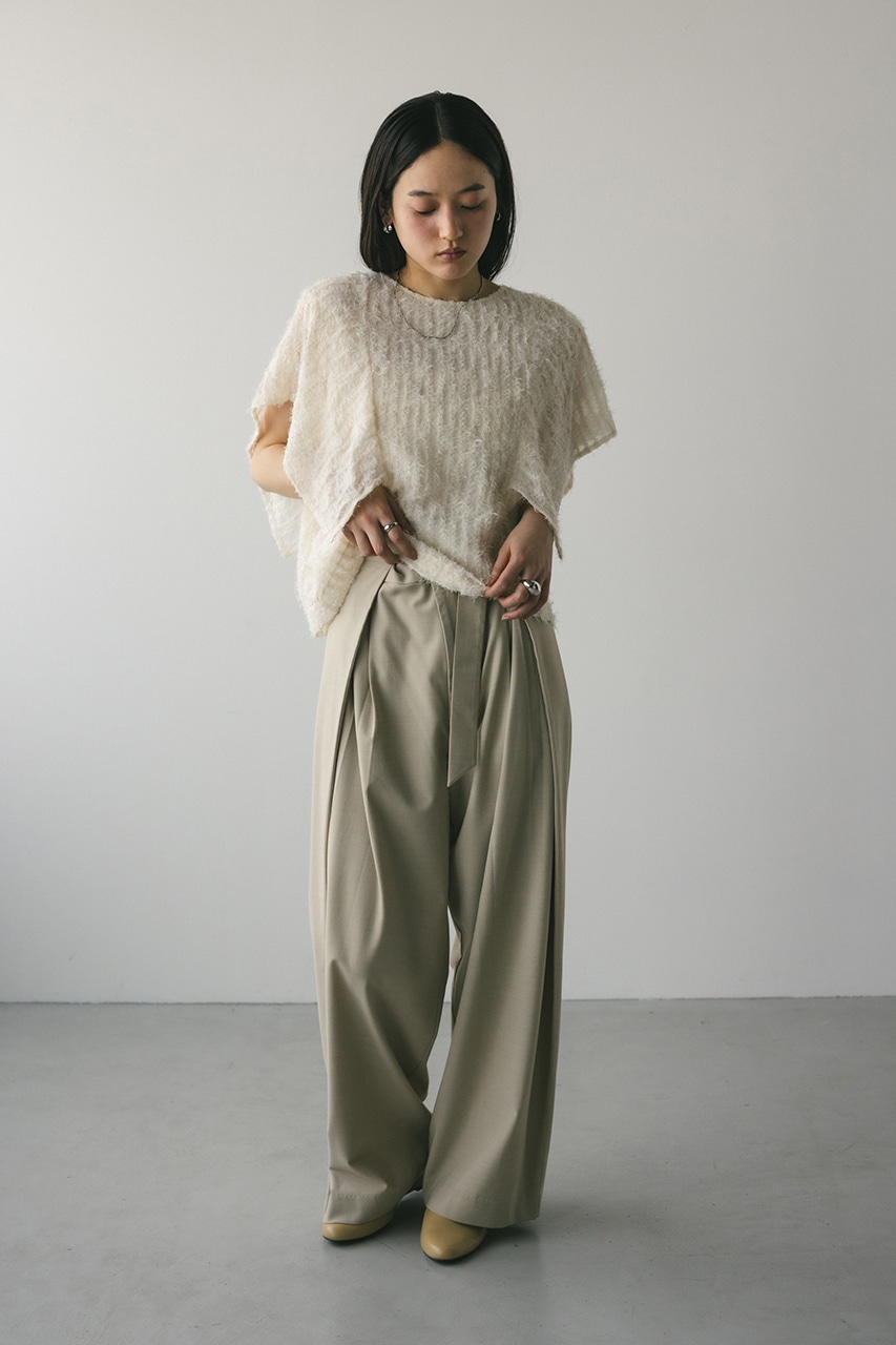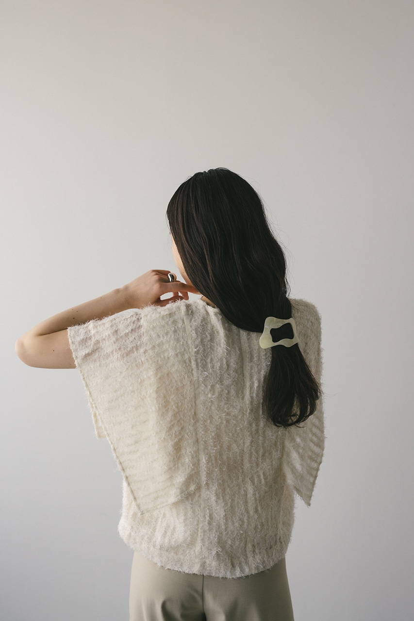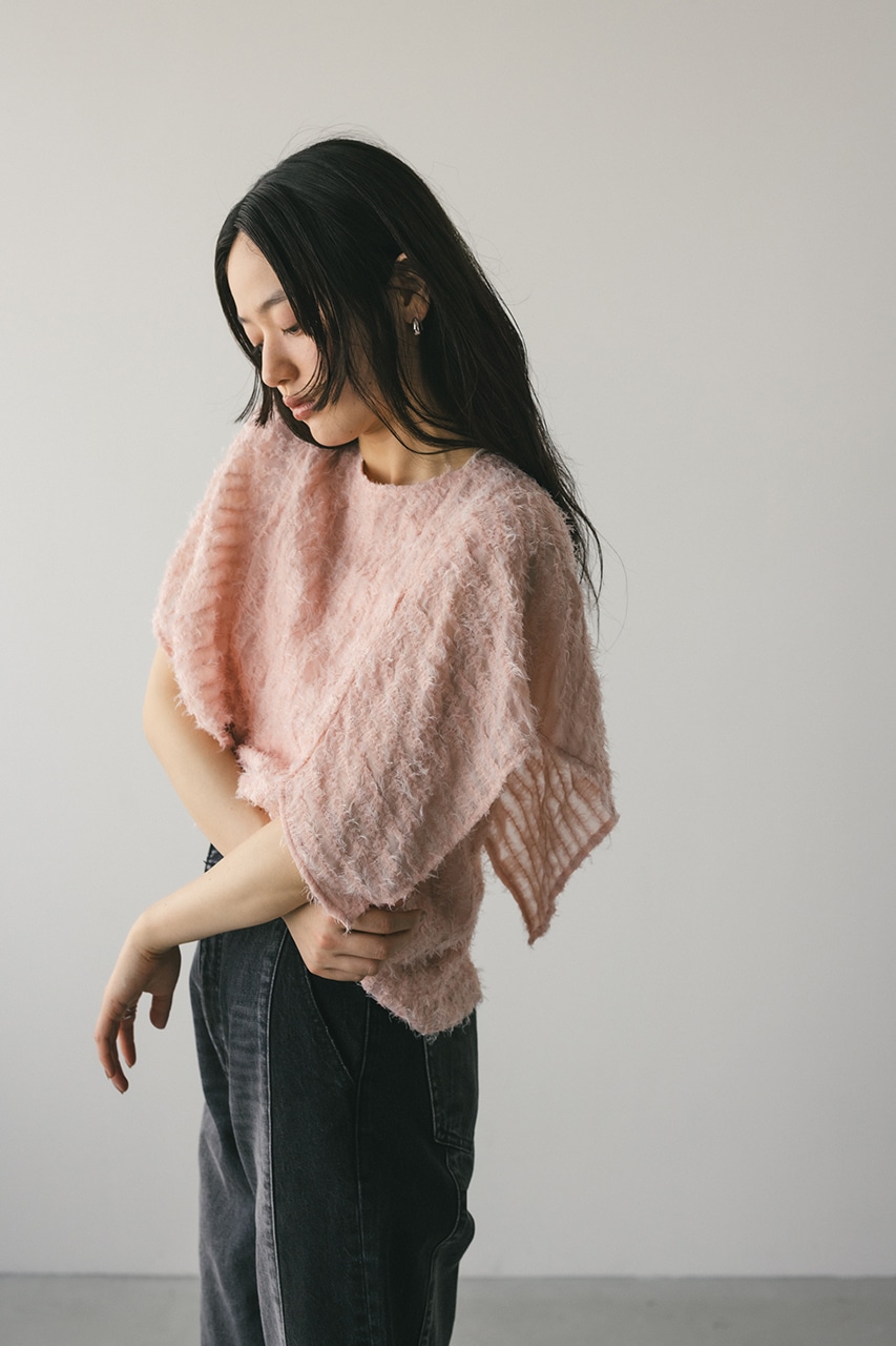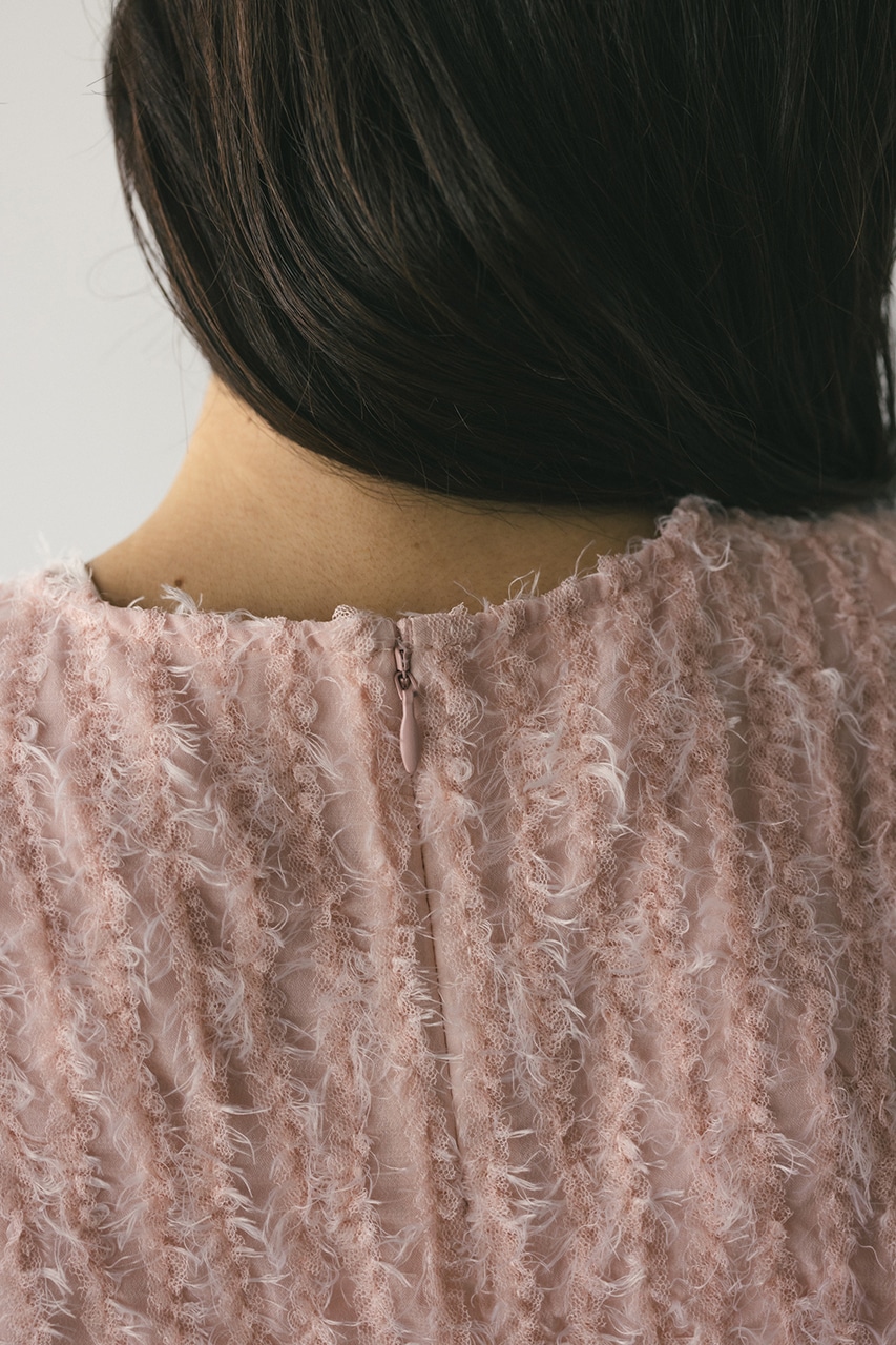 程よい透け感のシアー素材にメッシュフリンジシャーリングステッチを施した生地で仕立てたデザインブラウス。大きなショルダーパネルが華やかな印象にしてくれる映える一枚。肩から斜めに入れたパネルラインが身体を華奢にみせてくれます。見頃は裏地付きでインナーを気にせずに着用していただけます。透け感袖部分あり、ストレッチなし。