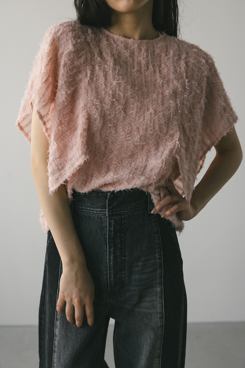 程よい透け感のシアー素材にメッシュフリンジシャーリングステッチを施した生地で仕立てたデザインブラウス。大きなショルダーパネルが華やかな印象にしてくれる映える一枚。肩から斜めに入れたパネルラインが身体を華奢にみせてくれます。見頃は裏地付きでインナーを気にせずに着用していただけます。透け感袖部分あり、ストレッチなし。
