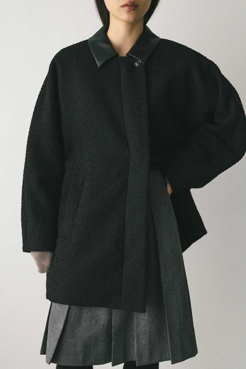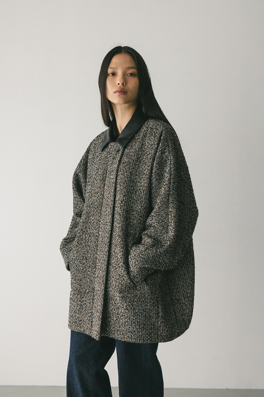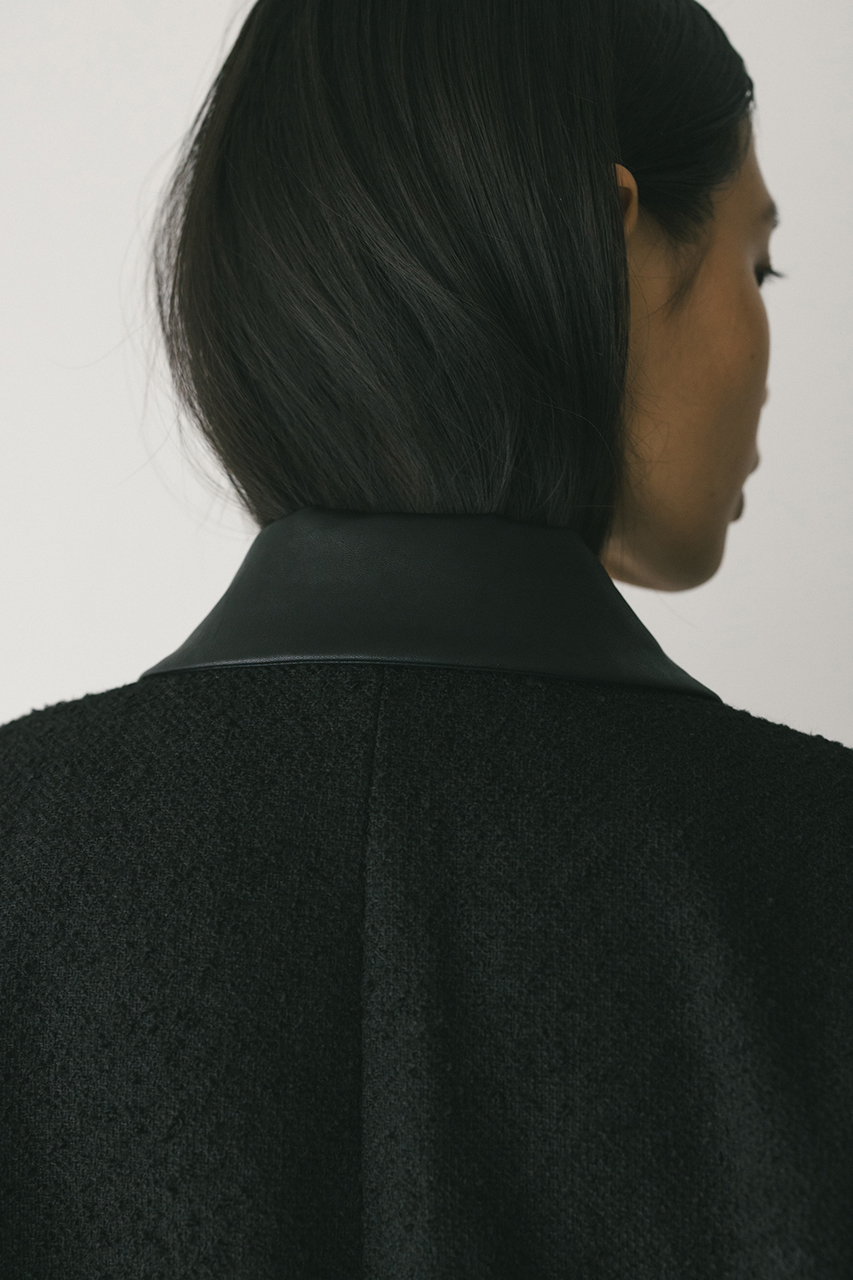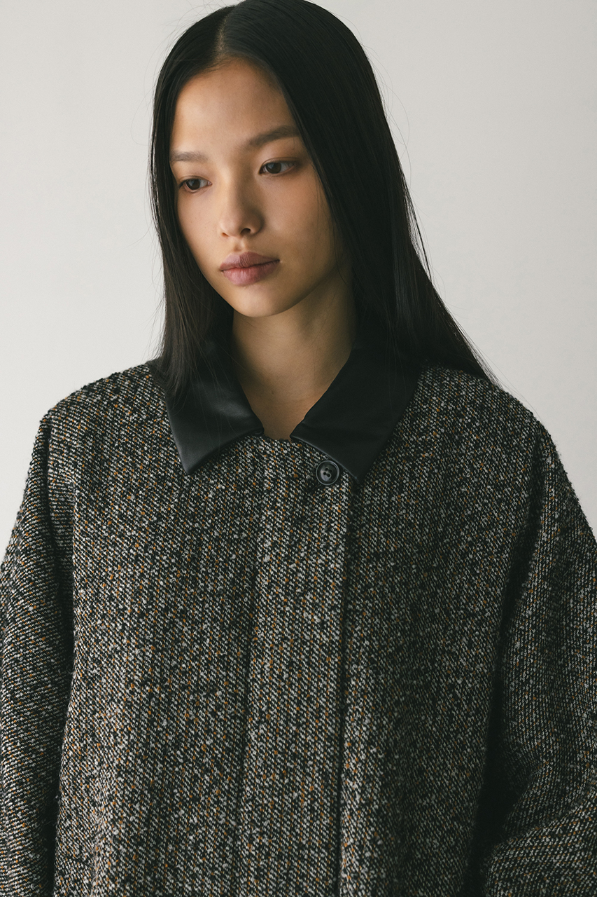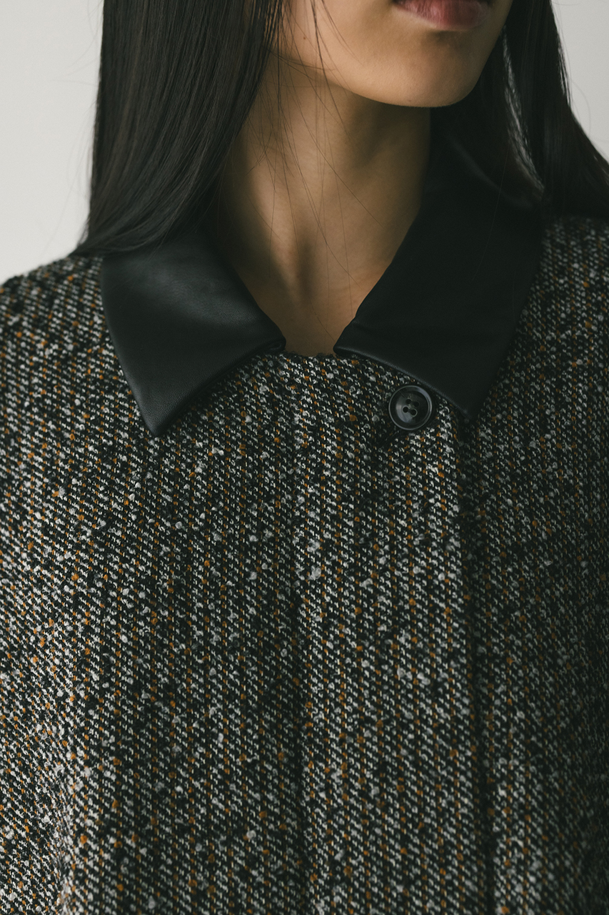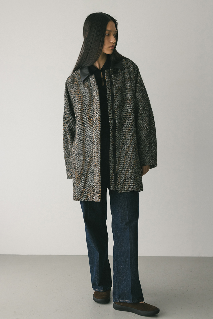 フェイクレザーの襟がポイントのツイードミディコート。タックを入れてこなれ感のあるフォルムに仕上げました。スタイリング変化を楽しめる逆開ファスナー仕様。透け感なし、ストレッチなし。
