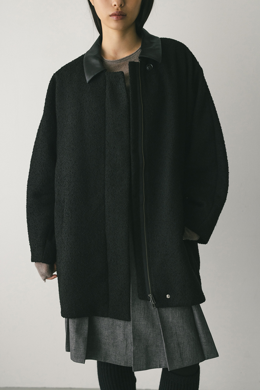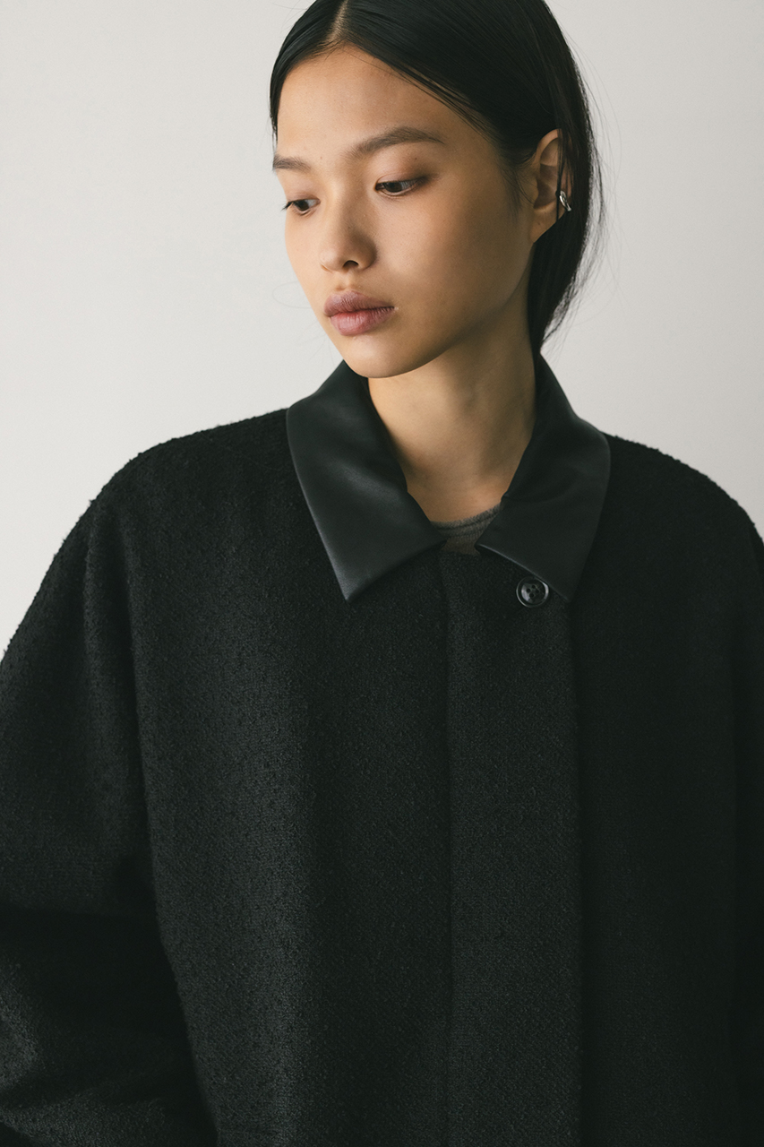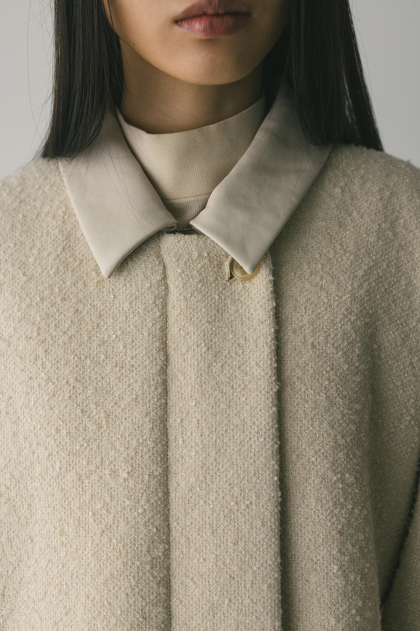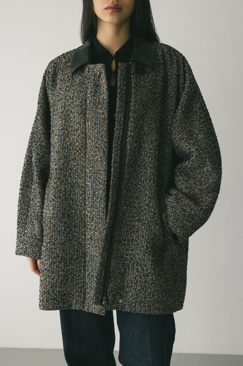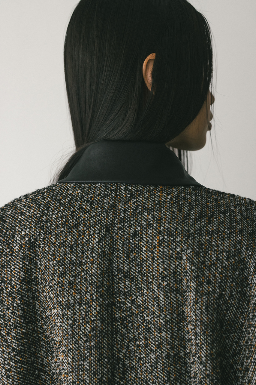 フェイクレザーの襟がポイントのツイードミディコート。タックを入れてこなれ感のあるフォルムに仕上げました。スタイリング変化を楽しめる逆開ファスナー仕様。透け感なし、ストレッチなし。