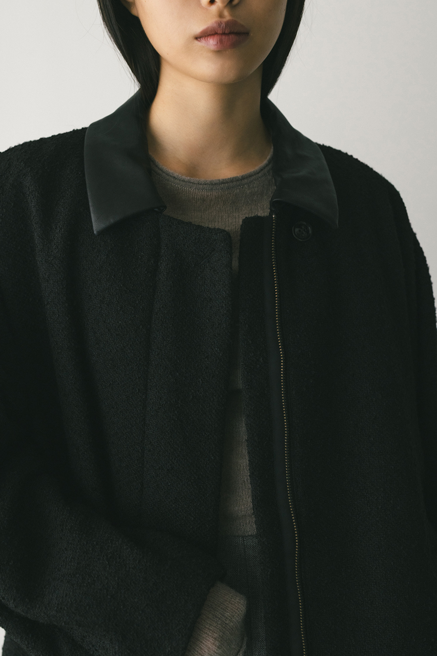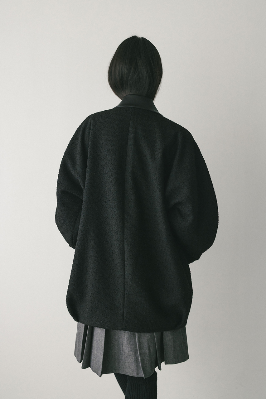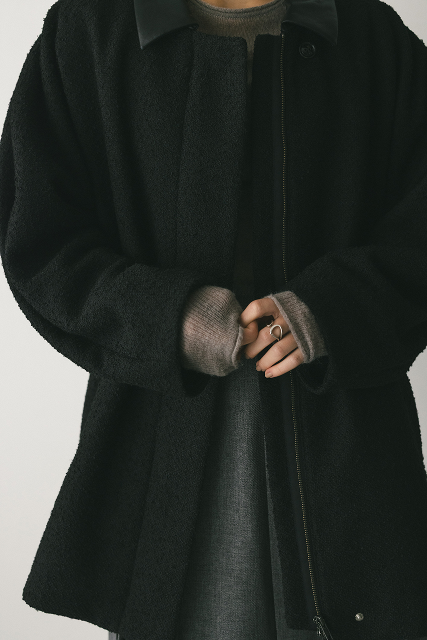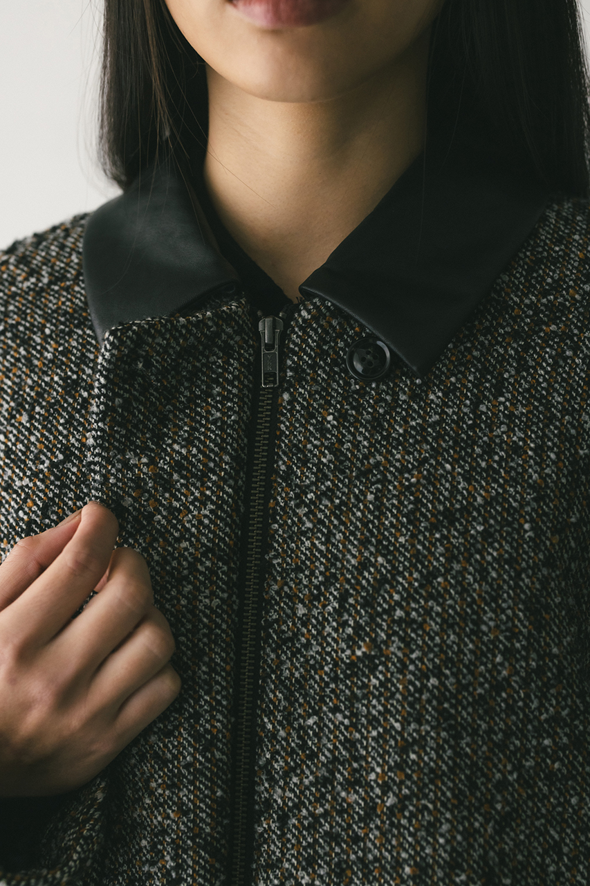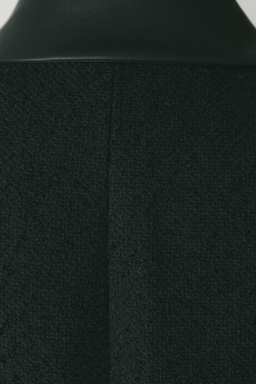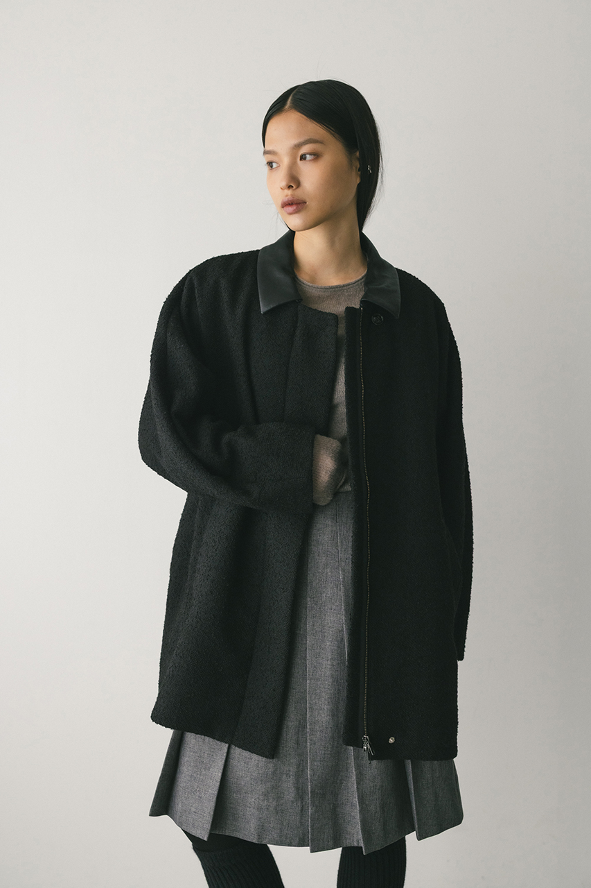 フェイクレザーの襟がポイントのツイードミディコート。タックを入れてこなれ感のあるフォルムに仕上げました。スタイリング変化を楽しめる逆開ファスナー仕様。透け感なし、ストレッチなし。