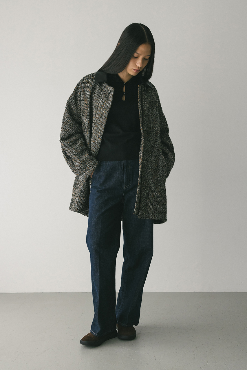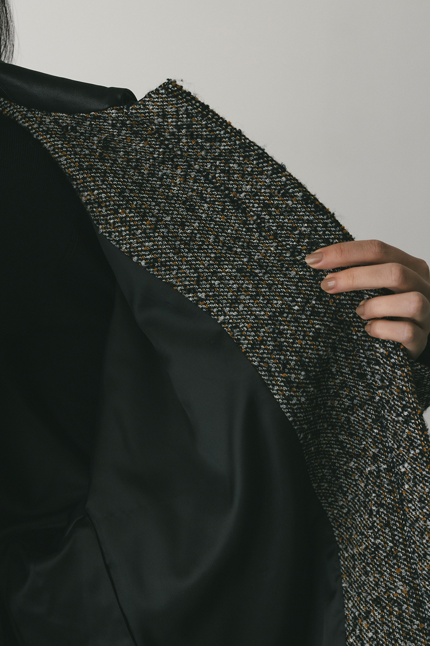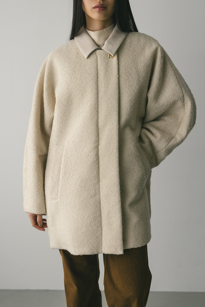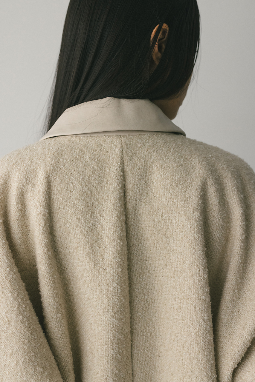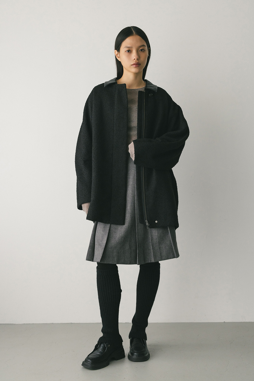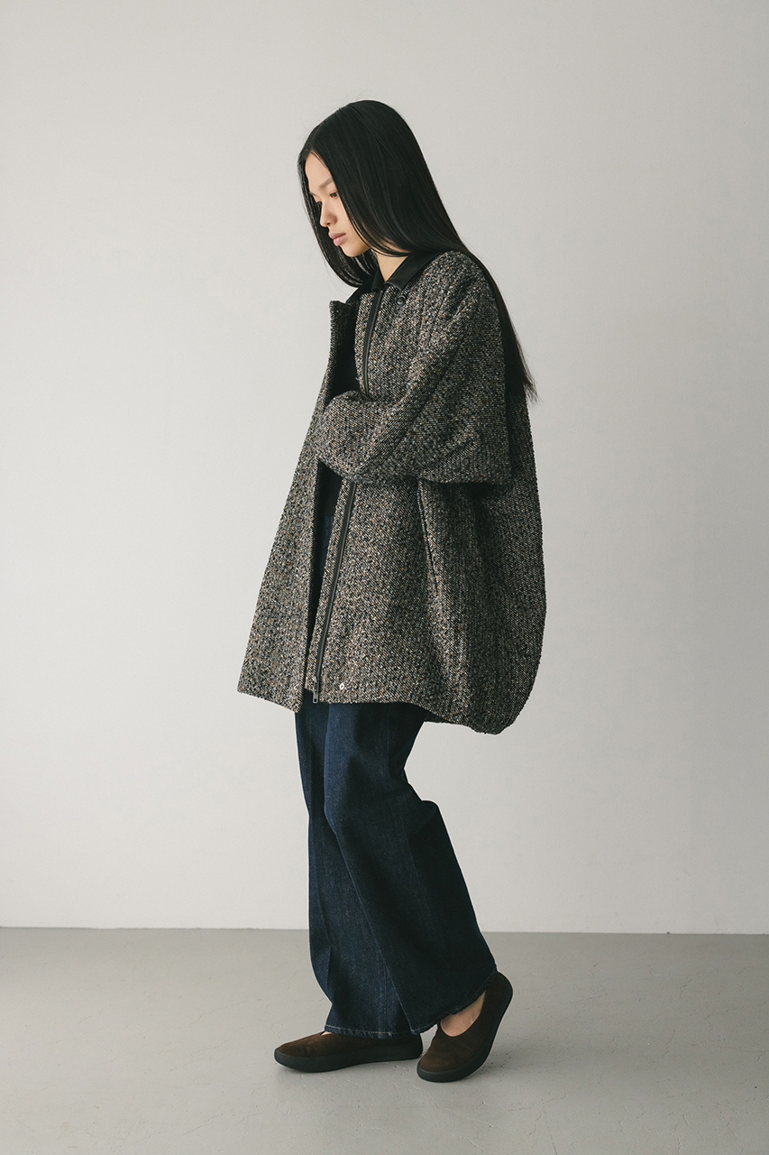 フェイクレザーの襟がポイントのツイードミディコート。タックを入れてこなれ感のあるフォルムに仕上げました。スタイリング変化を楽しめる逆開ファスナー仕様。透け感なし、ストレッチなし。