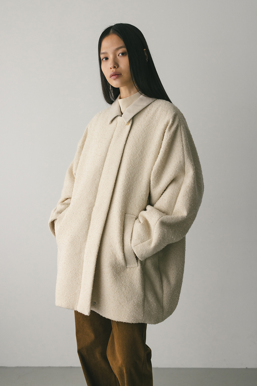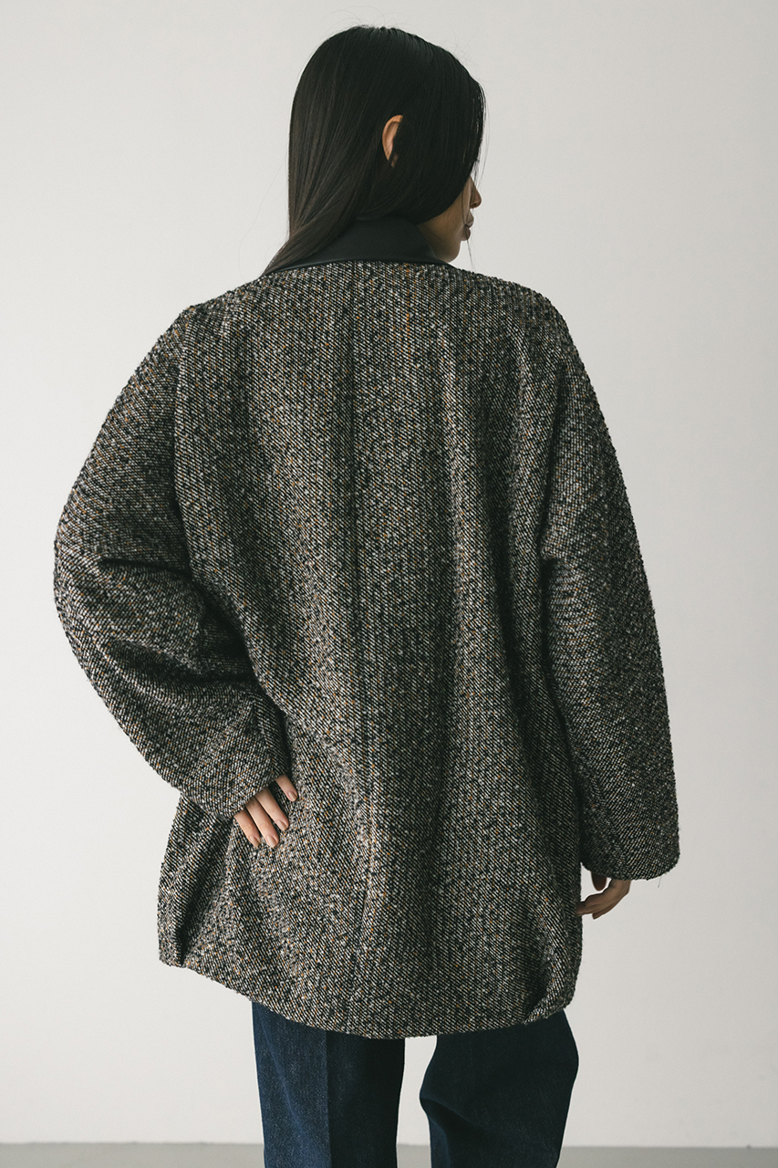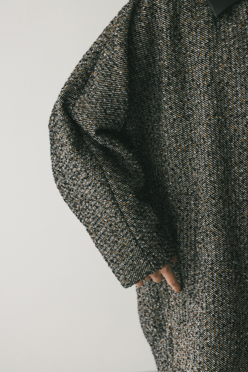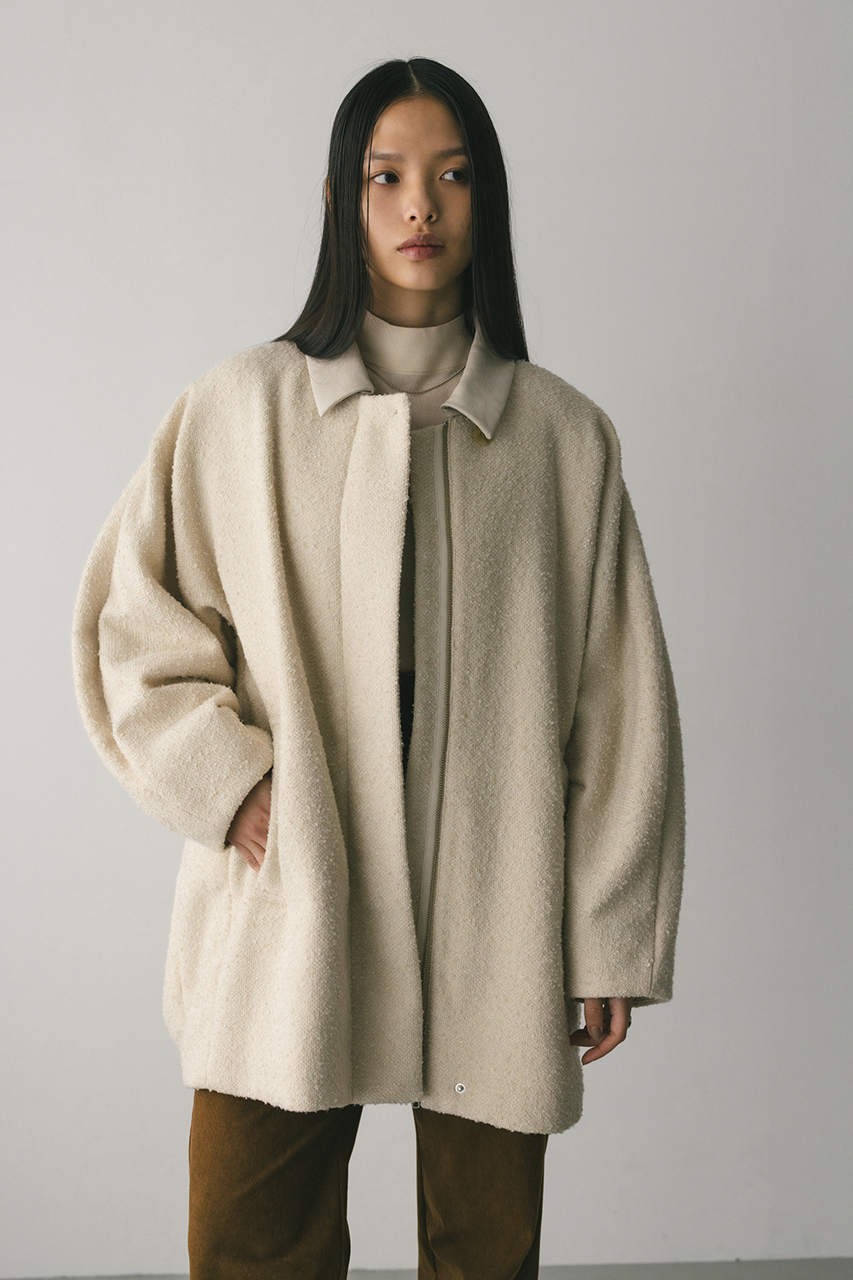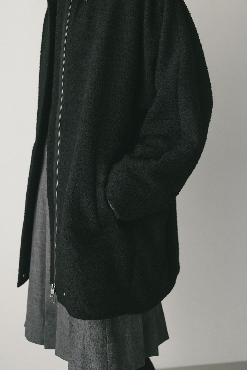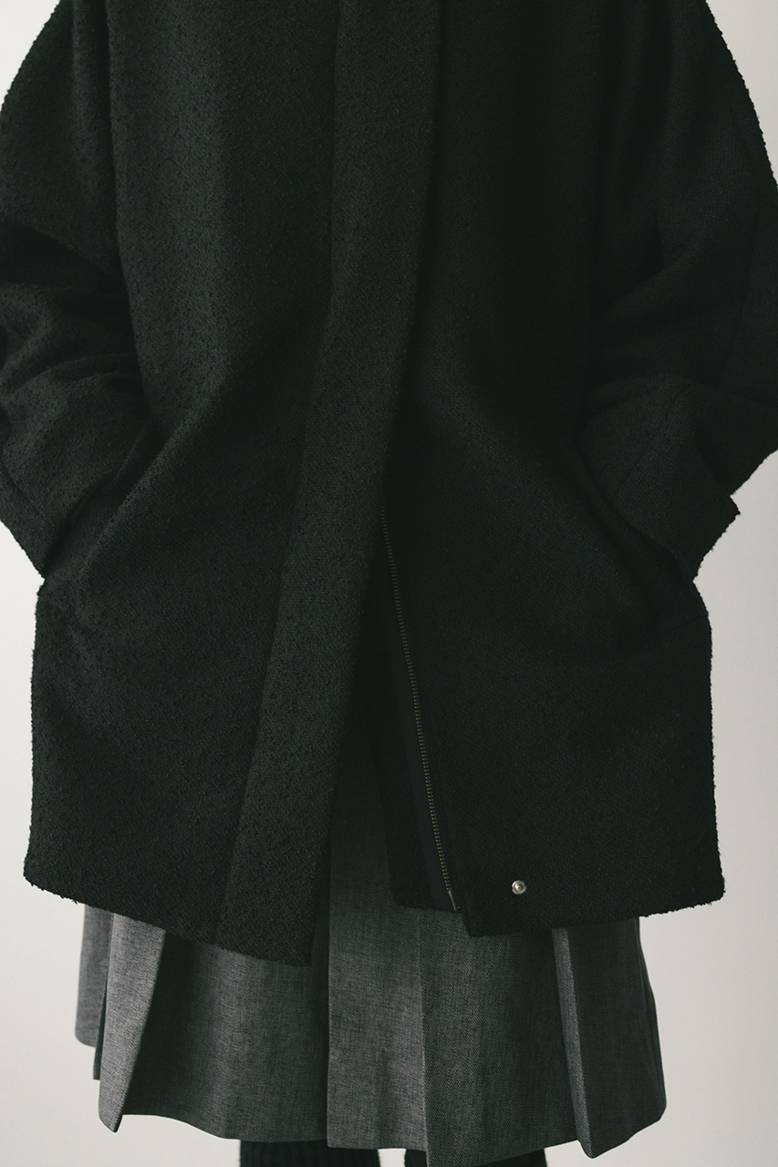 フェイクレザーの襟がポイントのツイードミディコート。タックを入れてこなれ感のあるフォルムに仕上げました。スタイリング変化を楽しめる逆開ファスナー仕様。透け感なし、ストレッチなし。