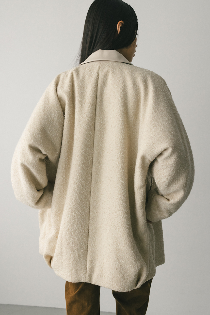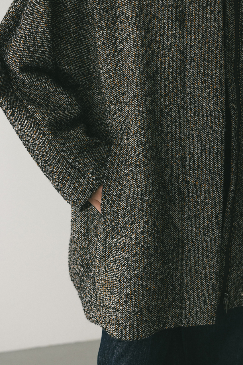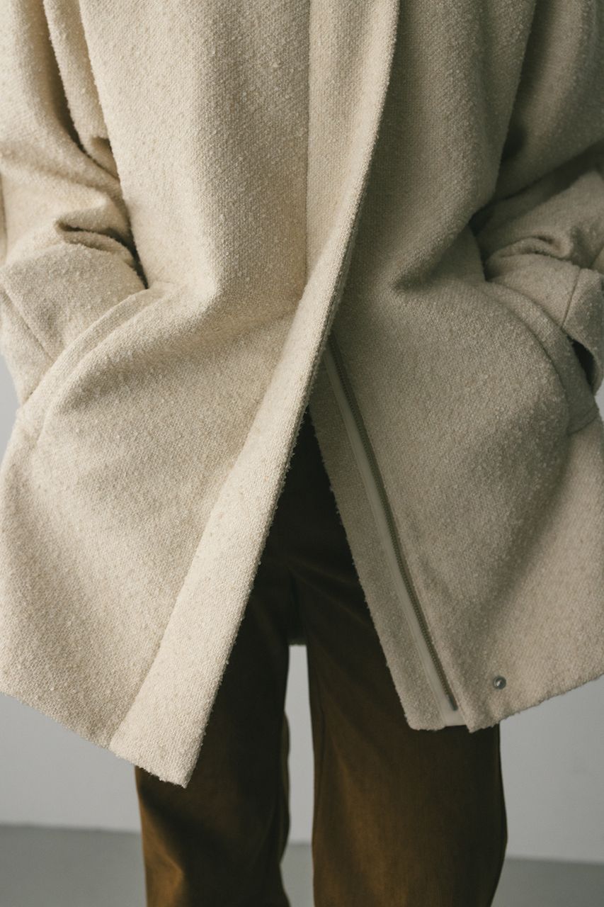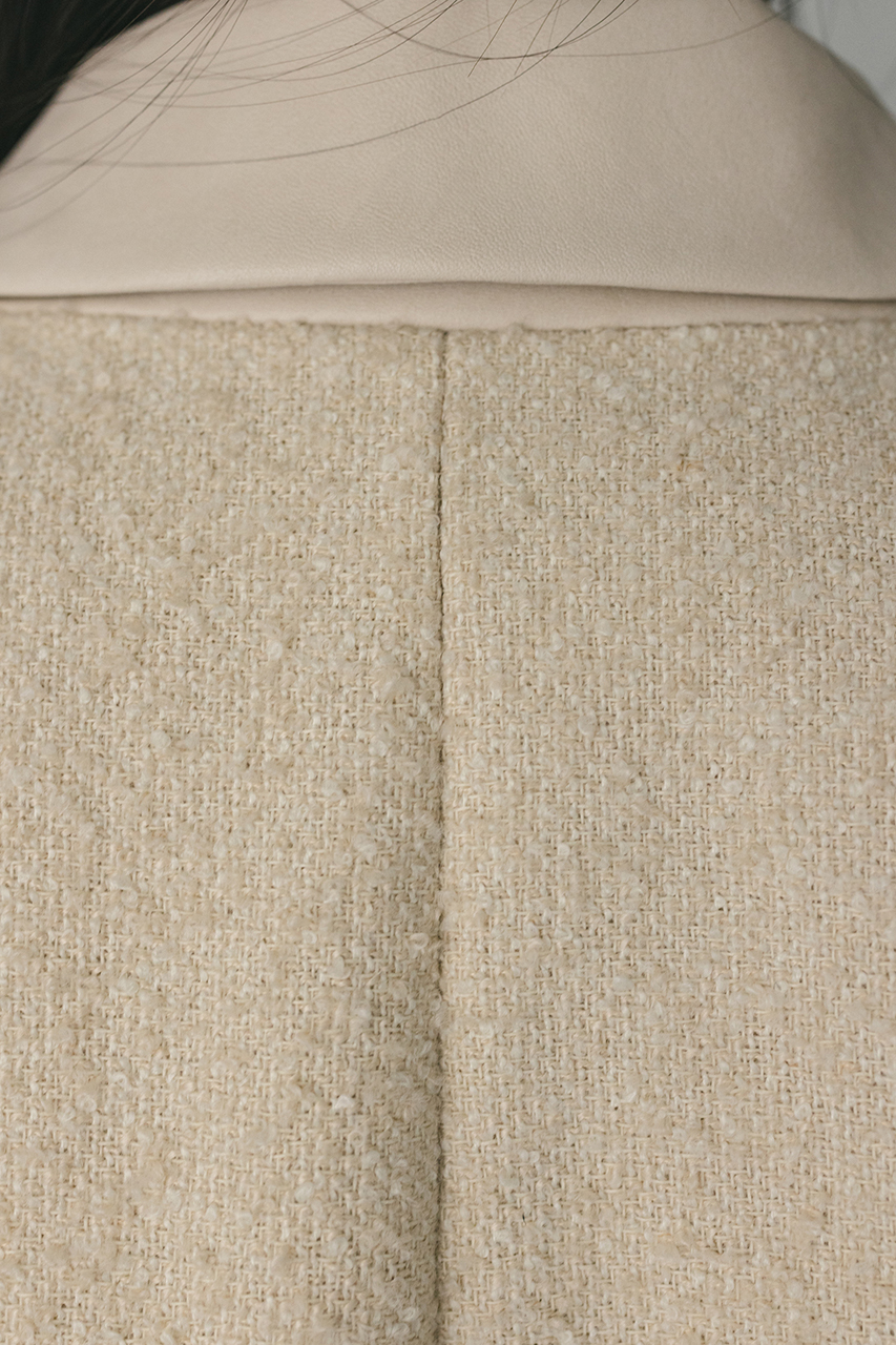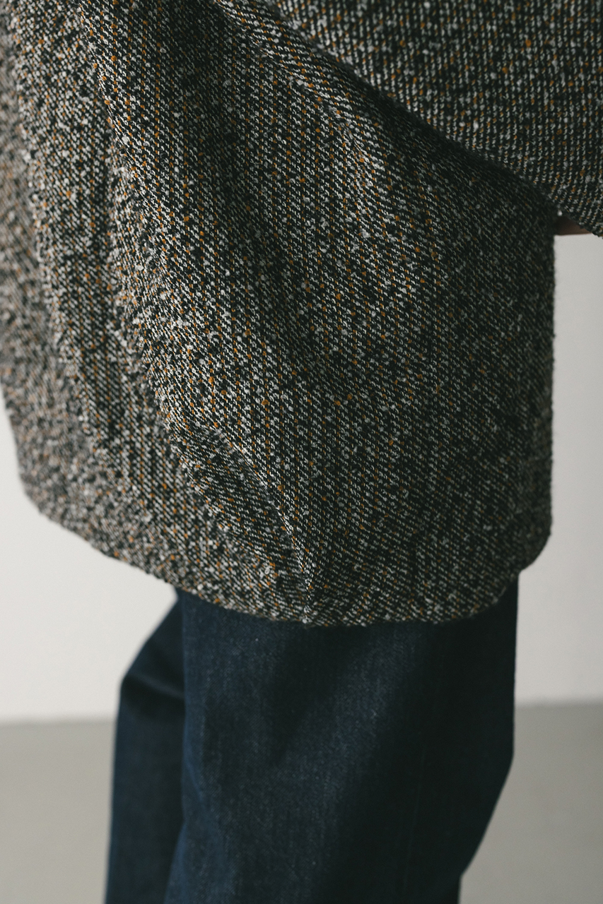 フェイクレザーの襟がポイントのツイードミディコート。タックを入れてこなれ感のあるフォルムに仕上げました。スタイリング変化を楽しめる逆開ファスナー仕様。透け感なし、ストレッチなし。