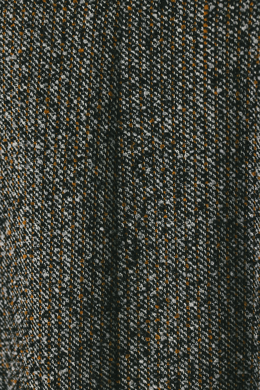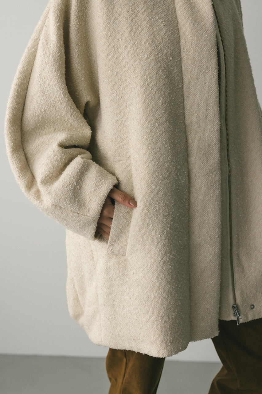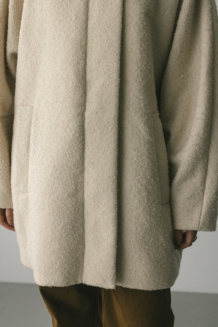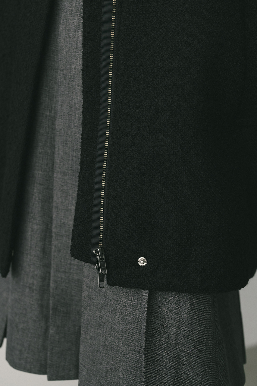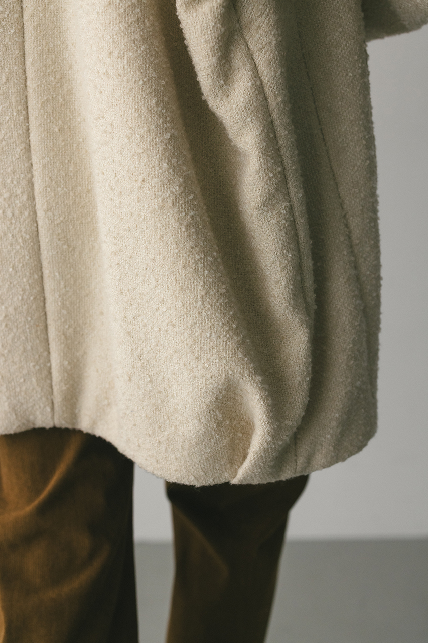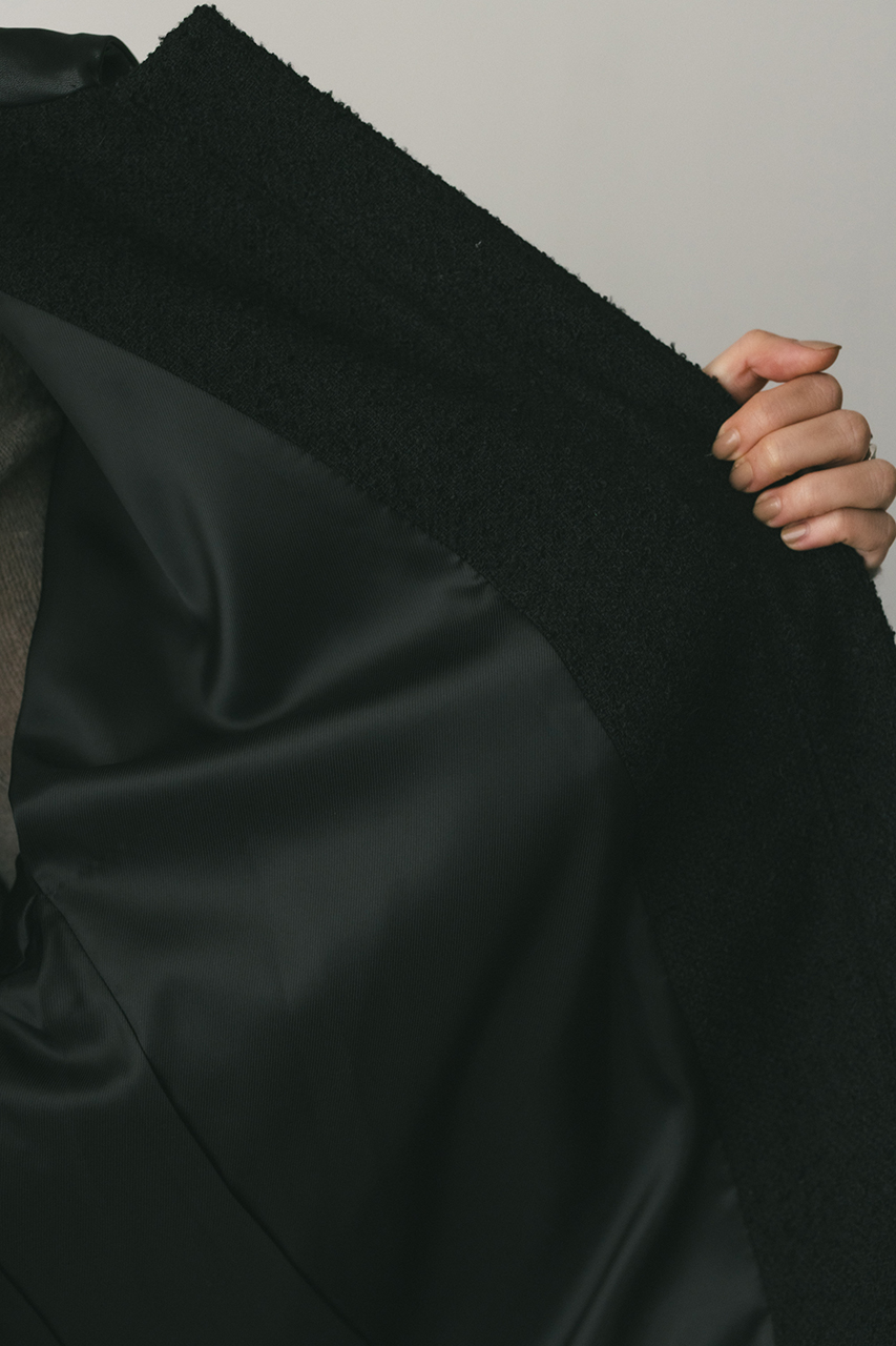 フェイクレザーの襟がポイントのツイードミディコート。タックを入れてこなれ感のあるフォルムに仕上げました。スタイリング変化を楽しめる逆開ファスナー仕様。透け感なし、ストレッチなし。