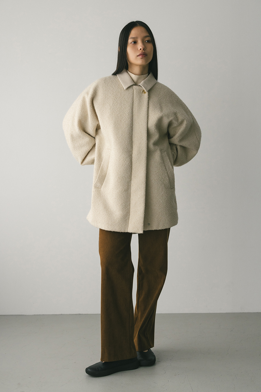 フェイクレザーの襟がポイントのツイードミディコート。タックを入れてこなれ感のあるフォルムに仕上げました。スタイリング変化を楽しめる逆開ファスナー仕様。透け感なし、ストレッチなし。