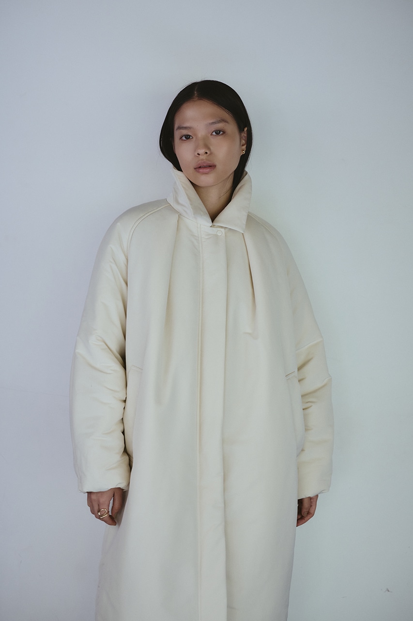 シンプルで使いやすい中綿ロングコート。こなれ感のあるサイジングと飽きのこないステンカラーデザインがポイント。タックデザインとフォルムスリーブがスタミキらしい一枚です。シワ感も気にせずモードカジュアルに着用頂けます。透け感なし、ストレッチなし。
