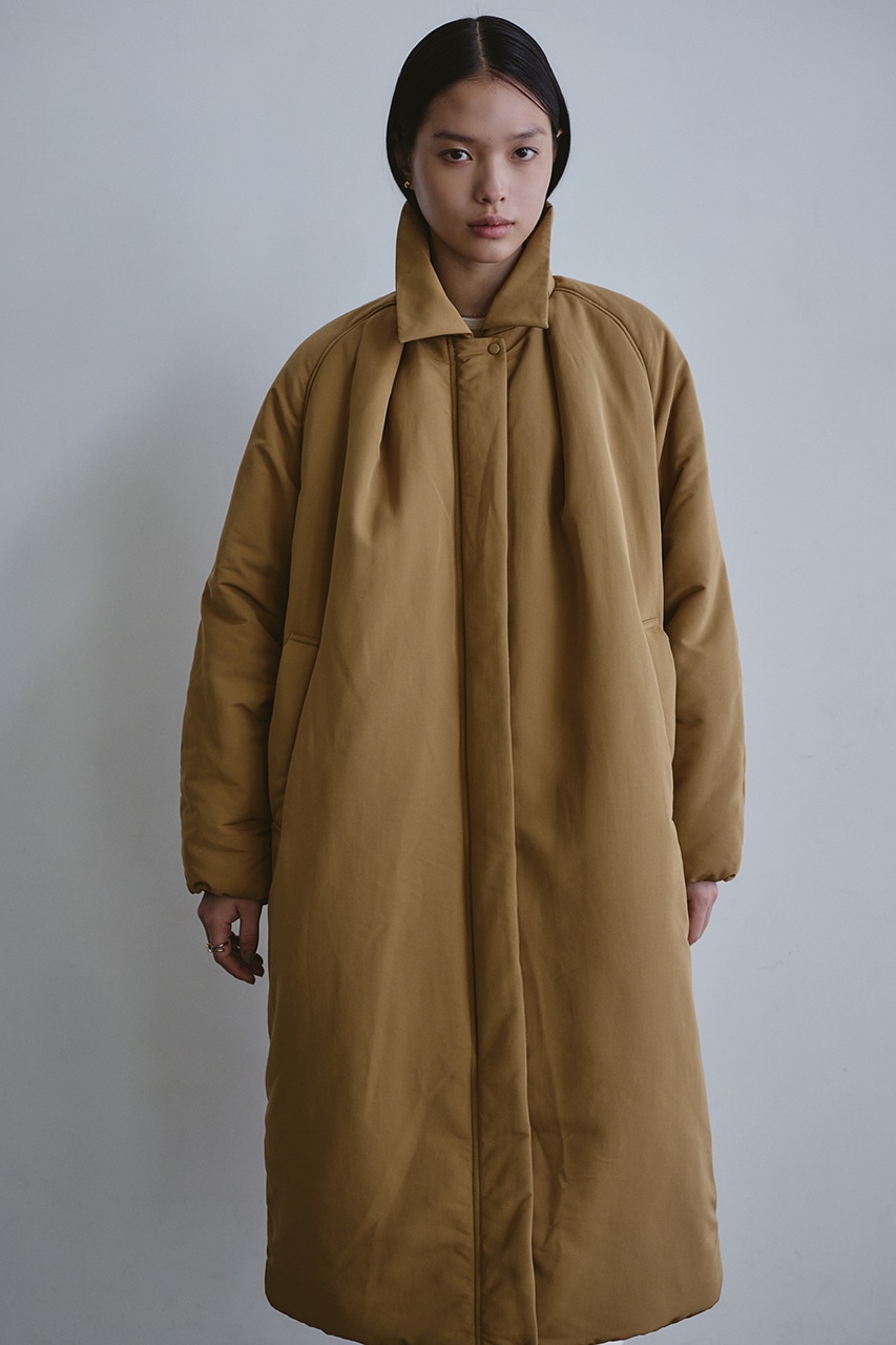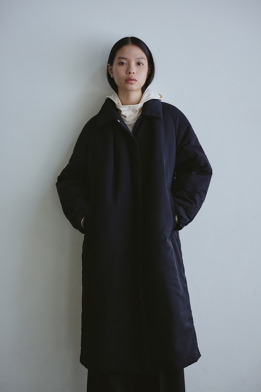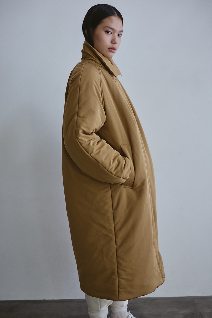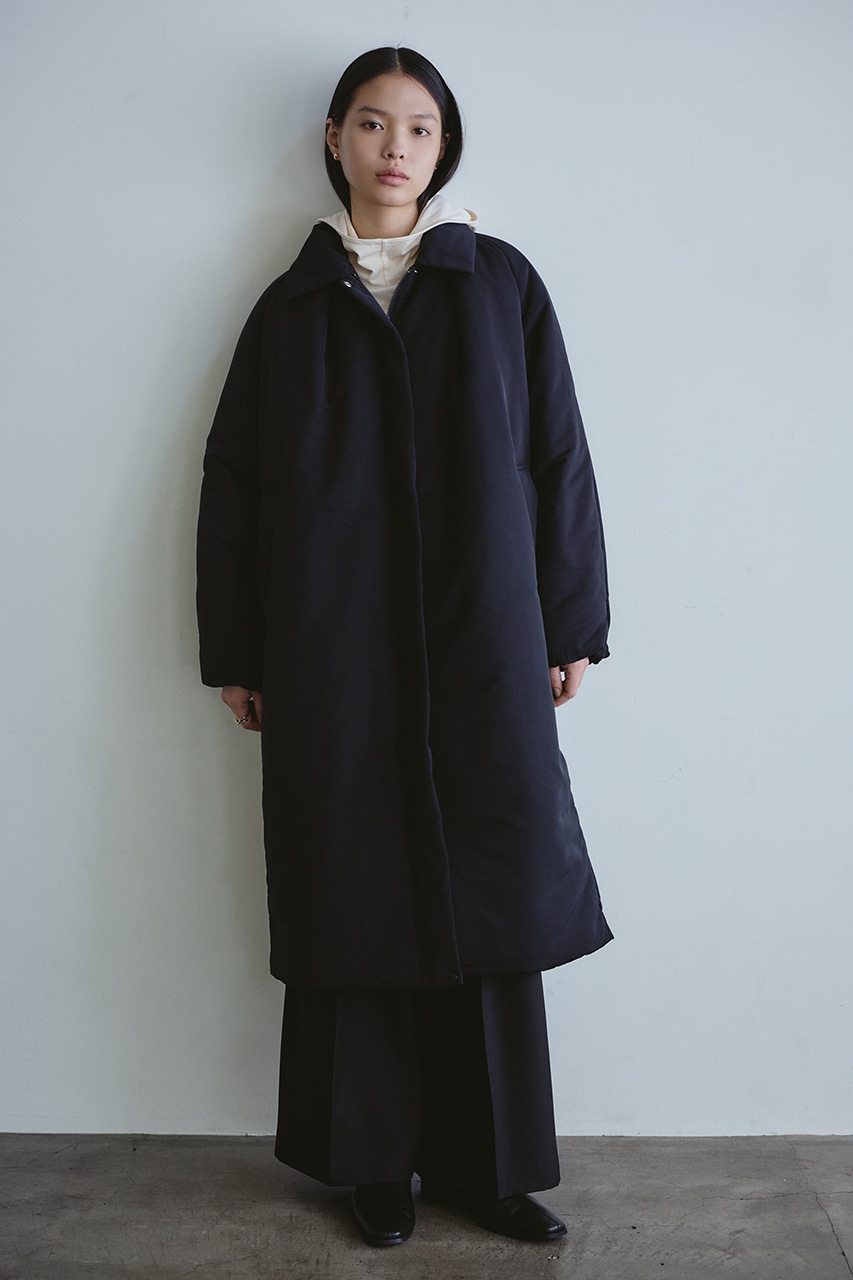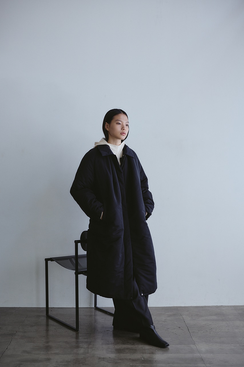 シンプルで使いやすい中綿ロングコート。こなれ感のあるサイジングと飽きのこないステンカラーデザインがポイント。タックデザインとフォルムスリーブがスタミキらしい一枚です。シワ感も気にせずモードカジュアルに着用頂けます。透け感なし、ストレッチなし。