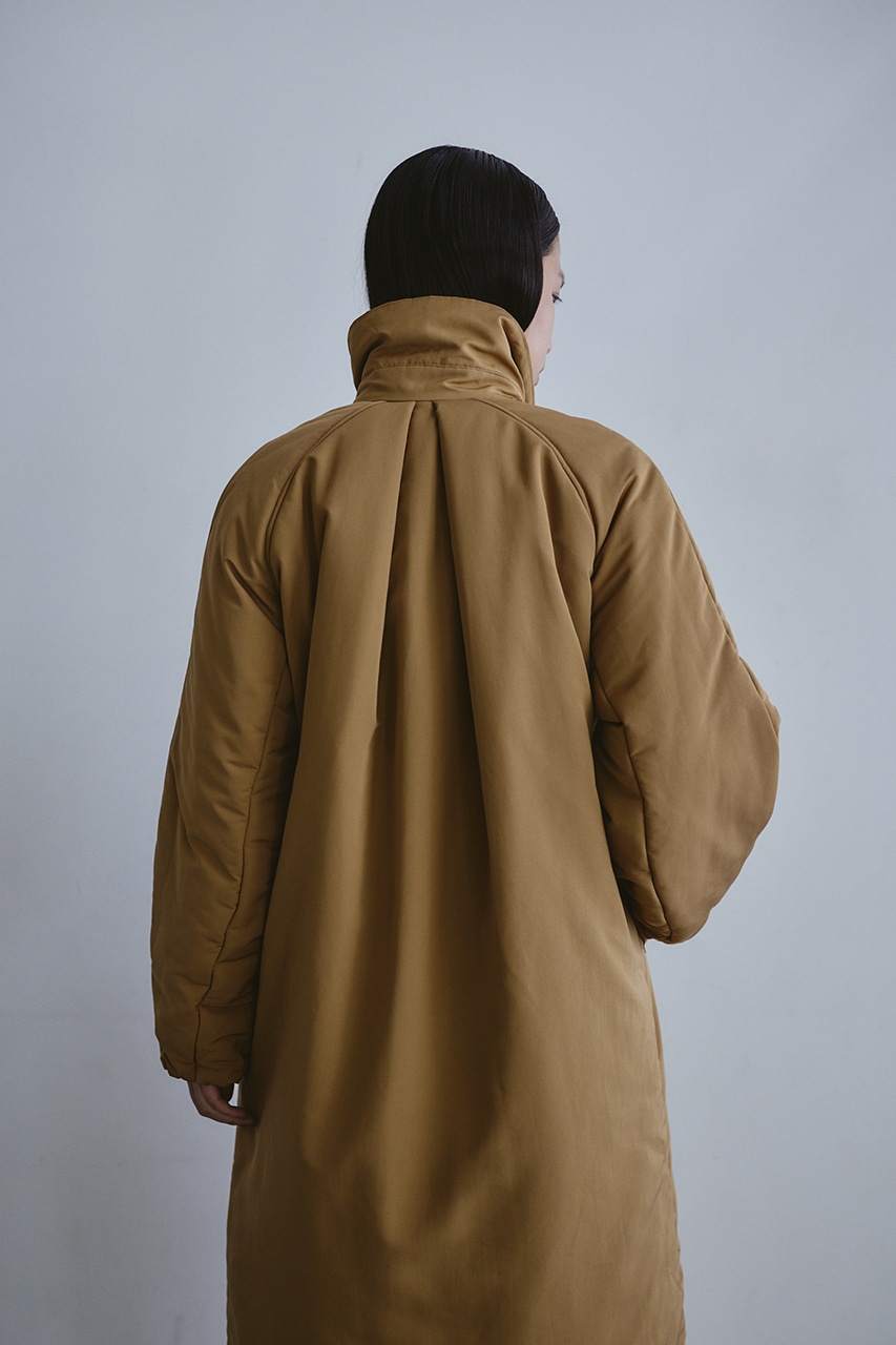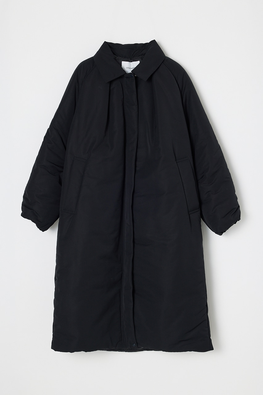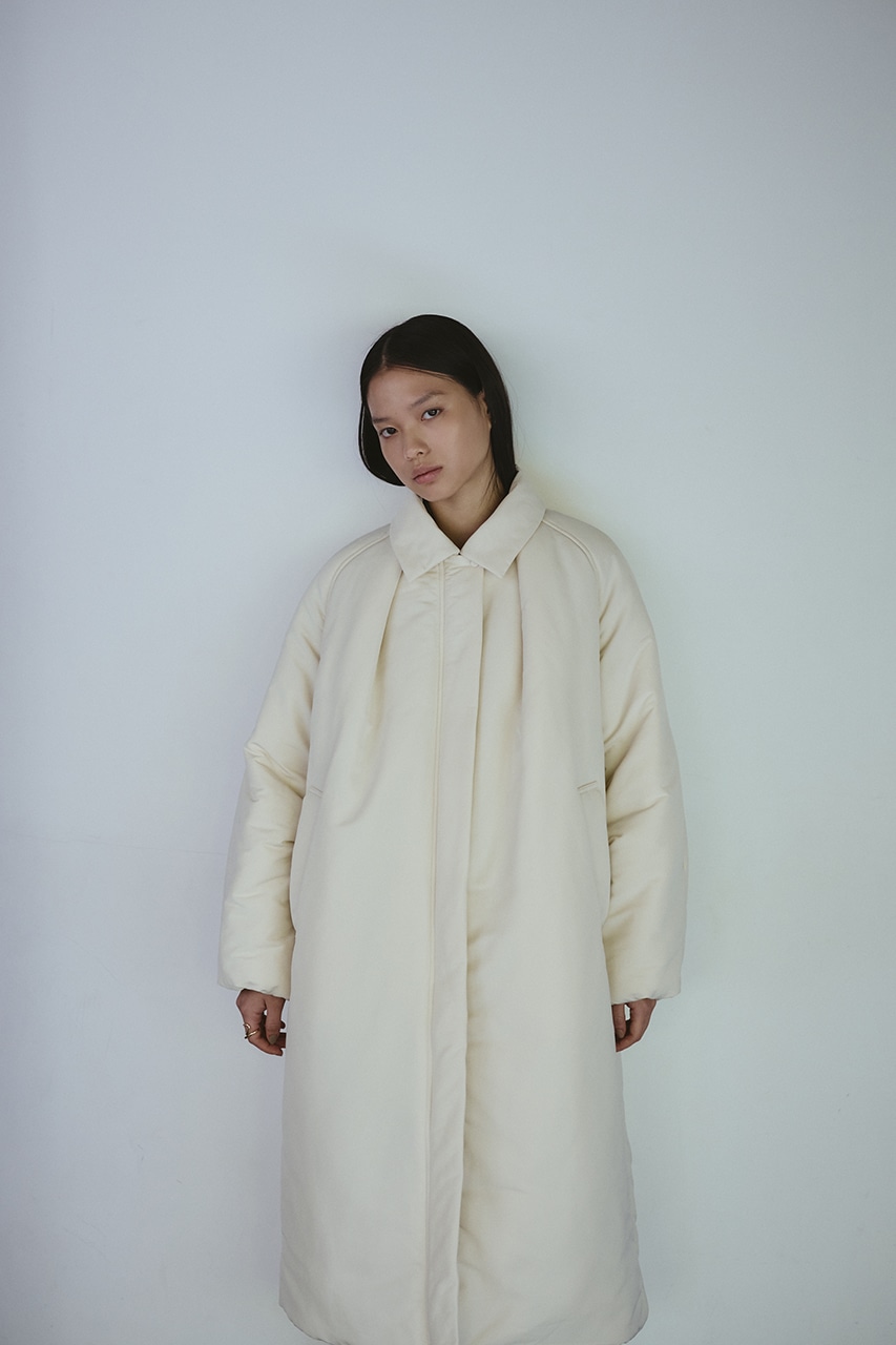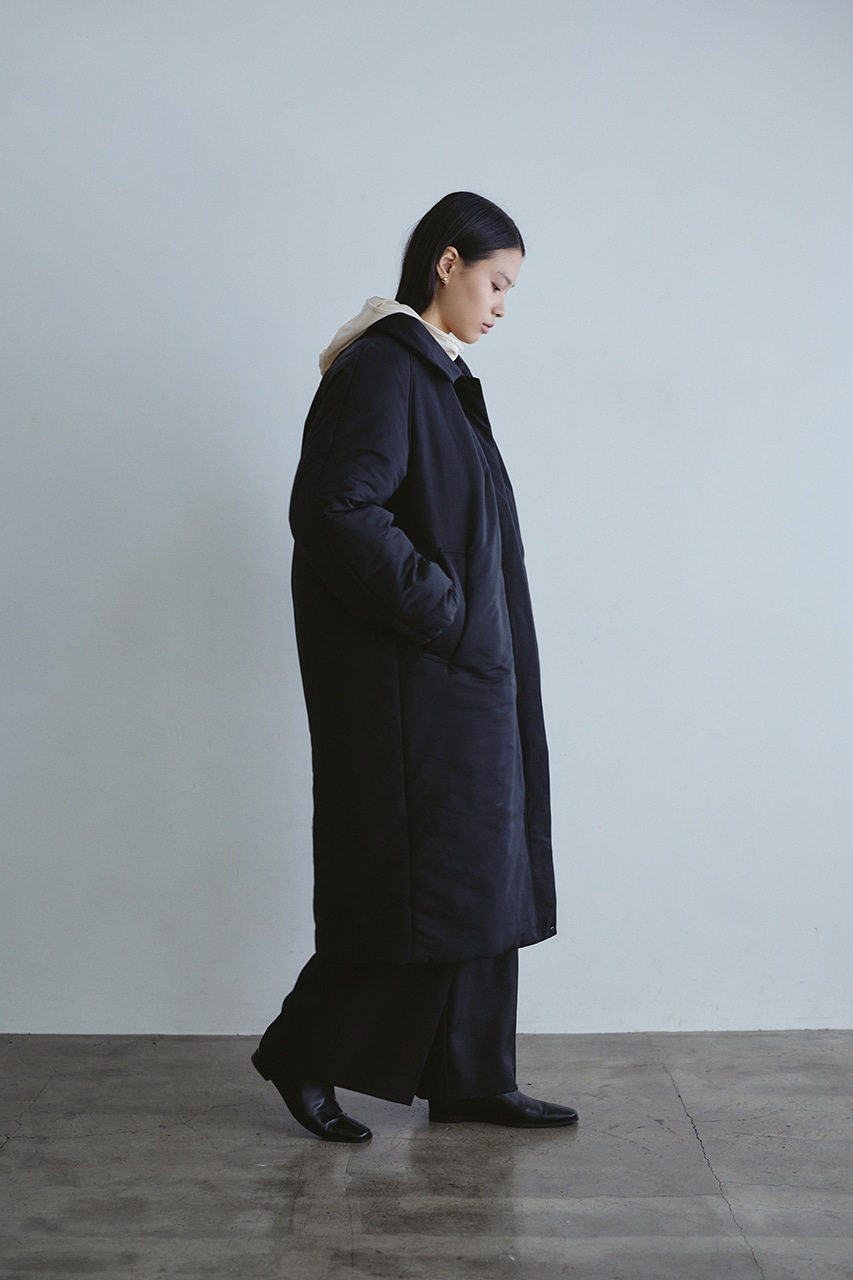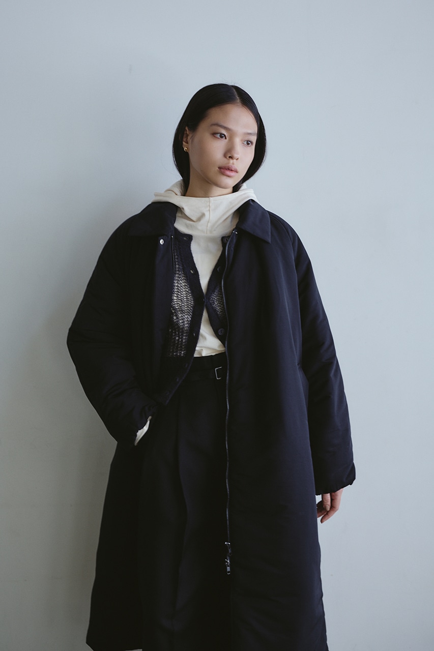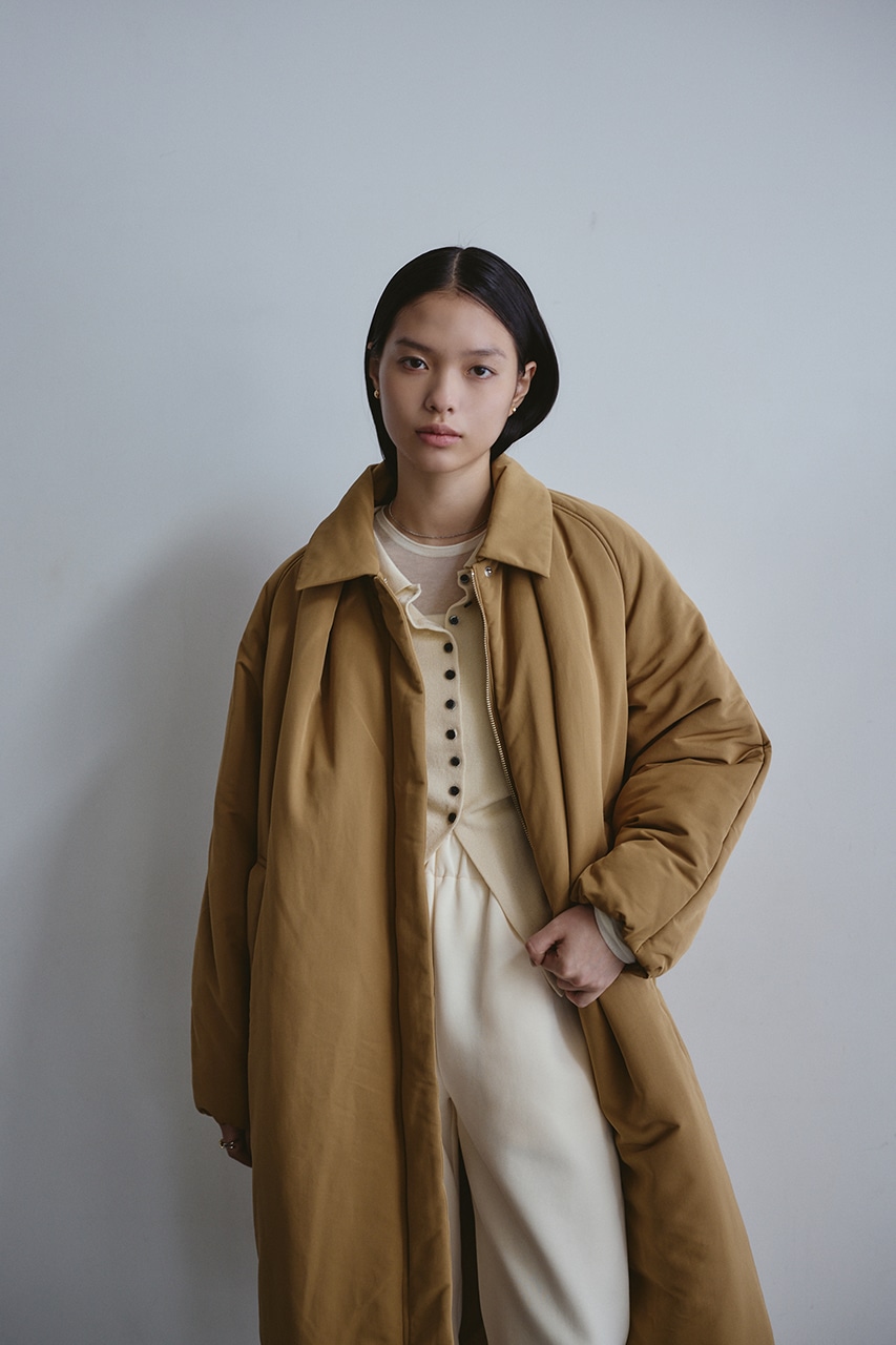 シンプルで使いやすい中綿ロングコート。こなれ感のあるサイジングと飽きのこないステンカラーデザインがポイント。タックデザインとフォルムスリーブがスタミキらしい一枚です。シワ感も気にせずモードカジュアルに着用頂けます。透け感なし、ストレッチなし。