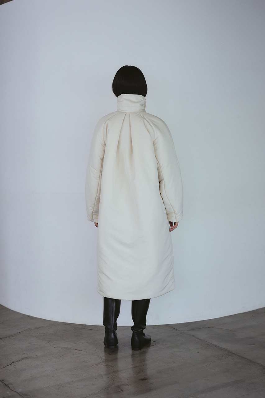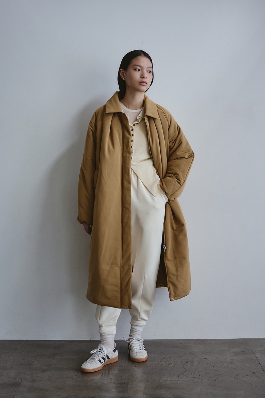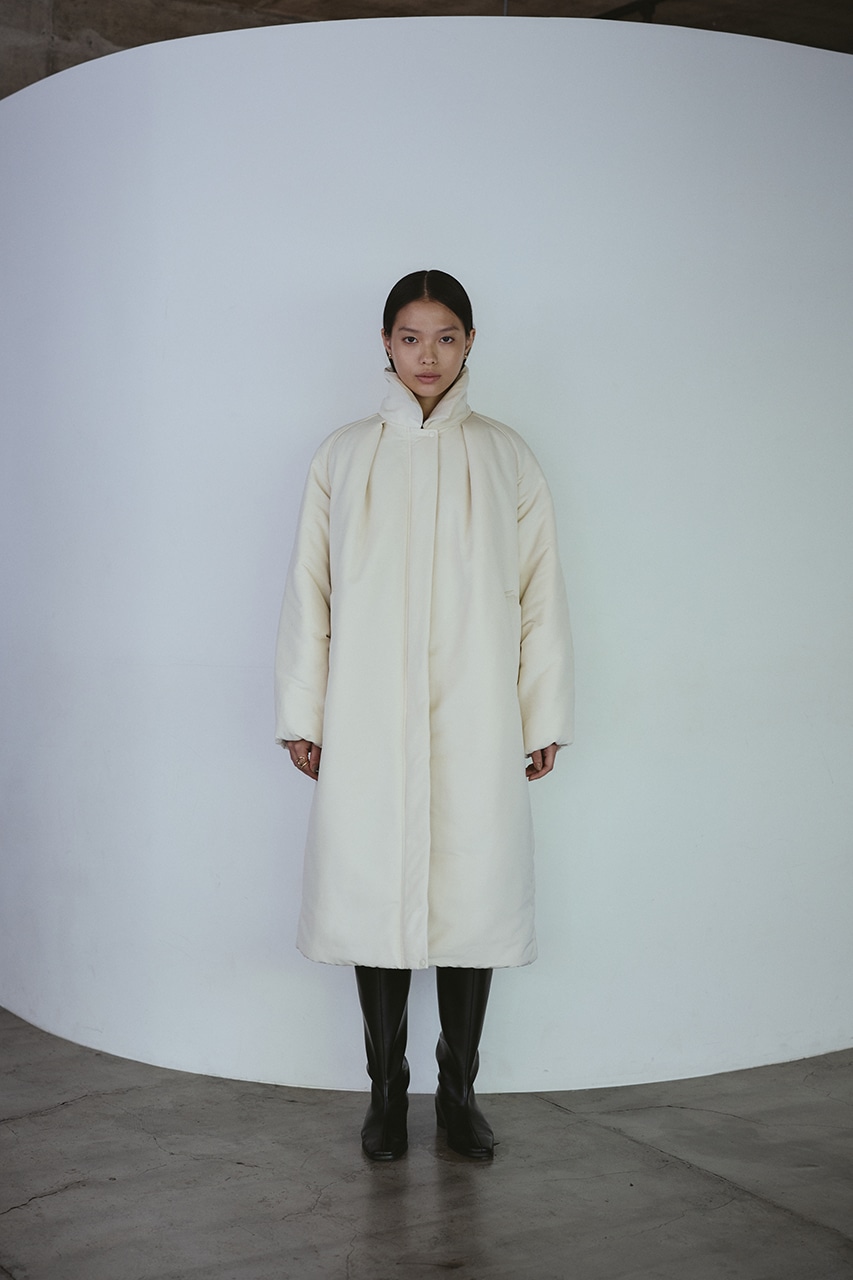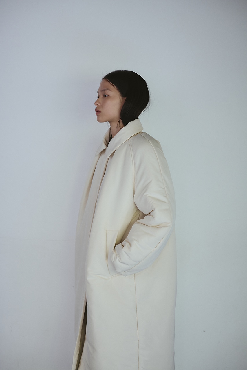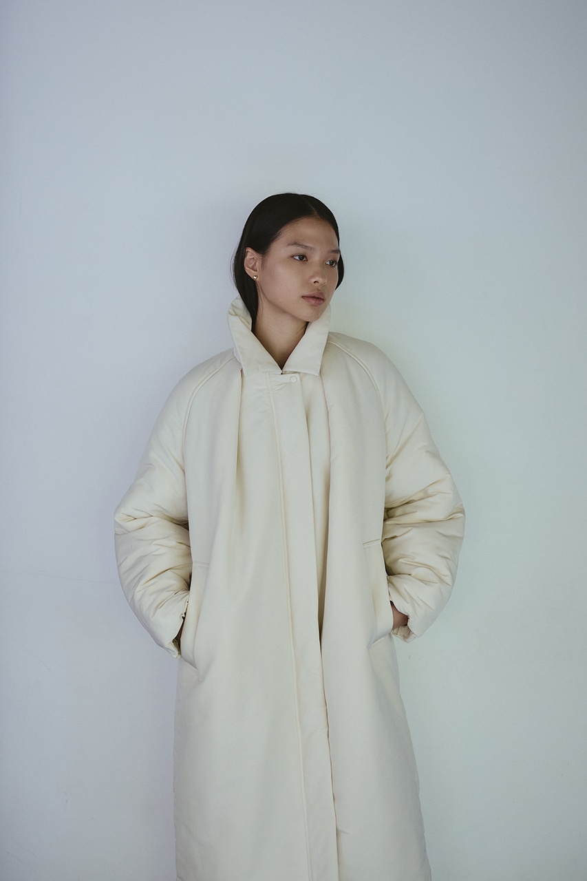 シンプルで使いやすい中綿ロングコート。こなれ感のあるサイジングと飽きのこないステンカラーデザインがポイント。タックデザインとフォルムスリーブがスタミキらしい一枚です。シワ感も気にせずモードカジュアルに着用頂けます。透け感なし、ストレッチなし。