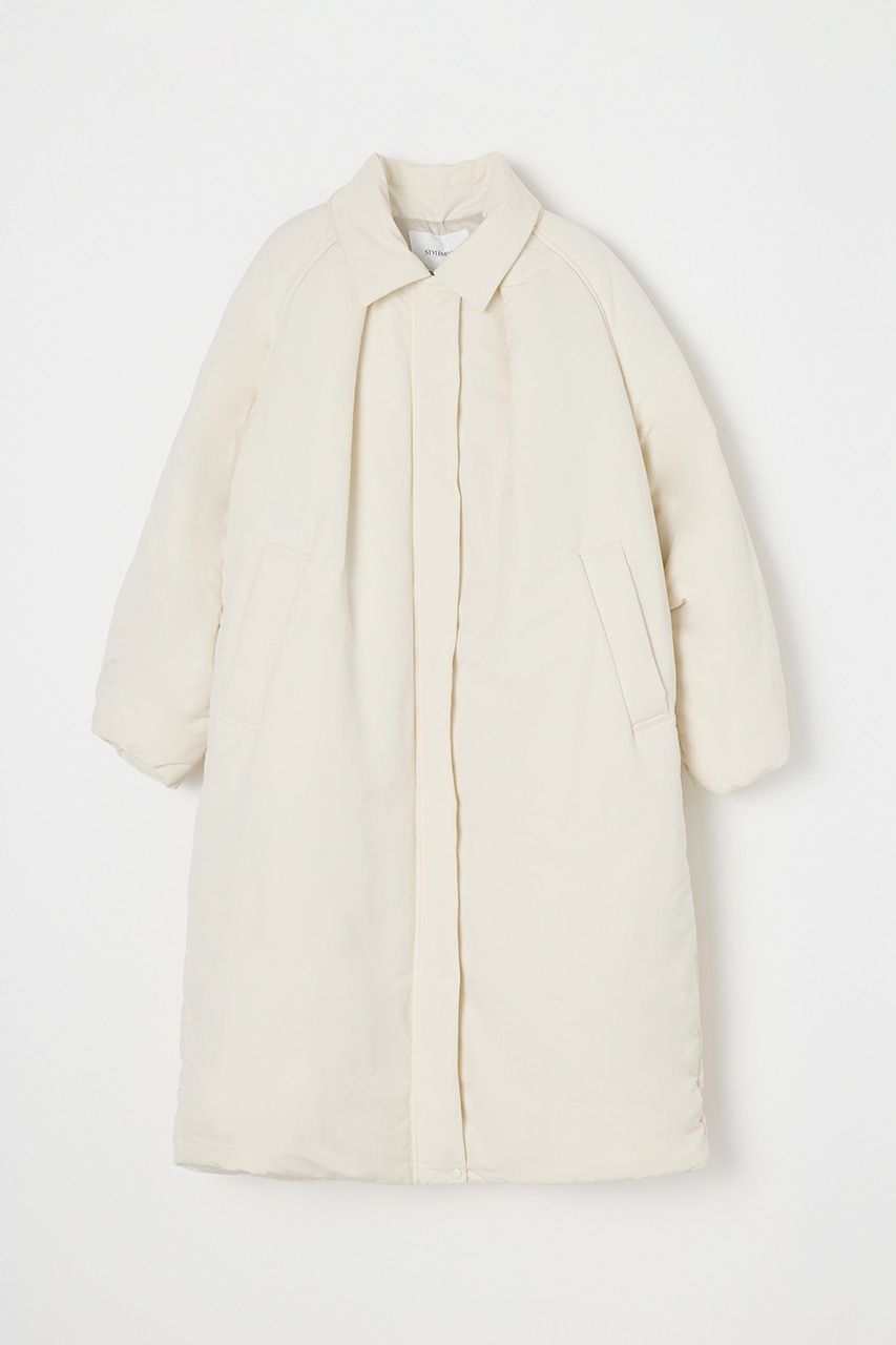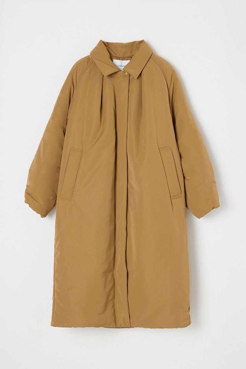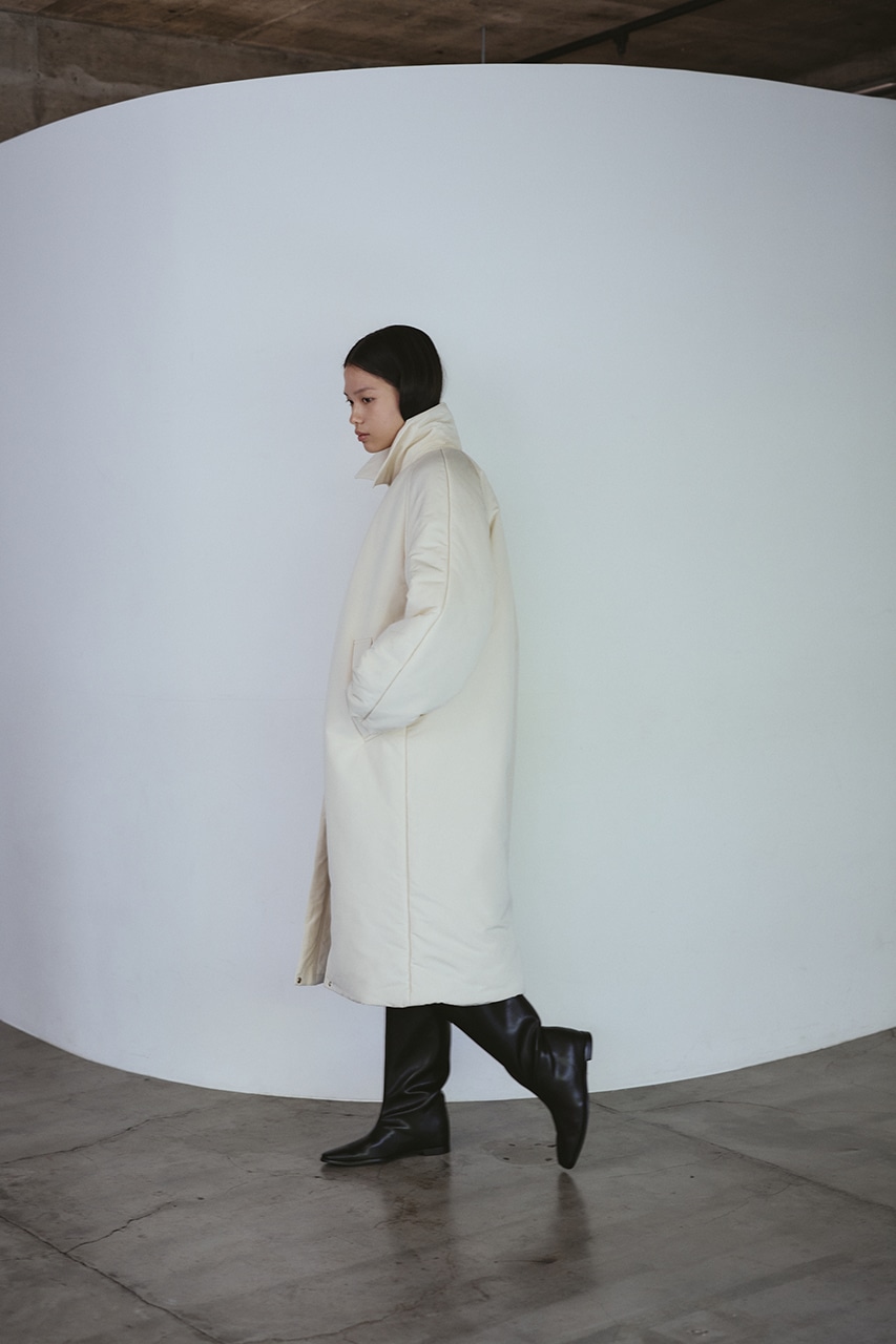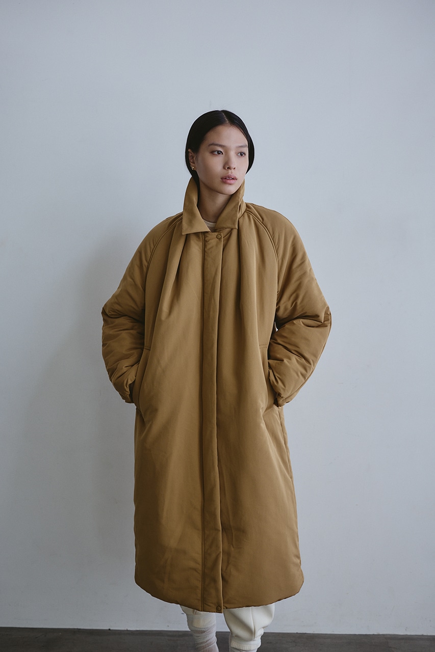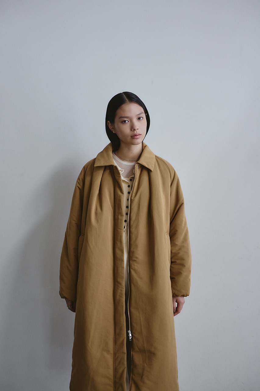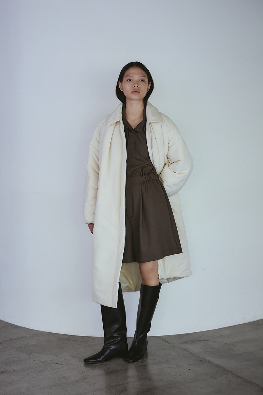 シンプルで使いやすい中綿ロングコート。こなれ感のあるサイジングと飽きのこないステンカラーデザインがポイント。タックデザインとフォルムスリーブがスタミキらしい一枚です。シワ感も気にせずモードカジュアルに着用頂けます。透け感なし、ストレッチなし。