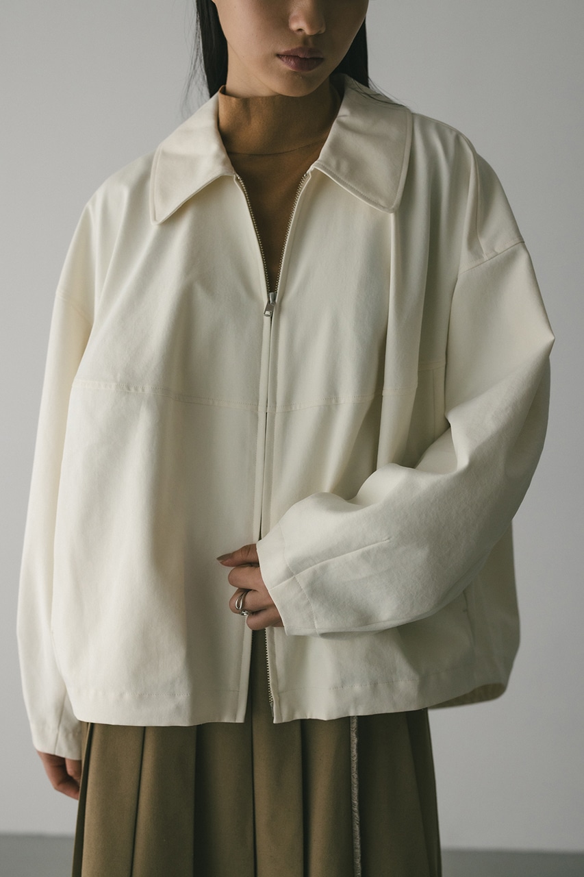 小顔見えする抜け感あるビッグカラーがポイントのカーブフォルムブルゾン。カジュアルにも綺麗めにもはまる凹凸感のある高見え素材を使用。ドライな質感でロングシーズン着用頂けます。スタイリング幅の広がる逆開ファスナー仕様。ストレッチなし、透け感なし。