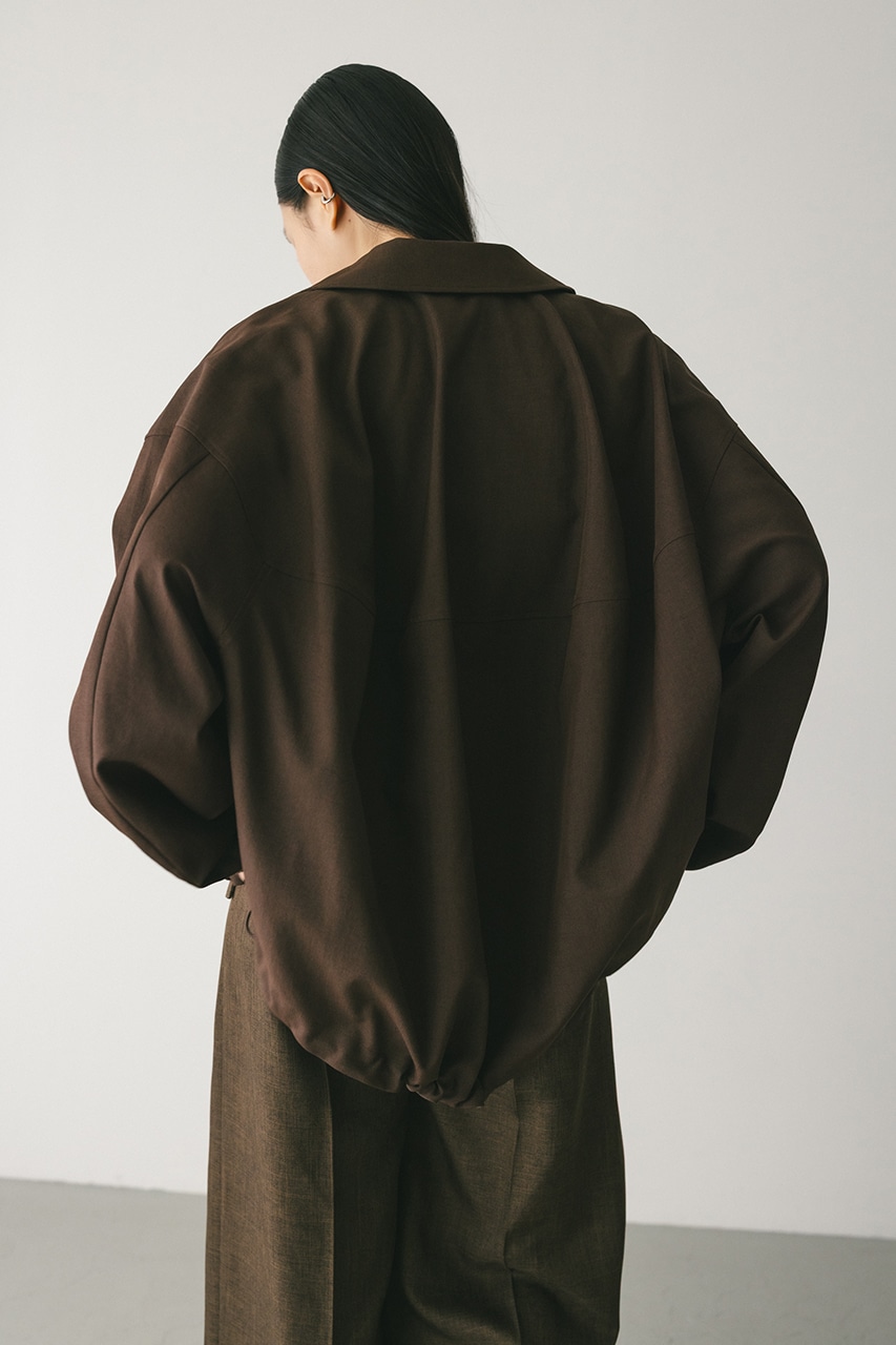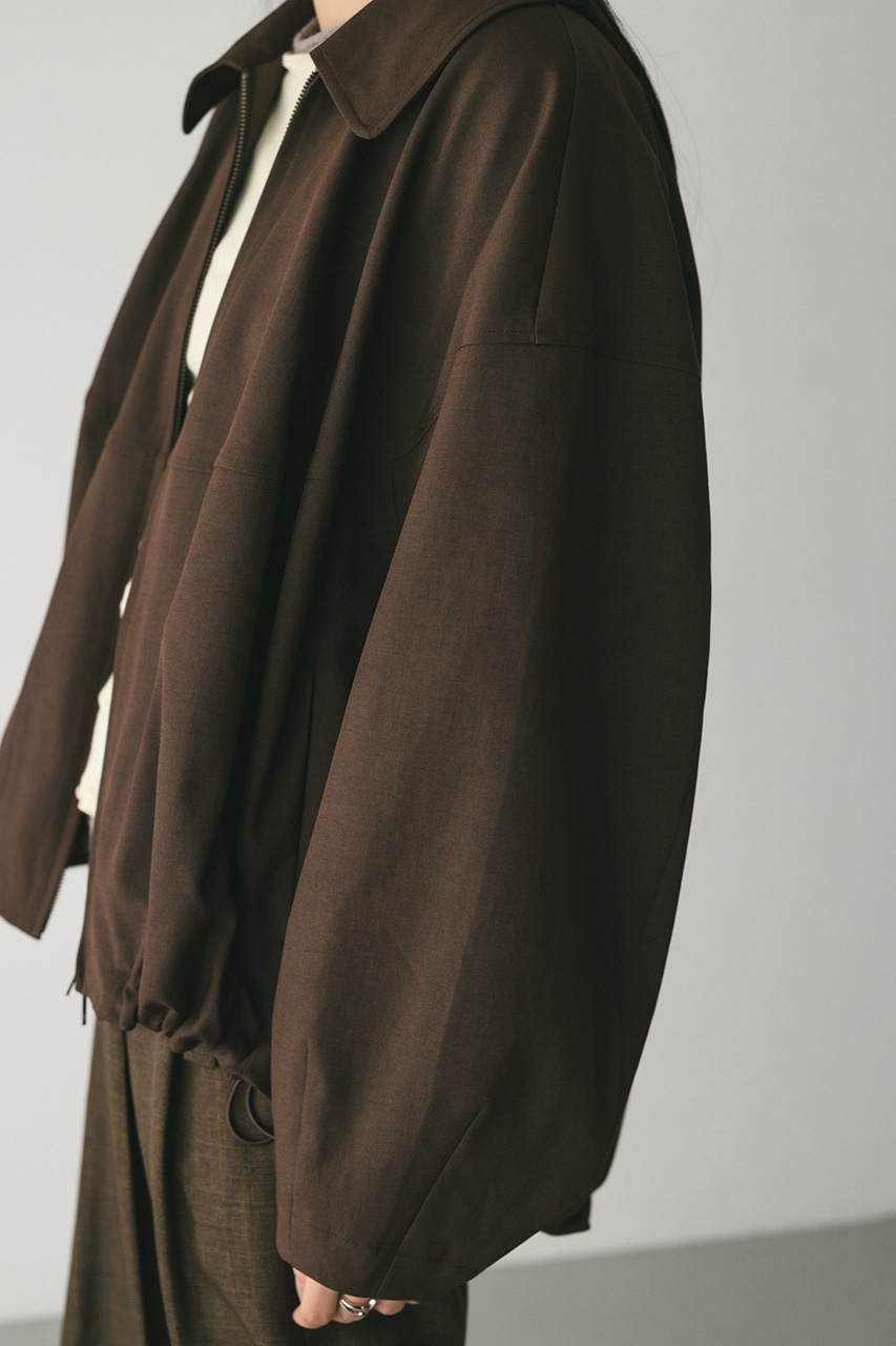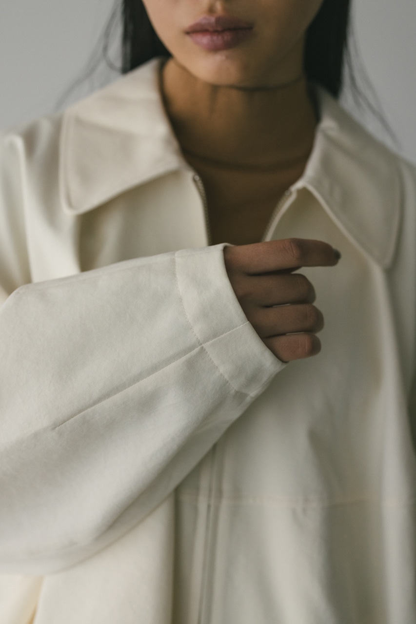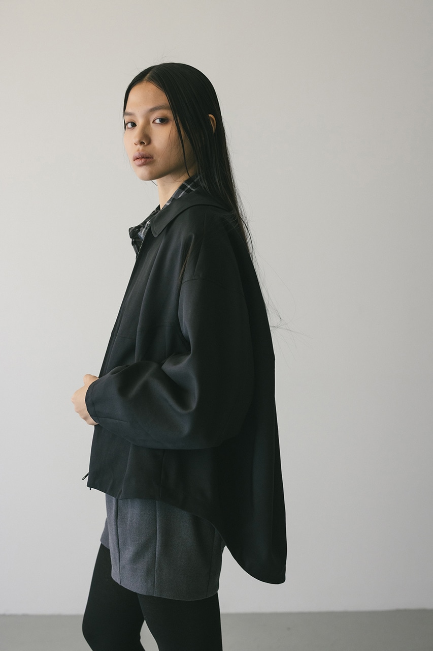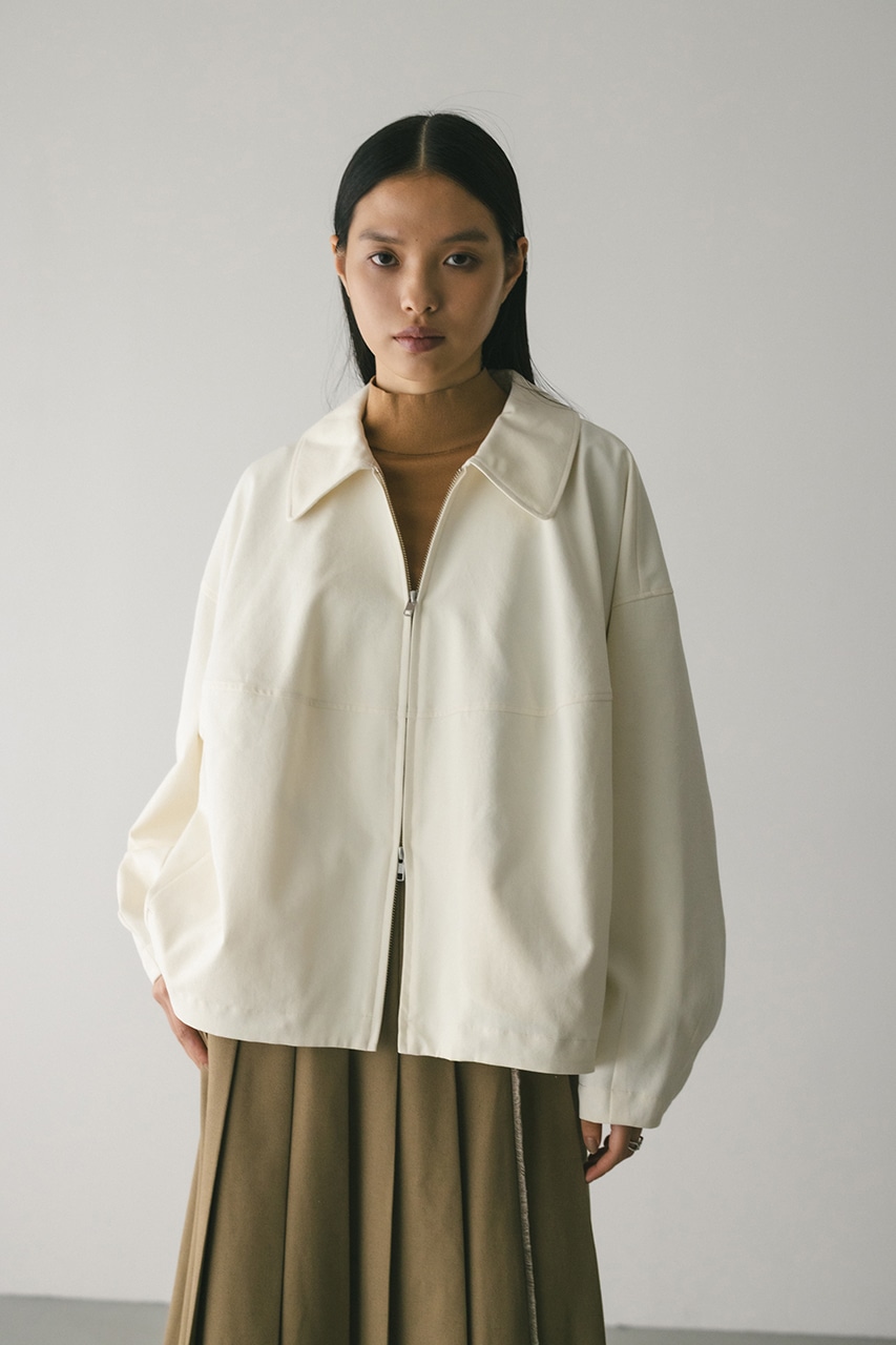 小顔見えする抜け感あるビッグカラーがポイントのカーブフォルムブルゾン。カジュアルにも綺麗めにもはまる凹凸感のある高見え素材を使用。ドライな質感でロングシーズン着用頂けます。スタイリング幅の広がる逆開ファスナー仕様。ストレッチなし、透け感なし。