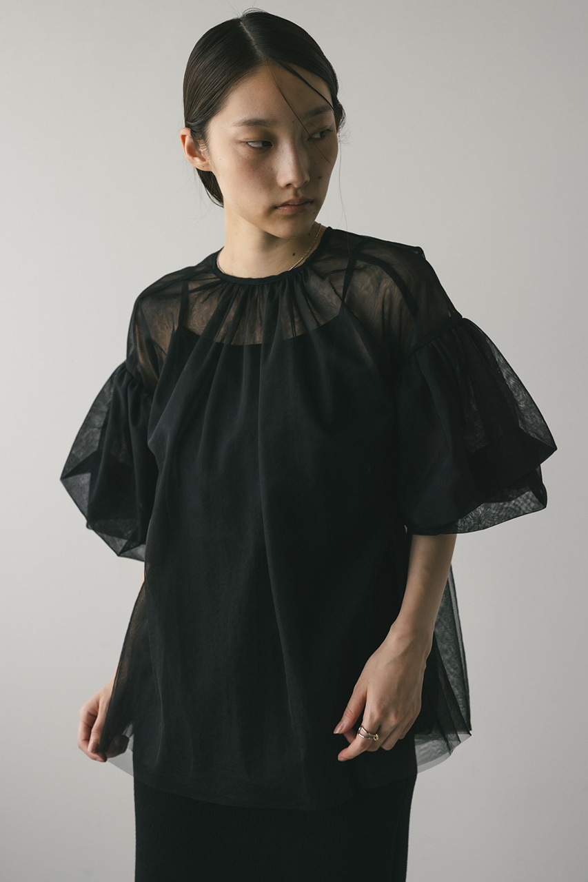 タッキング袖が可愛いシアーチュールブラウスとゆるめのカットソーキャミソールのセットトップス。チュール2枚重ねが作るニュアンスで華やかに映える一枚。インもアウトもしやすく、ボトムスを選ばず着用頂けます。透け感あり、ストレッチあり。