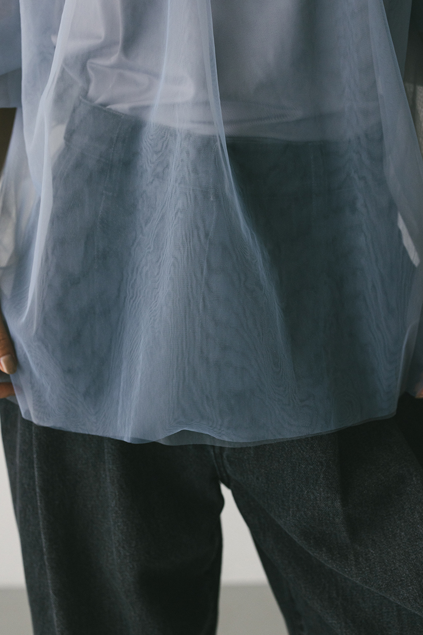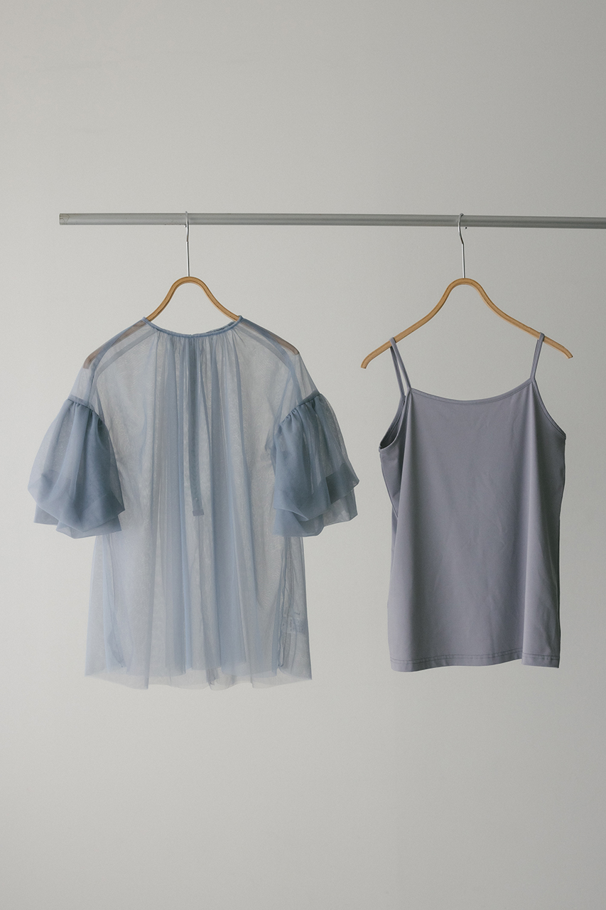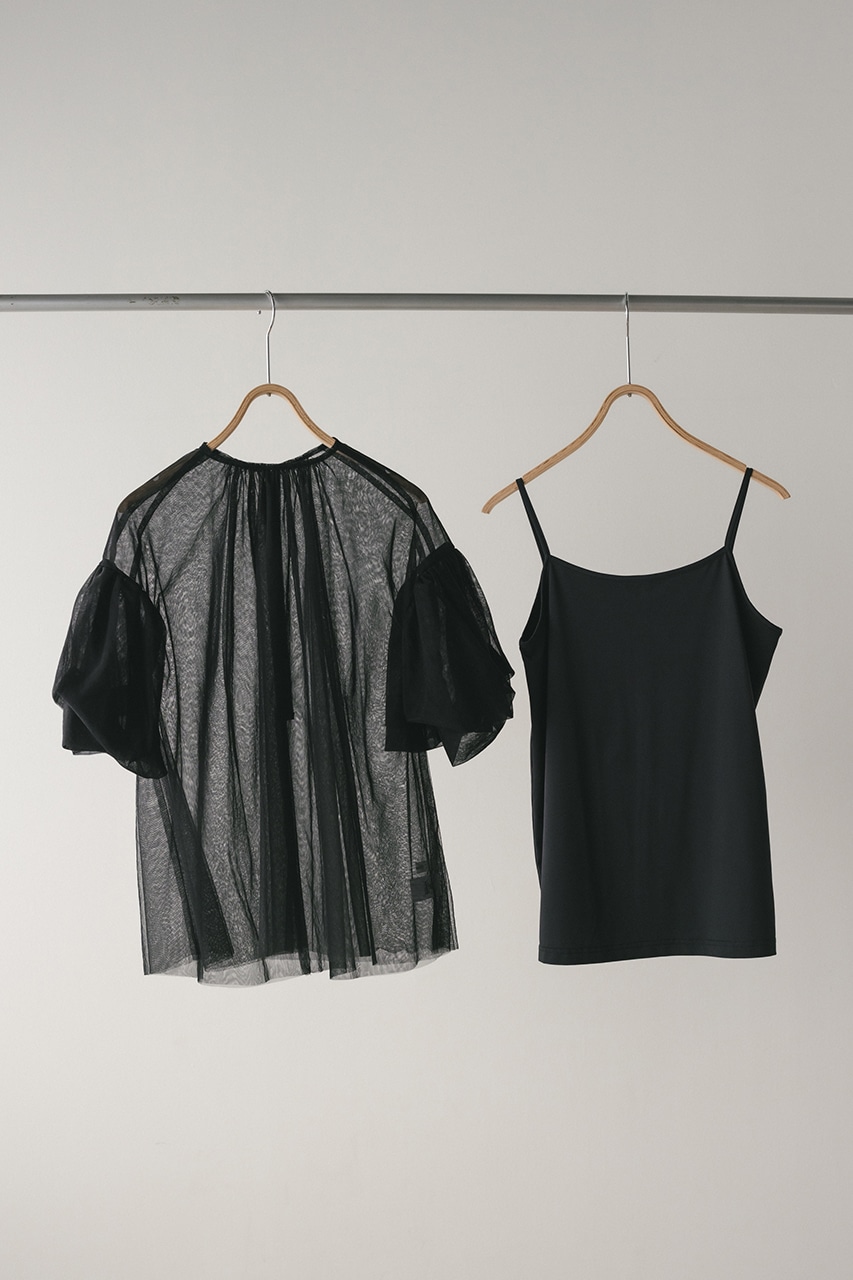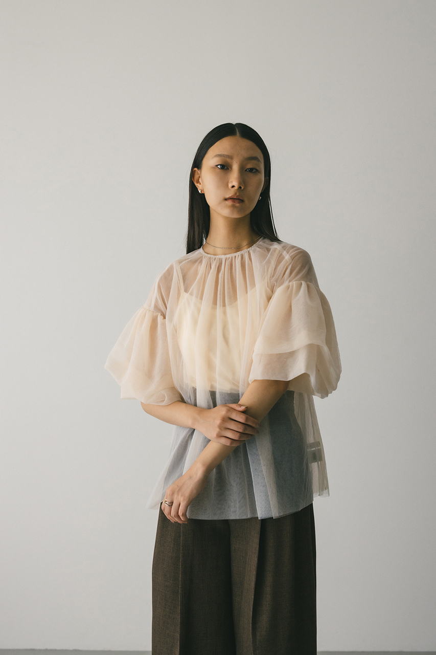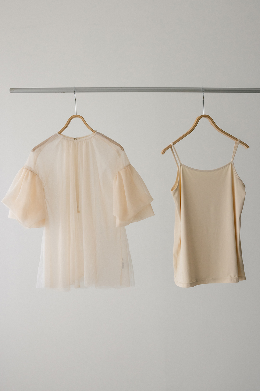 タッキング袖が可愛いシアーチュールブラウスとゆるめのカットソーキャミソールのセットトップス。チュール2枚重ねが作るニュアンスで華やかに映える一枚。インもアウトもしやすく、ボトムスを選ばず着用頂けます。透け感あり、ストレッチあり。