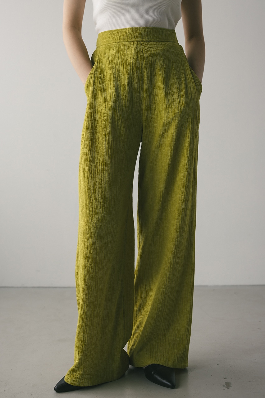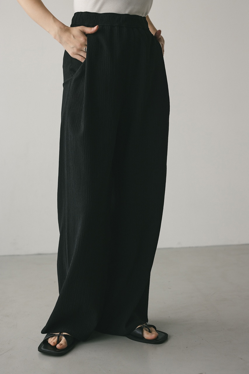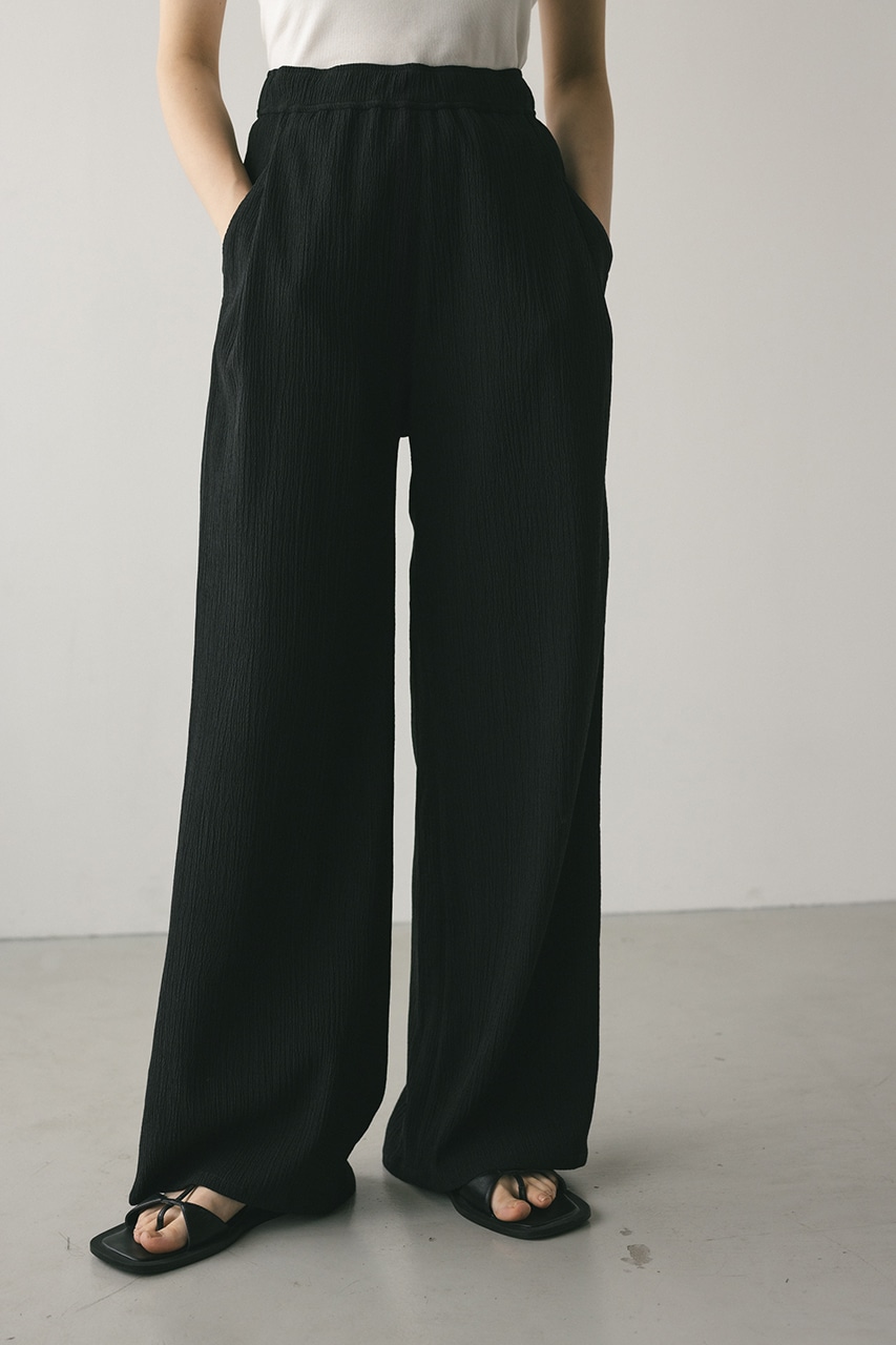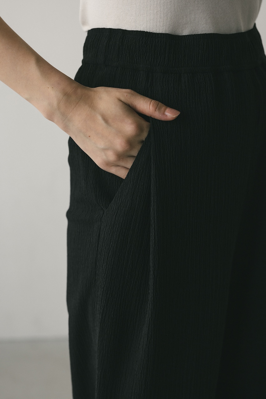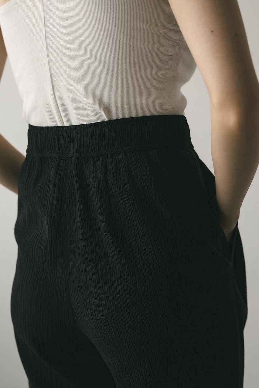 細かいシャーリング加工を施したストレッチ素材を使用したドライタッチなワイドパンツ。しわになりにくく、イージーケアが叶う一枚。ウエストゴム仕様で、内側紐でさらに調節可能。ストレスなく着用して頂けます。500IAS31-1341(リンクルリラックスワイドパンツ)とセットアップ着用可能。ストレッチなし、透け感なし。