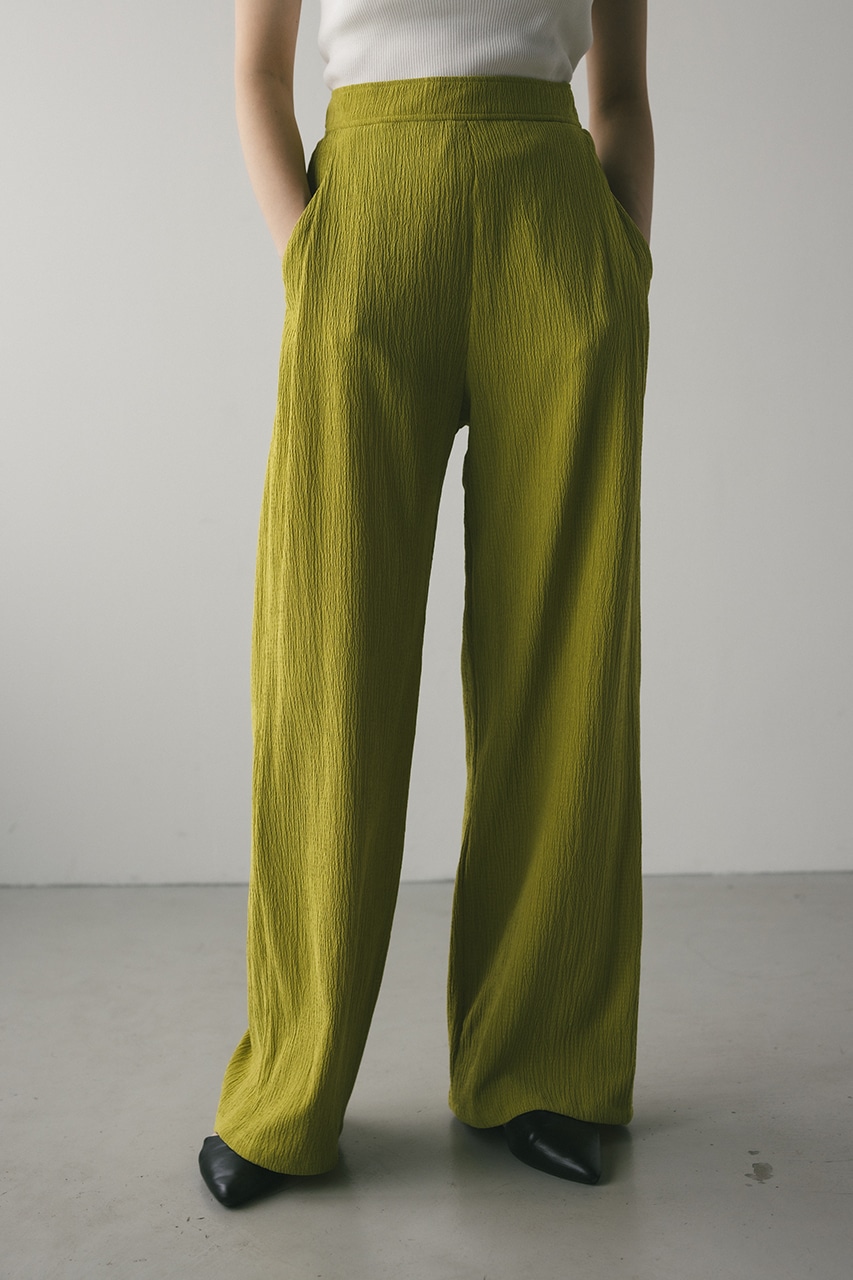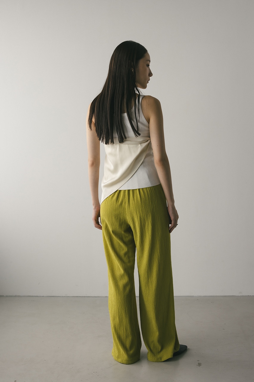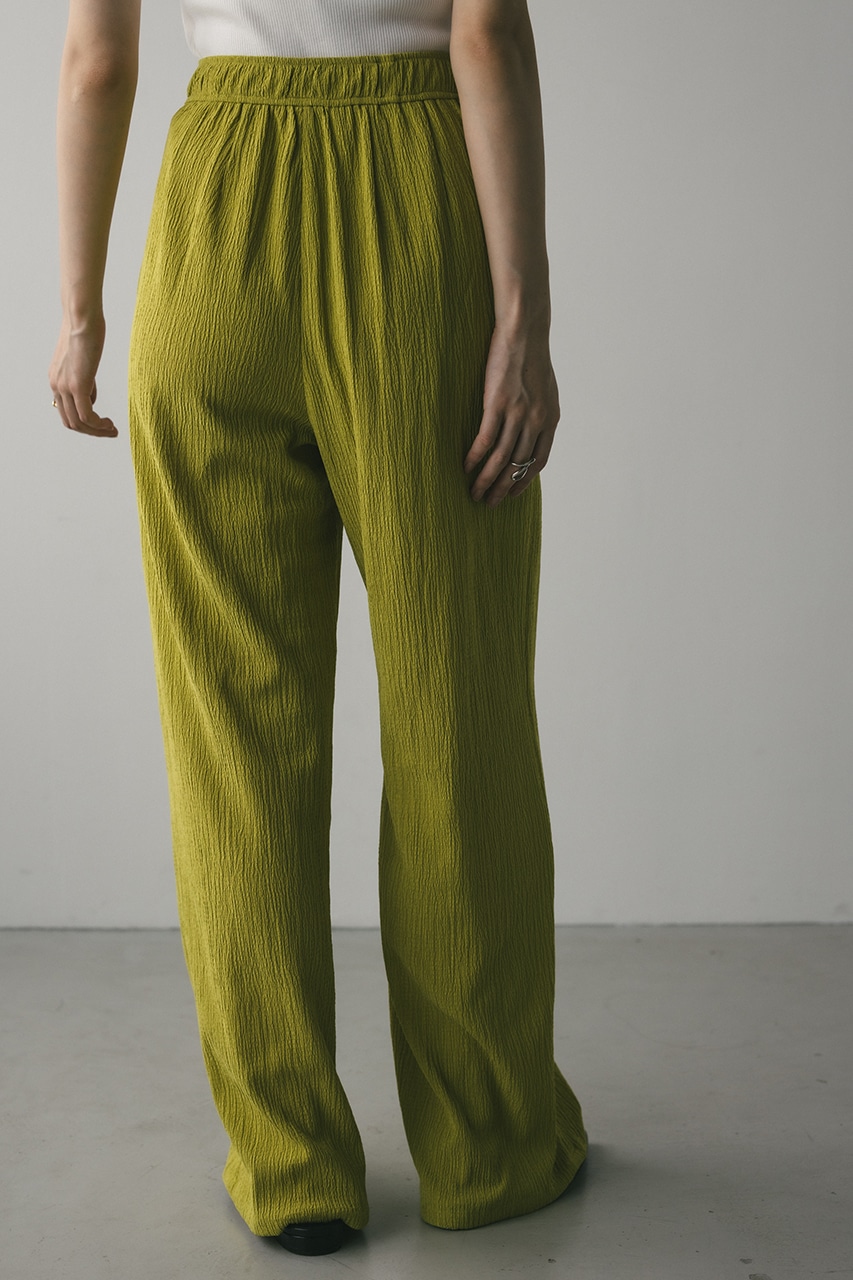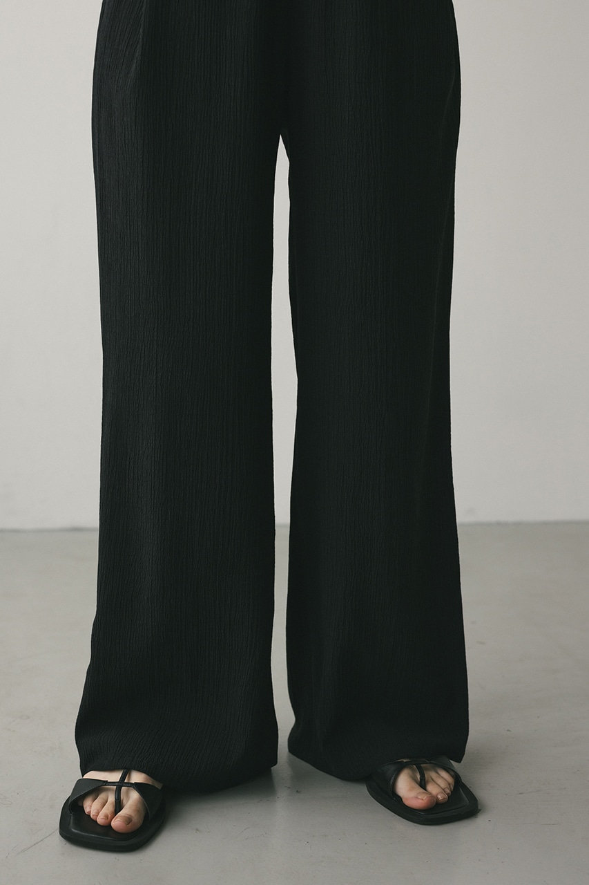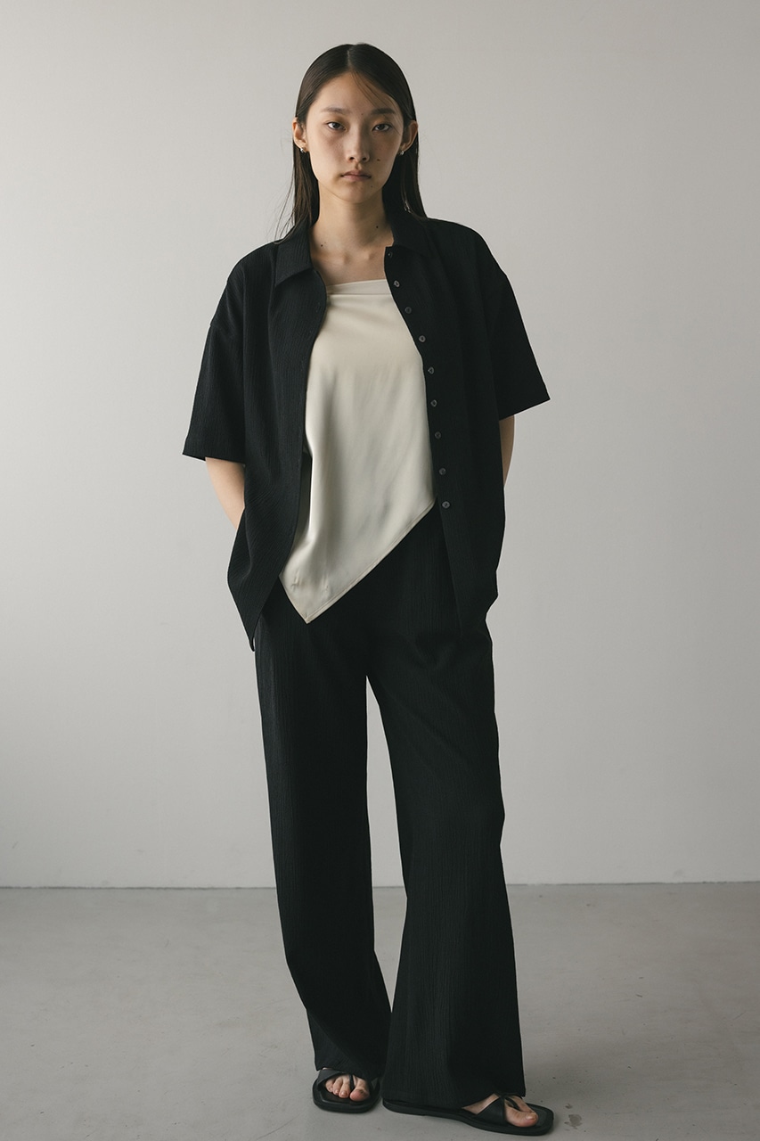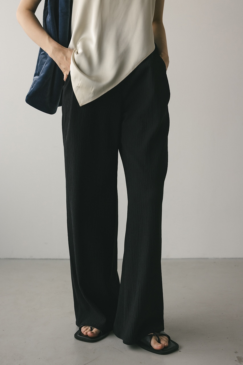 細かいシャーリング加工を施したストレッチ素材を使用したドライタッチなワイドパンツ。しわになりにくく、イージーケアが叶う一枚。ウエストゴム仕様で、内側紐でさらに調節可能。ストレスなく着用して頂けます。500IAS31-1341(リンクルリラックスワイドパンツ)とセットアップ着用可能。ストレッチなし、透け感なし。