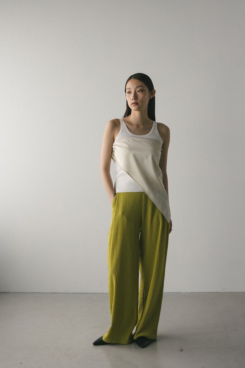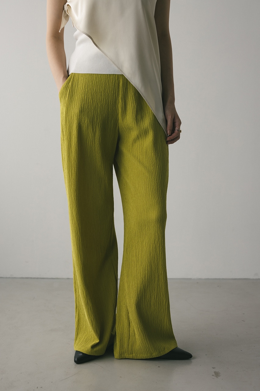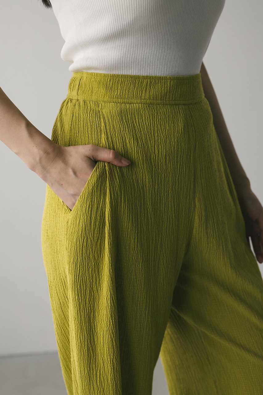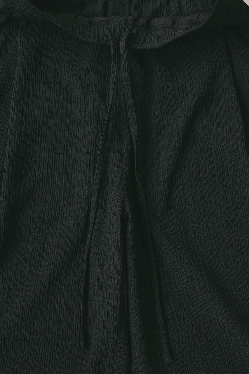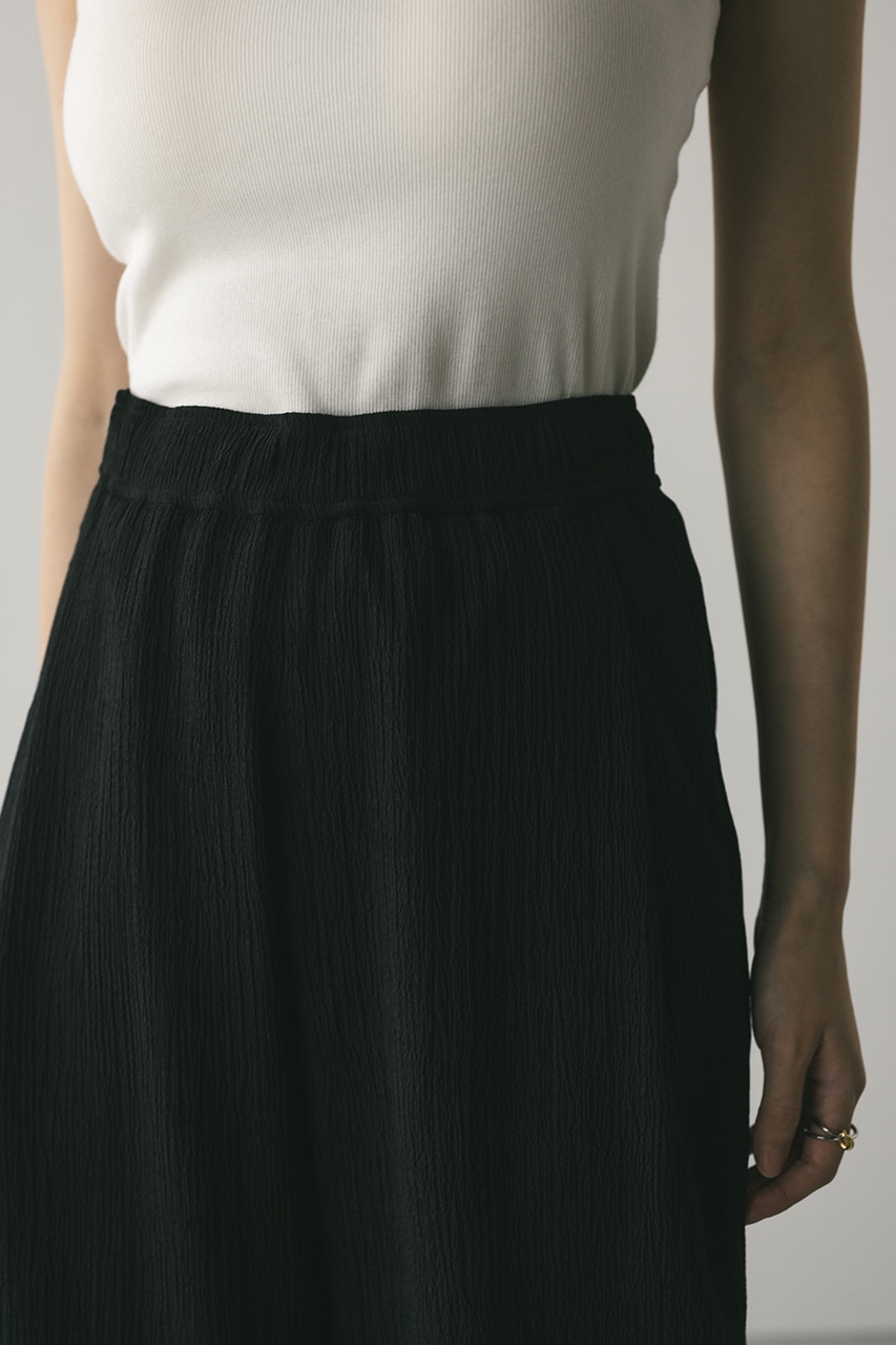 細かいシャーリング加工を施したストレッチ素材を使用したドライタッチなワイドパンツ。しわになりにくく、イージーケアが叶う一枚。ウエストゴム仕様で、内側紐でさらに調節可能。ストレスなく着用して頂けます。500IAS31-1341(リンクルリラックスワイドパンツ)とセットアップ着用可能。ストレッチなし、透け感なし。