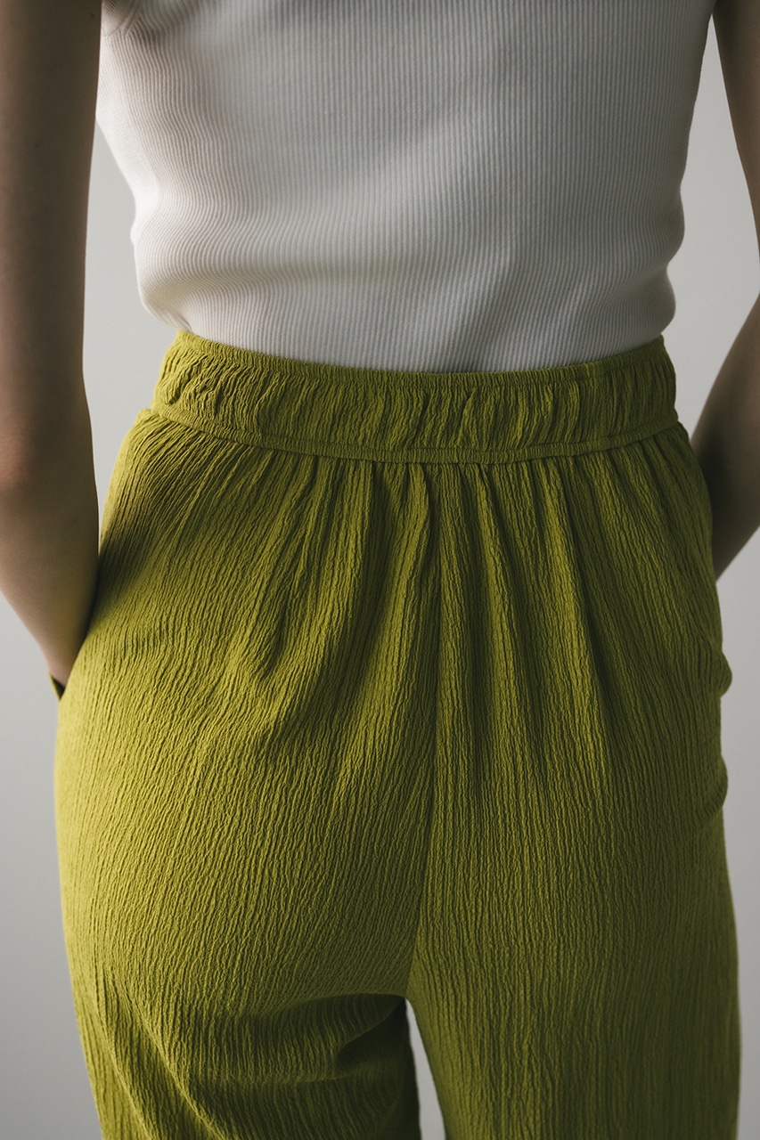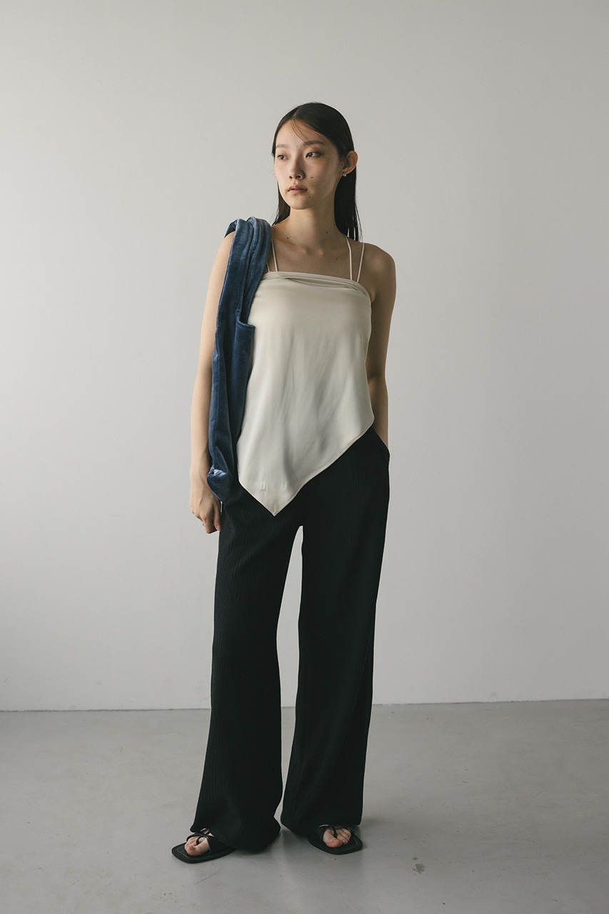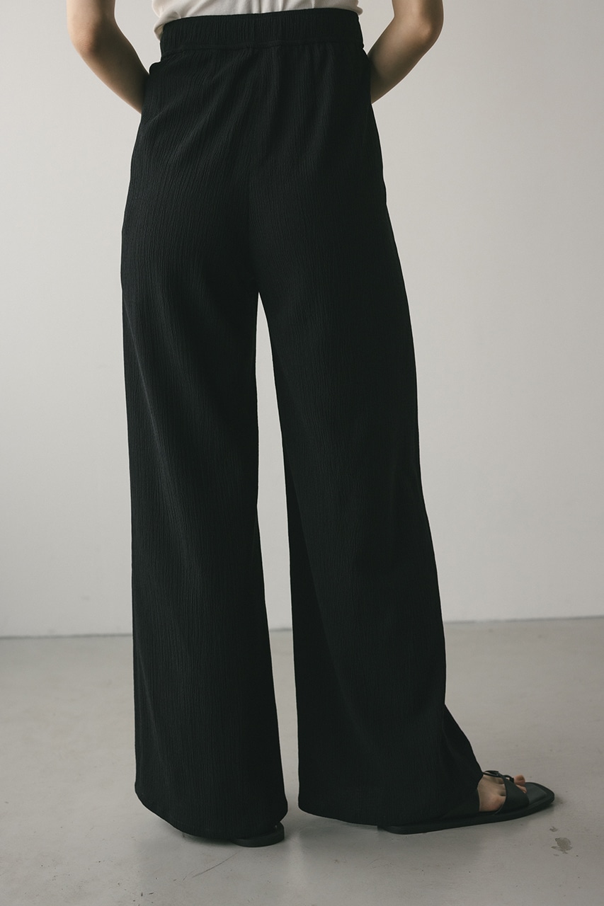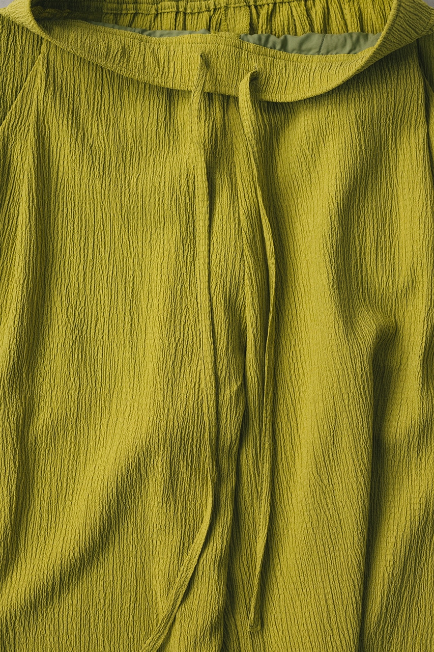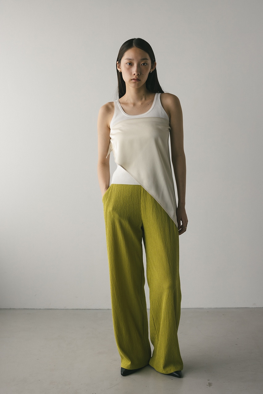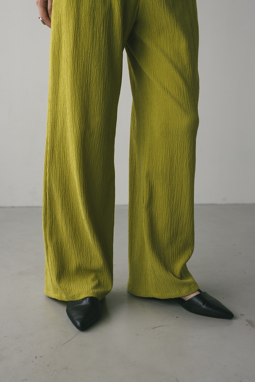細かいシャーリング加工を施したストレッチ素材を使用したドライタッチなワイドパンツ。しわになりにくく、イージーケアが叶う一枚。ウエストゴム仕様で、内側紐でさらに調節可能。ストレスなく着用して頂けます。500IAS31-1341(リンクルリラックスワイドパンツ)とセットアップ着用可能。ストレッチなし、透け感なし。