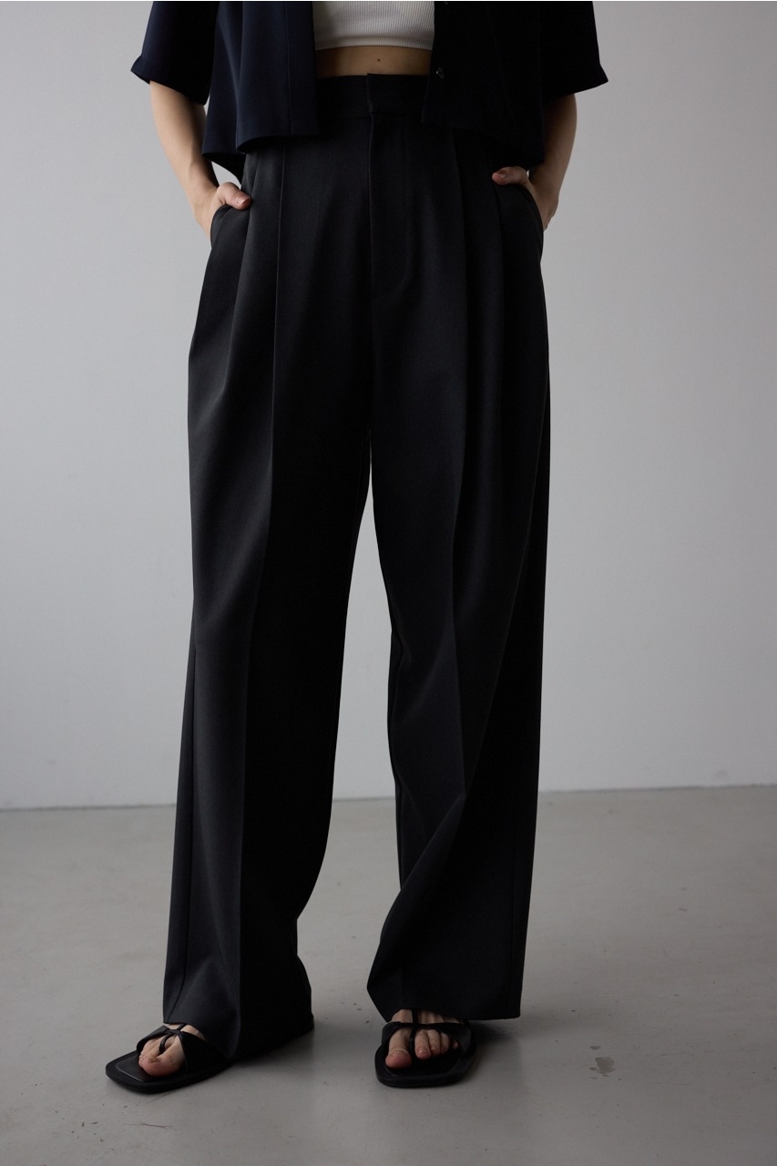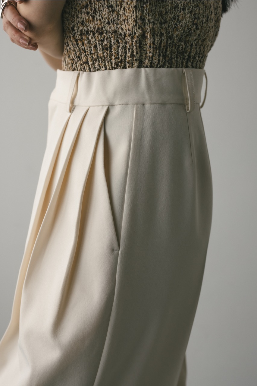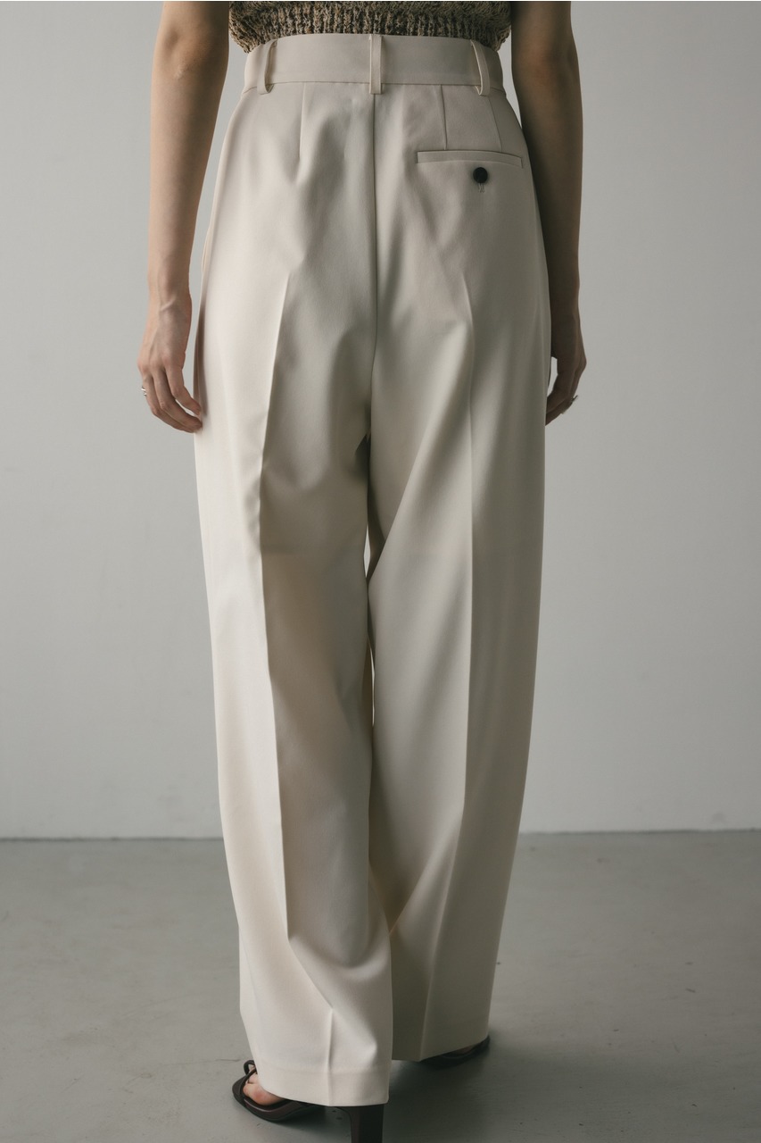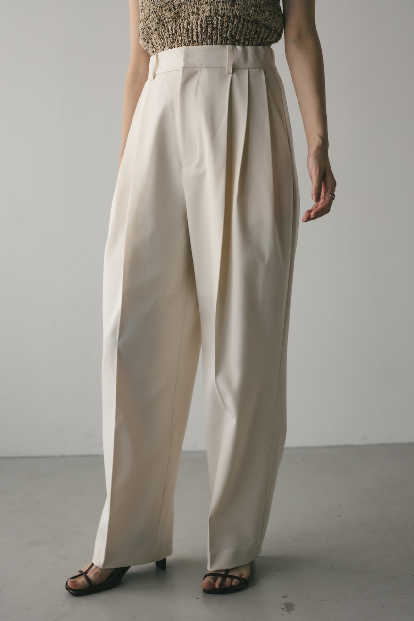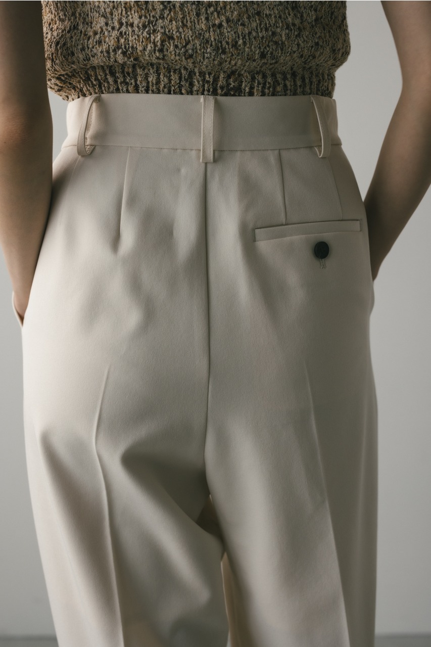 3タックデザインがマニッシュなスタミキの美脚スラックス。微ストレッチでしわになりにくい素材を使用。500HAS31-0191(ショートテーラーベスト)とセットアップ着用可能。透け感IVO裏地付き、ストレッチややあり。ロング丈もご用意しています。(500IAS31-4061 3タックスラックスロング)