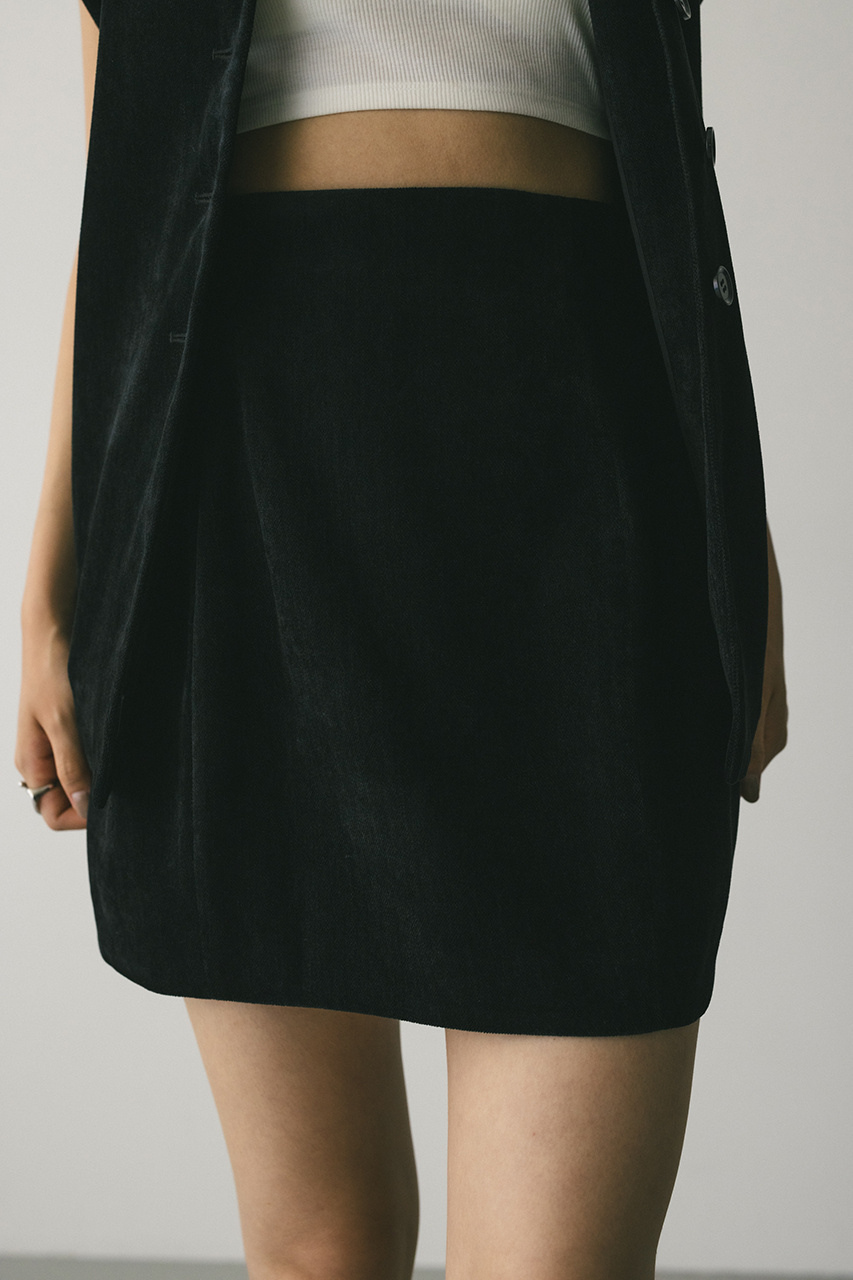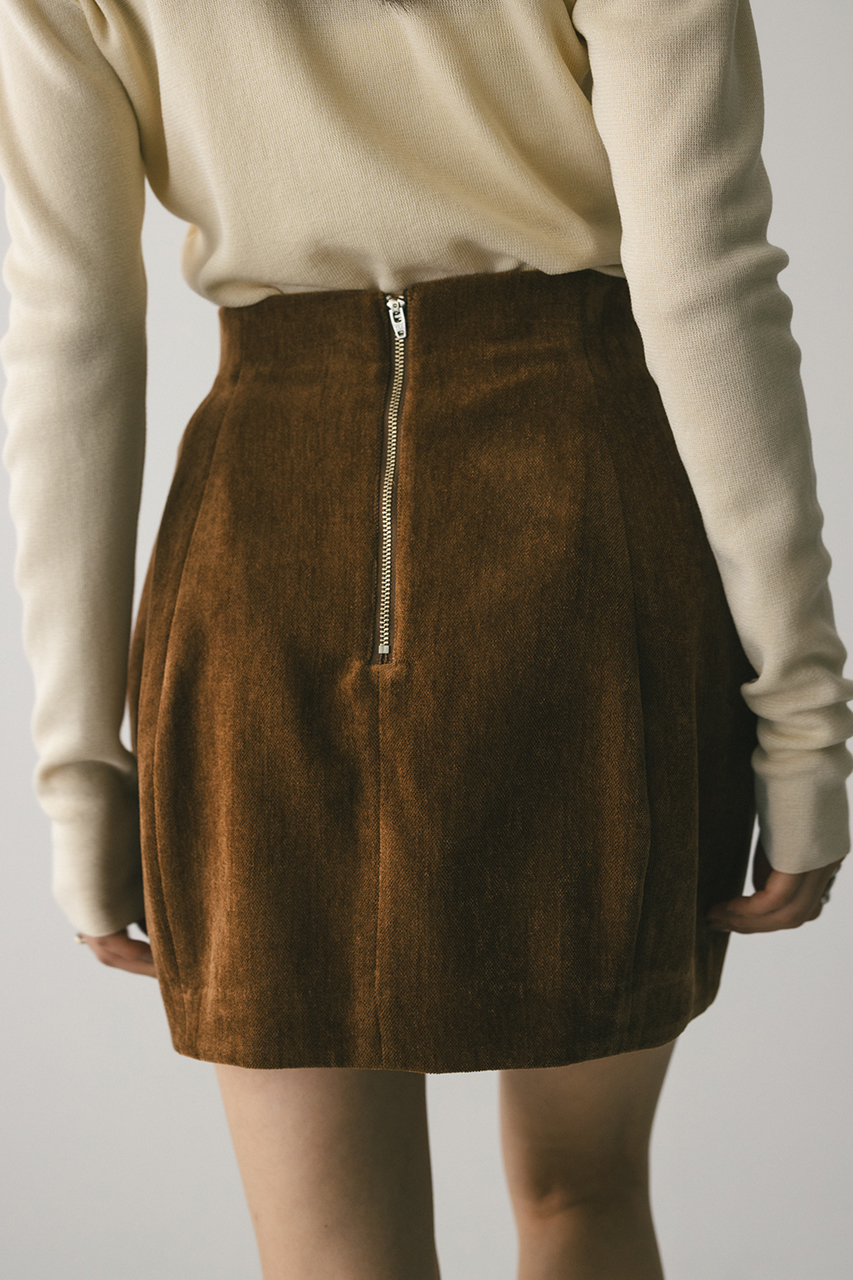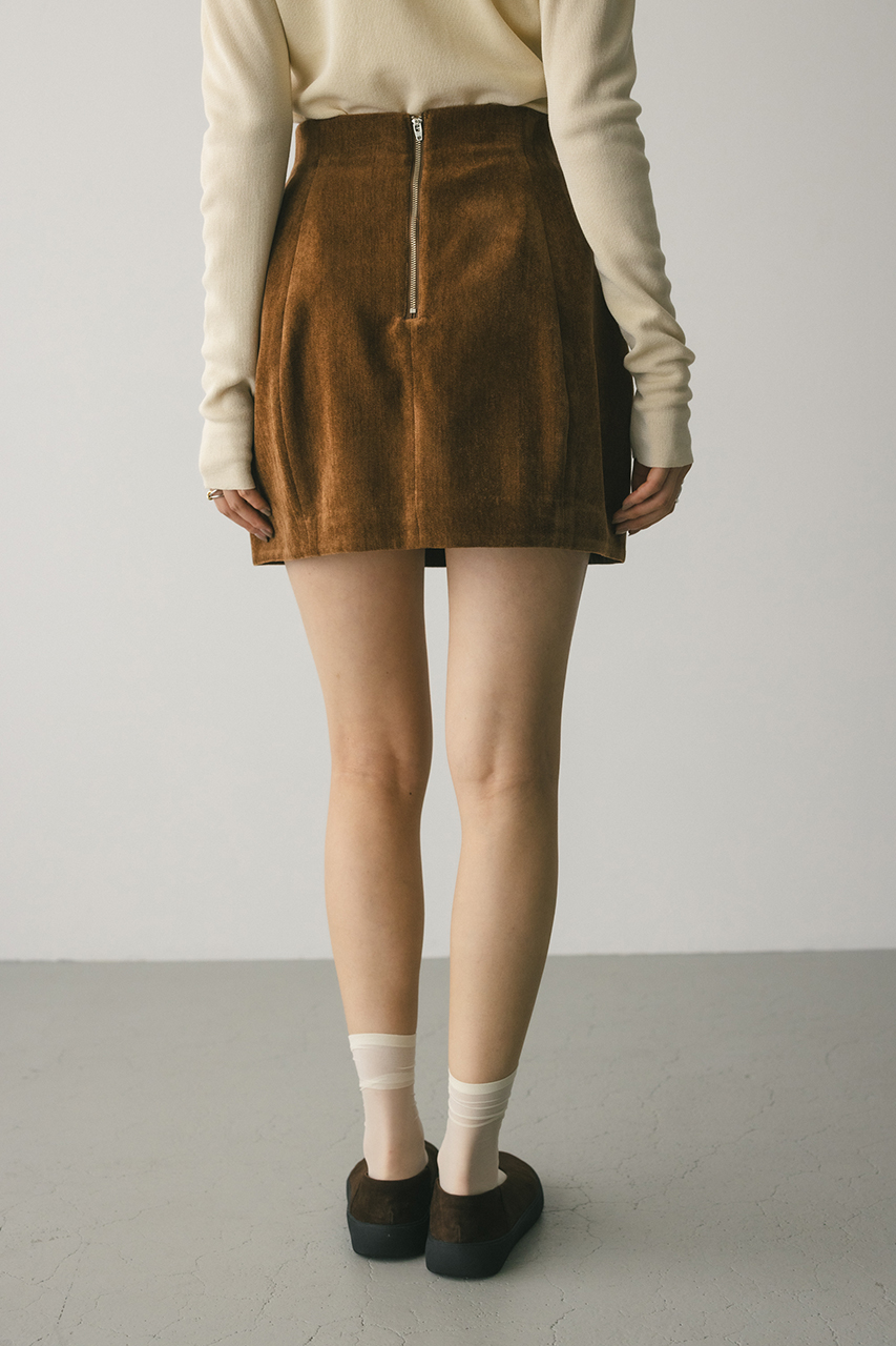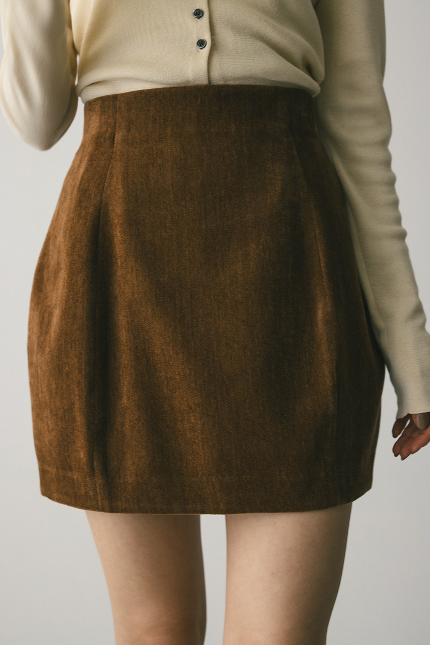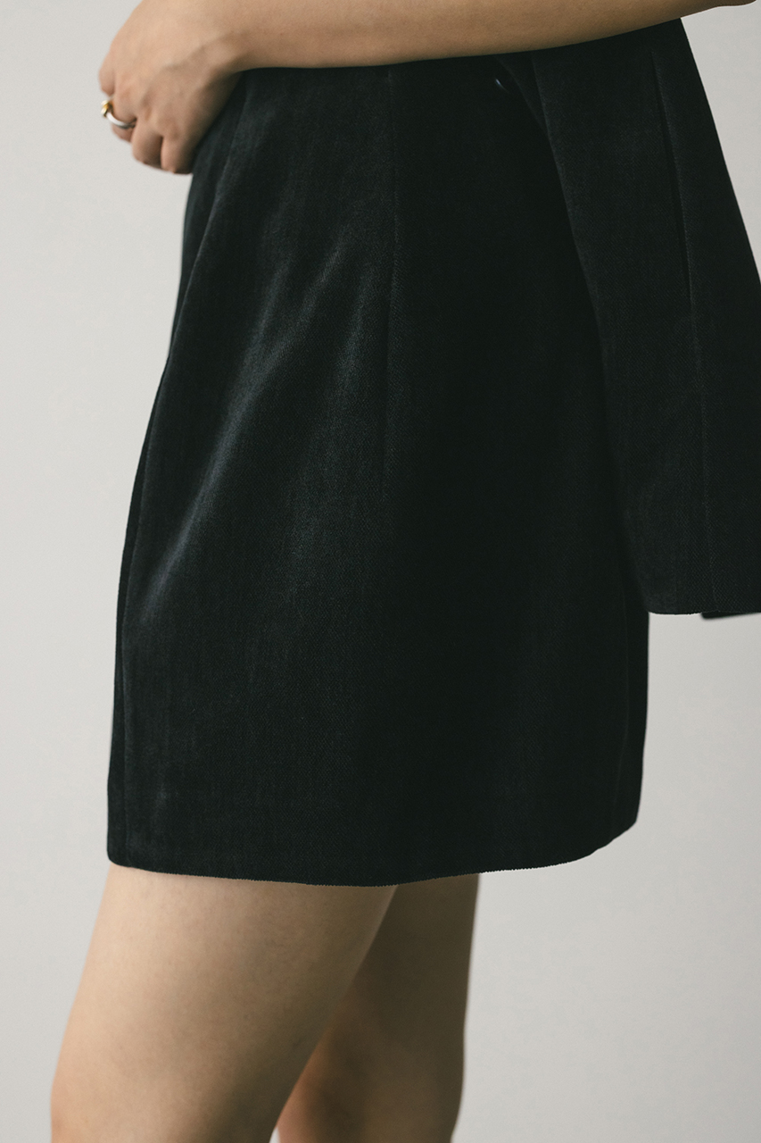 程よくハリがありながらもしなやかな風合いがポイントのベロア素材を使用したミニスカートパンツ。綺麗なコクーンラインですっきり大人っぽく着用していただけます。カットソーポンチショートパンツ付き。500IAS30-1651(ショルダータックベロアベスト)とセットアップ着用可能。透け感なし、ストレッチなし。