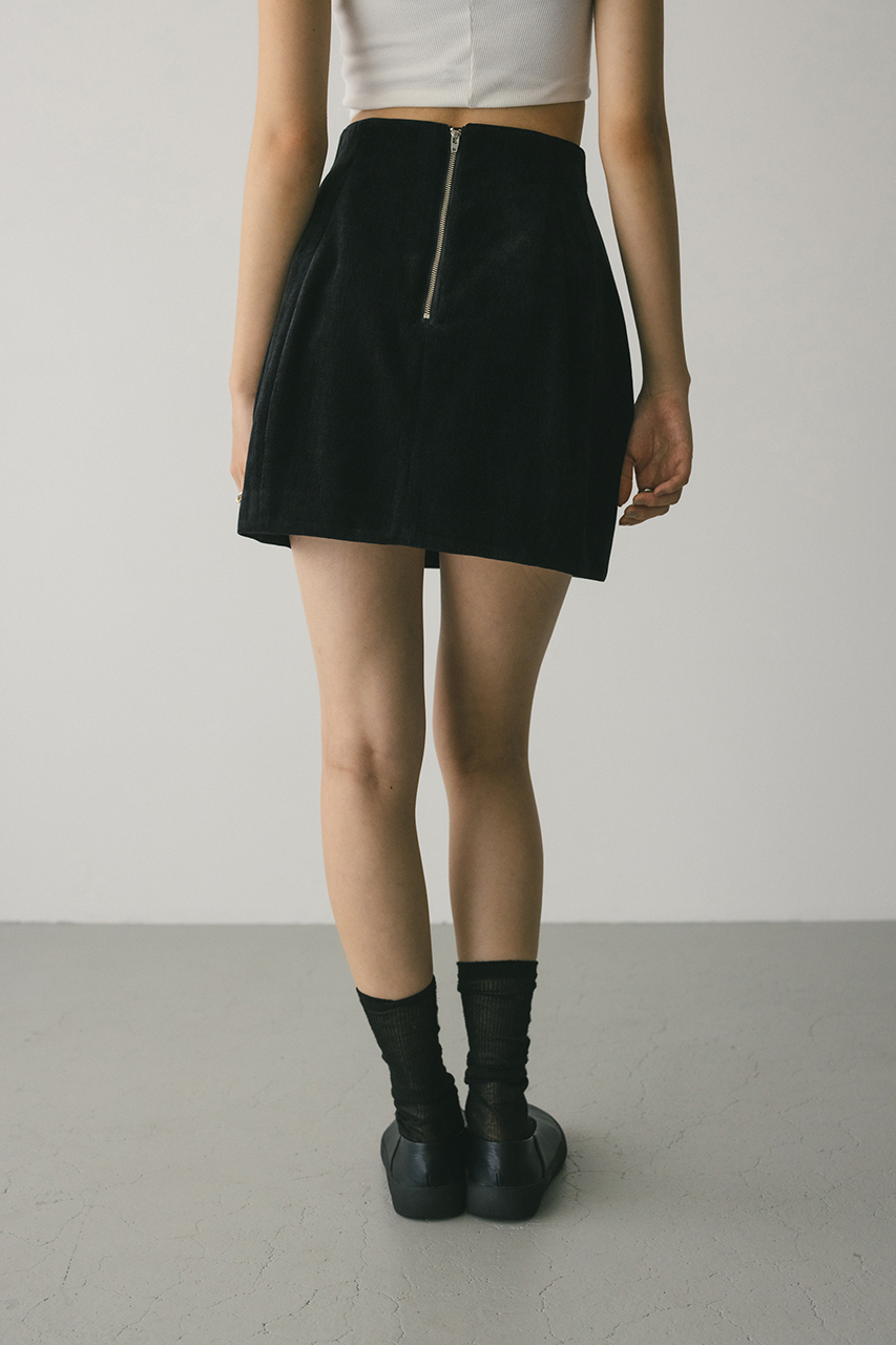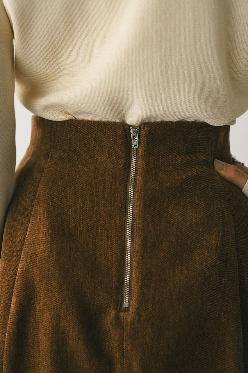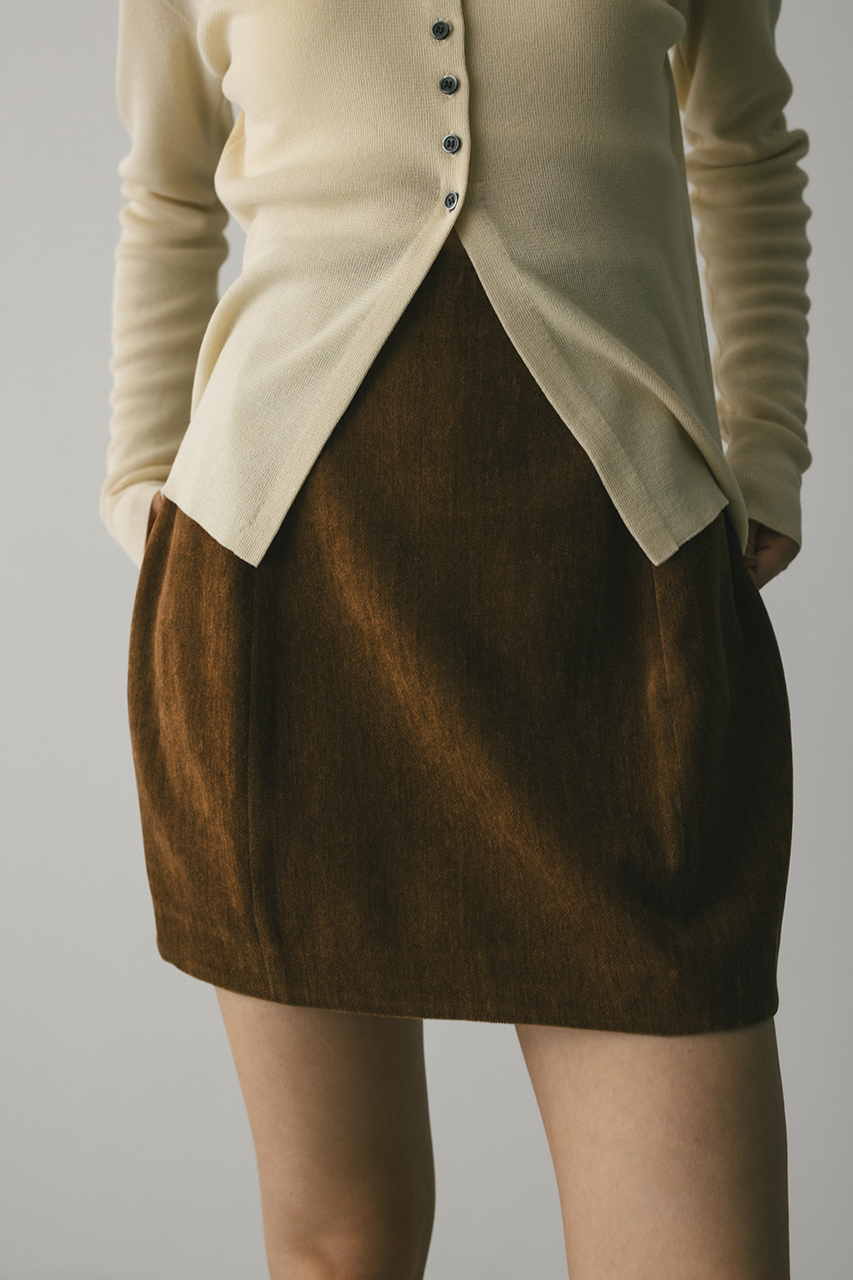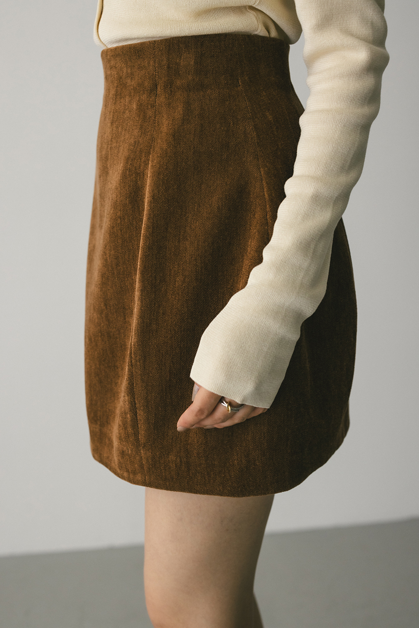 程よくハリがありながらもしなやかな風合いがポイントのベロア素材を使用したミニスカートパンツ。綺麗なコクーンラインですっきり大人っぽく着用していただけます。カットソーポンチショートパンツ付き。500IAS30-1651(ショルダータックベロアベスト)とセットアップ着用可能。透け感なし、ストレッチなし。