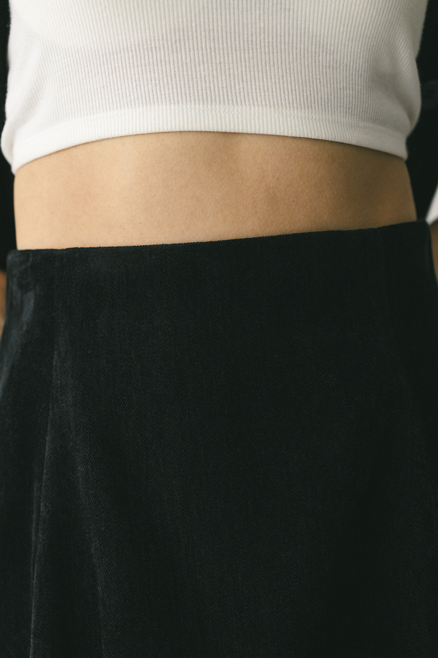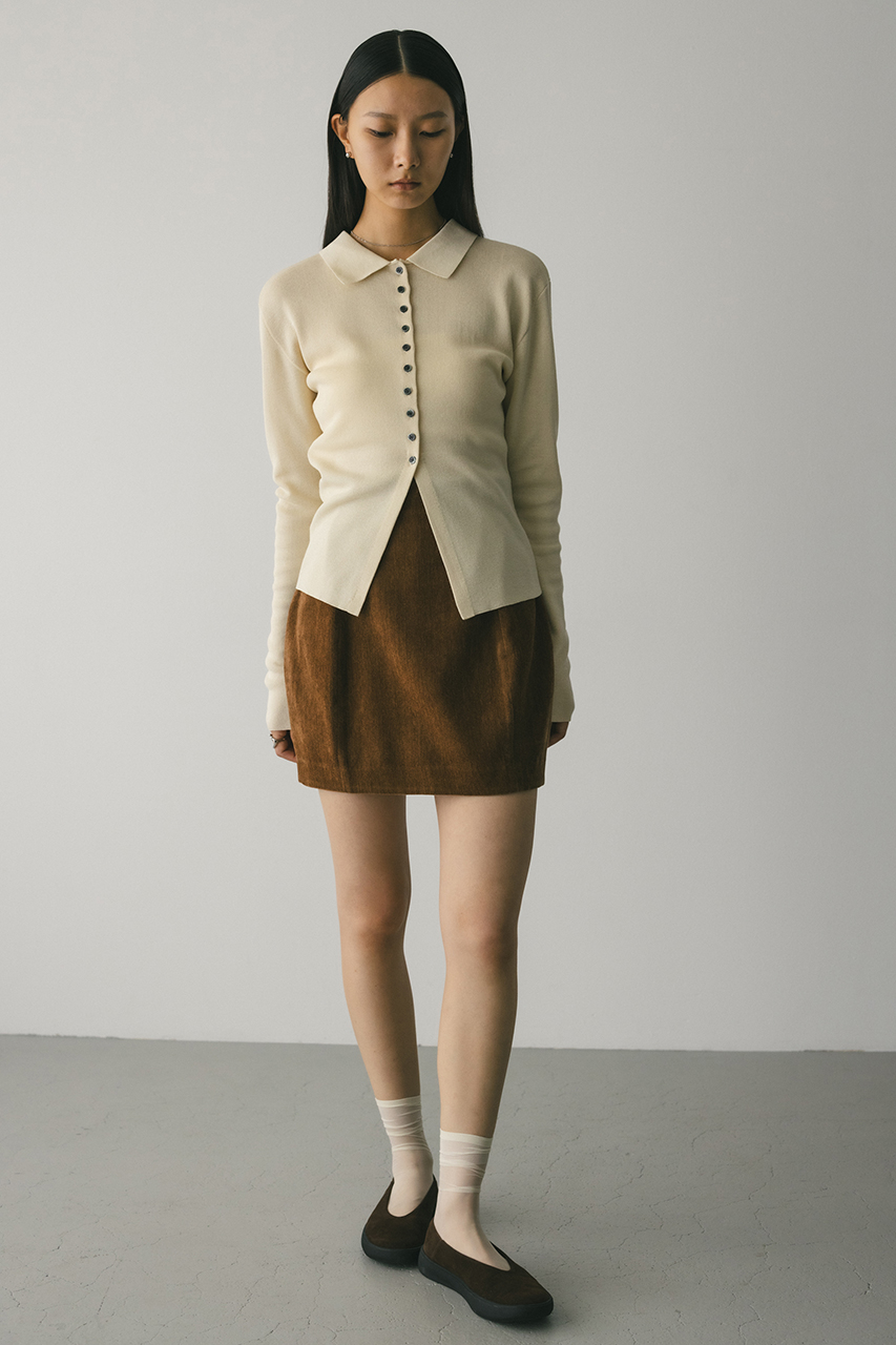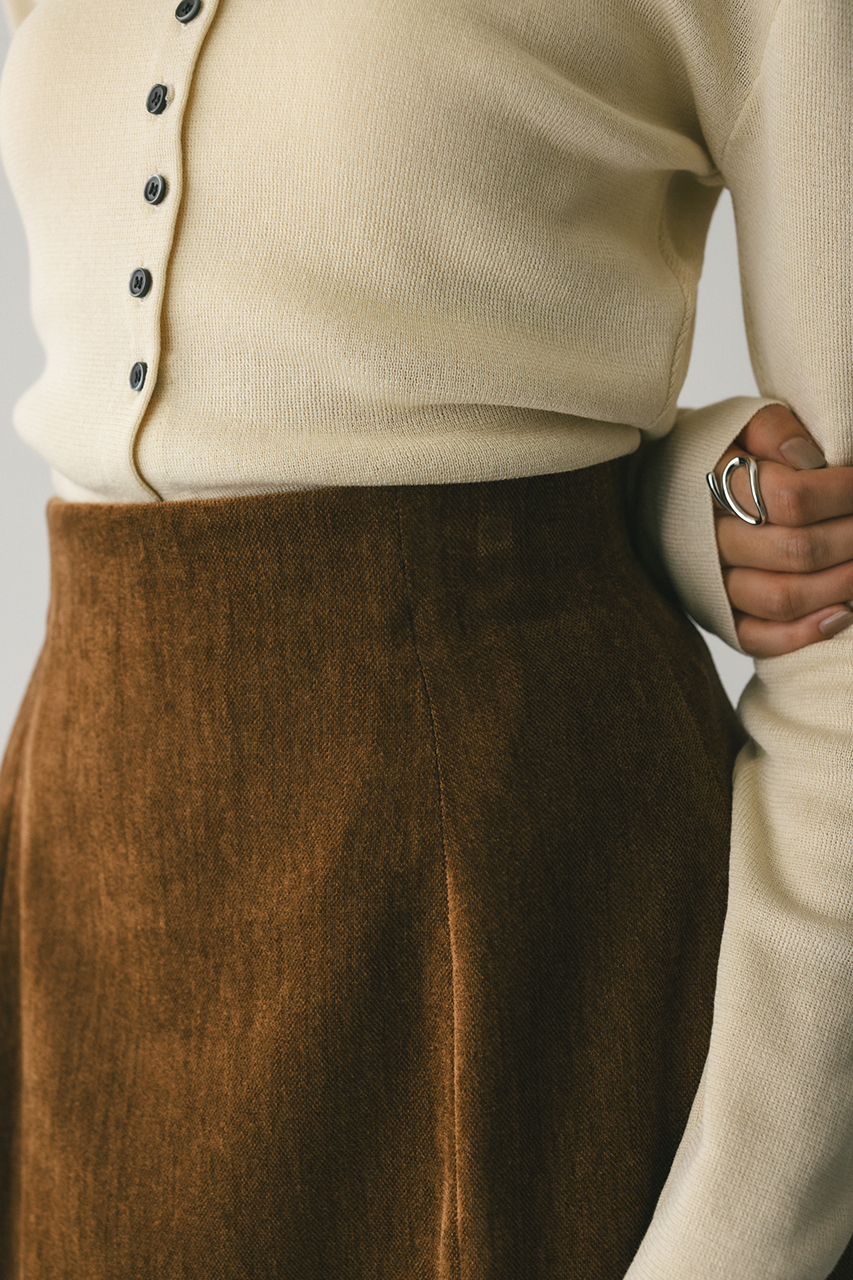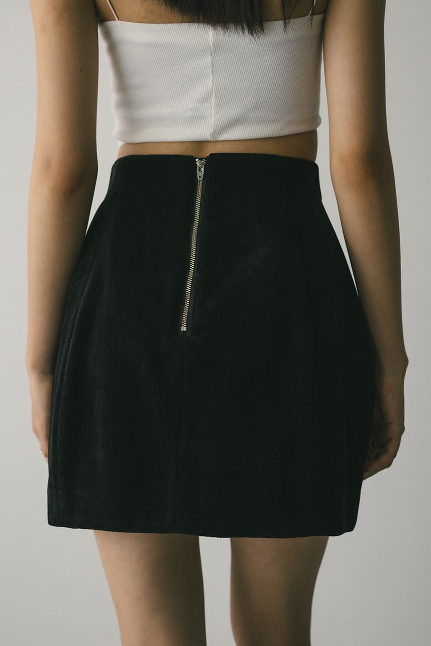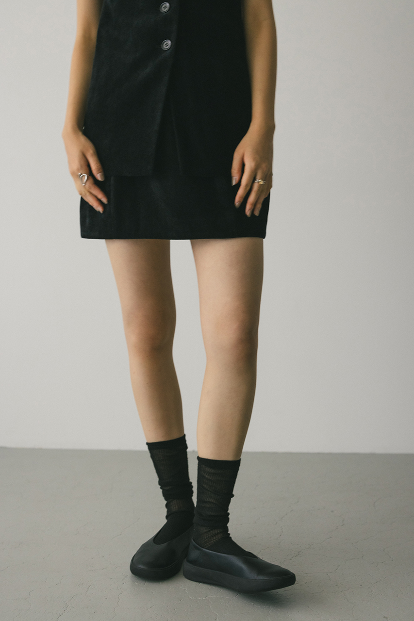 程よくハリがありながらもしなやかな風合いがポイントのベロア素材を使用したミニスカートパンツ。綺麗なコクーンラインですっきり大人っぽく着用していただけます。カットソーポンチショートパンツ付き。500IAS30-1651(ショルダータックベロアベスト)とセットアップ着用可能。透け感なし、ストレッチなし。