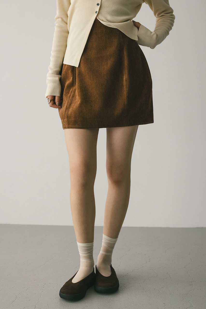 程よくハリがありながらもしなやかな風合いがポイントのベロア素材を使用したミニスカートパンツ。綺麗なコクーンラインですっきり大人っぽく着用していただけます。カットソーポンチショートパンツ付き。500IAS30-1651(ショルダータックベロアベスト)とセットアップ着用可能。透け感なし、ストレッチなし。