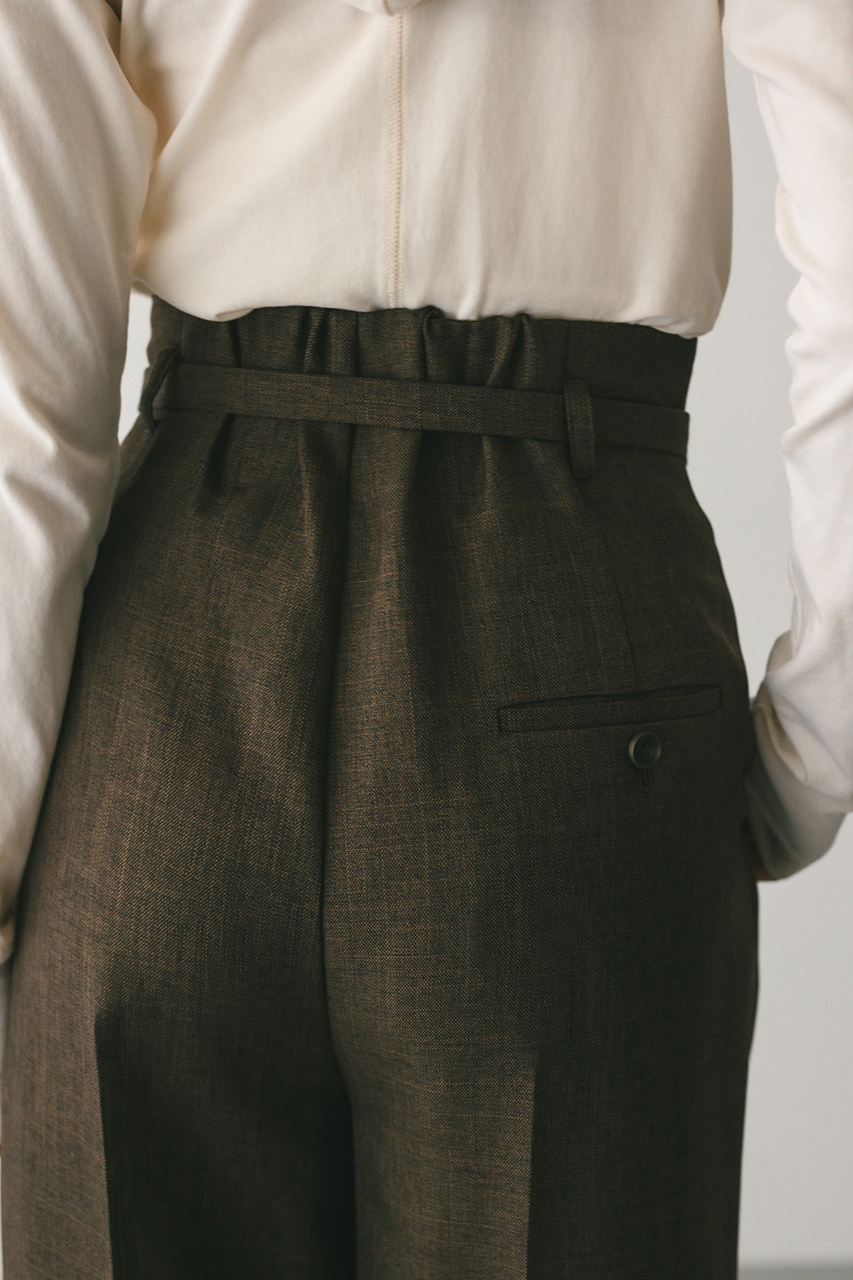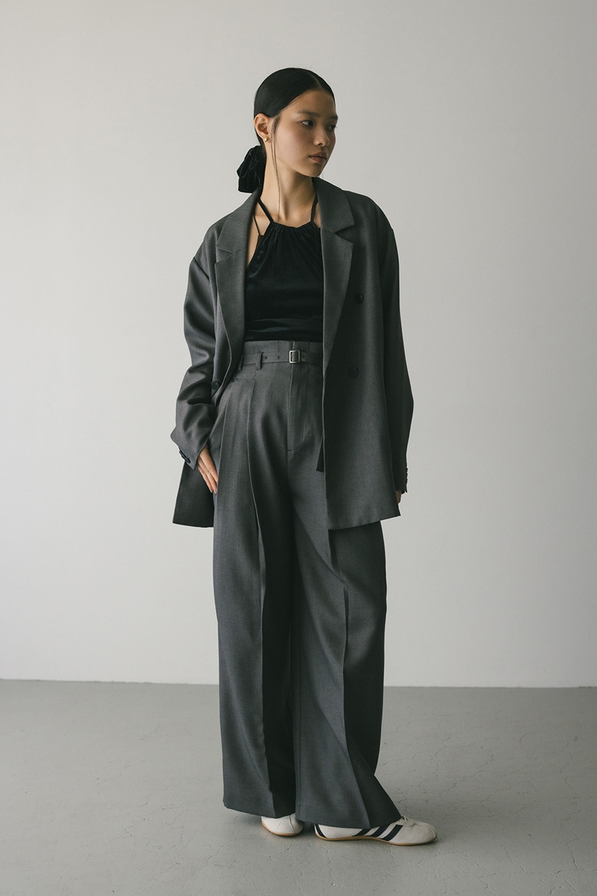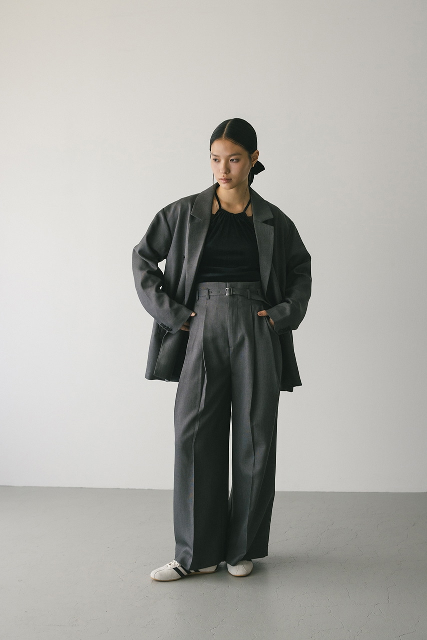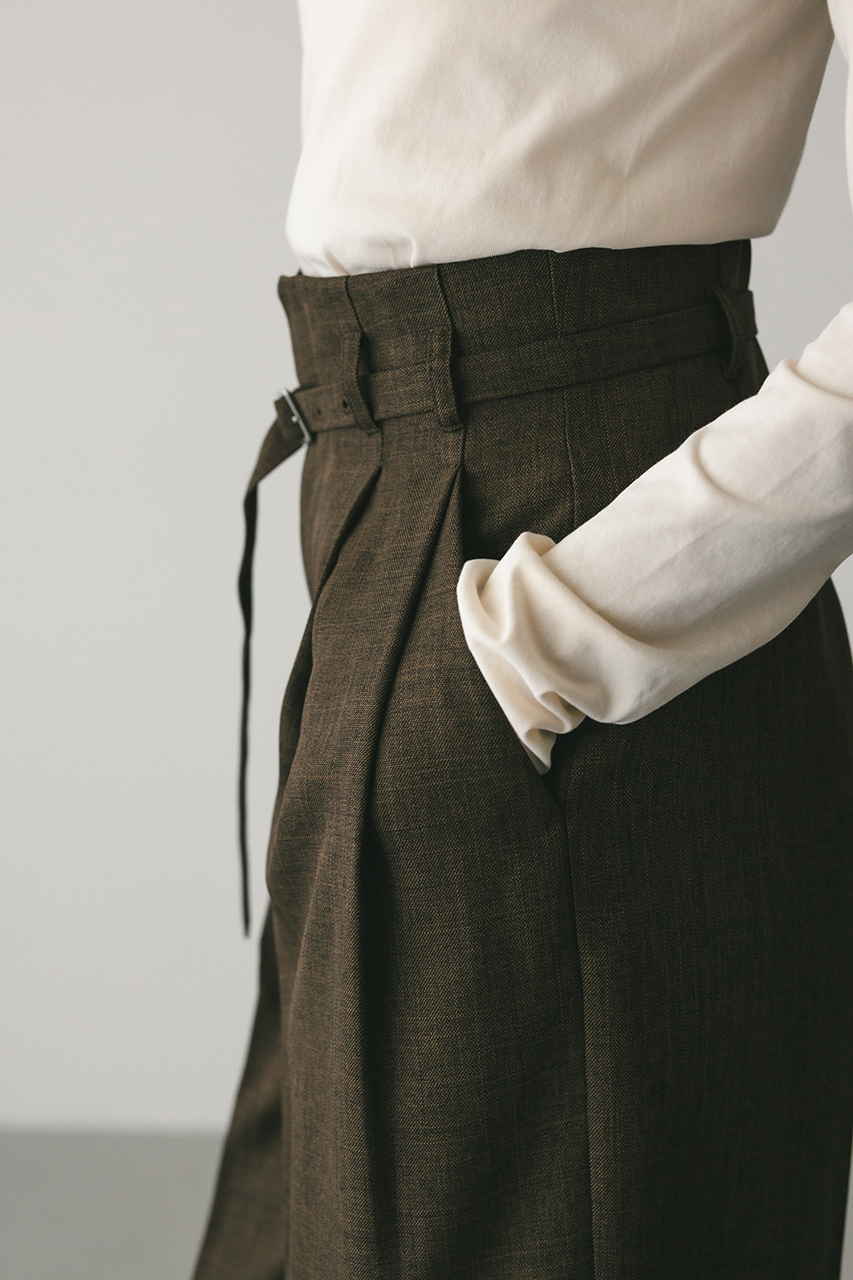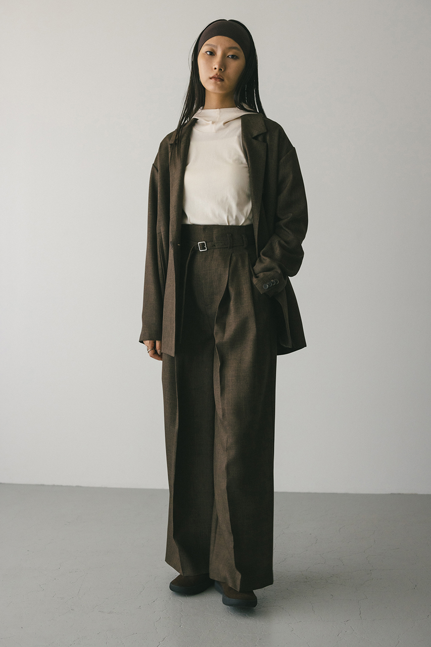 大人の抜け感とおしゃれ見えが叶うハイウエストワイドパンツ。タックとセンタープレスでスタイルアップに導きます。ウエストバックゴム仕様。同素材の細ベルト付き。500IAS30-1691(ボクシーダブルテーラードジャケット)とセットアップ着用可能。透け感なし、ストレッチややあり。