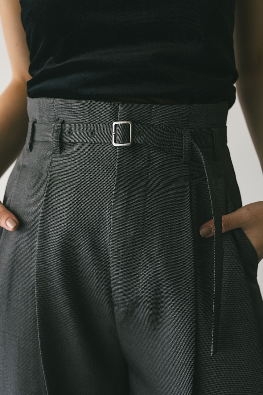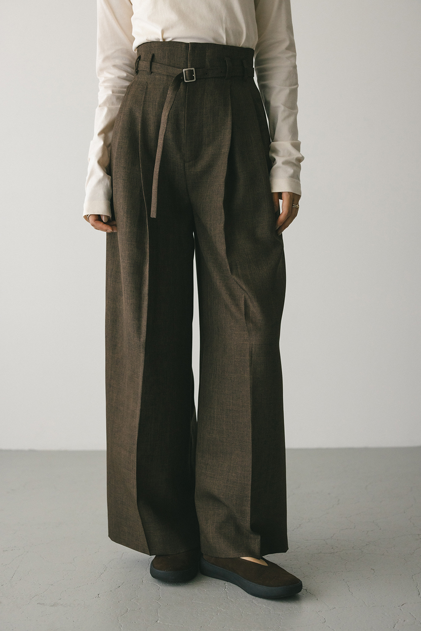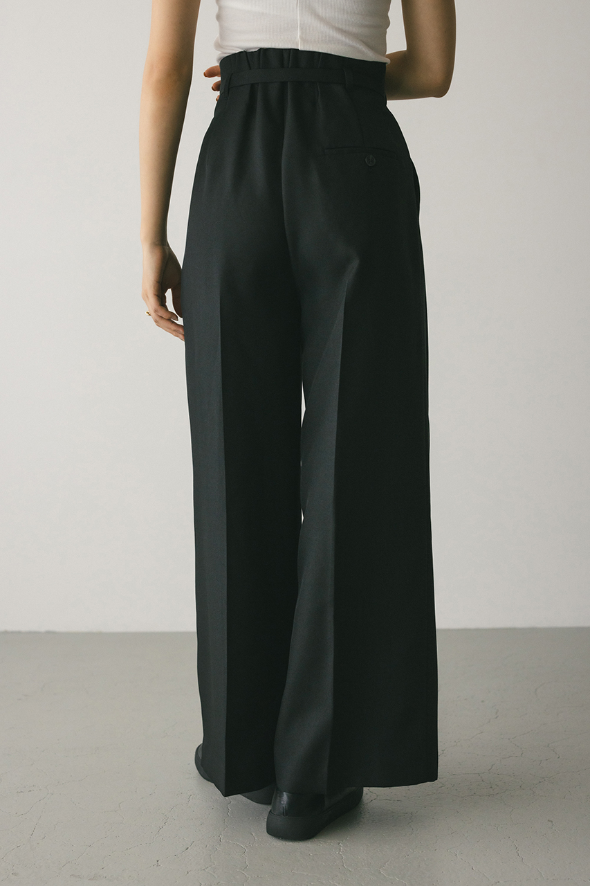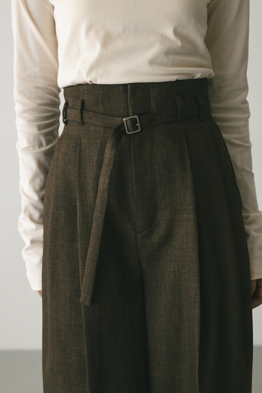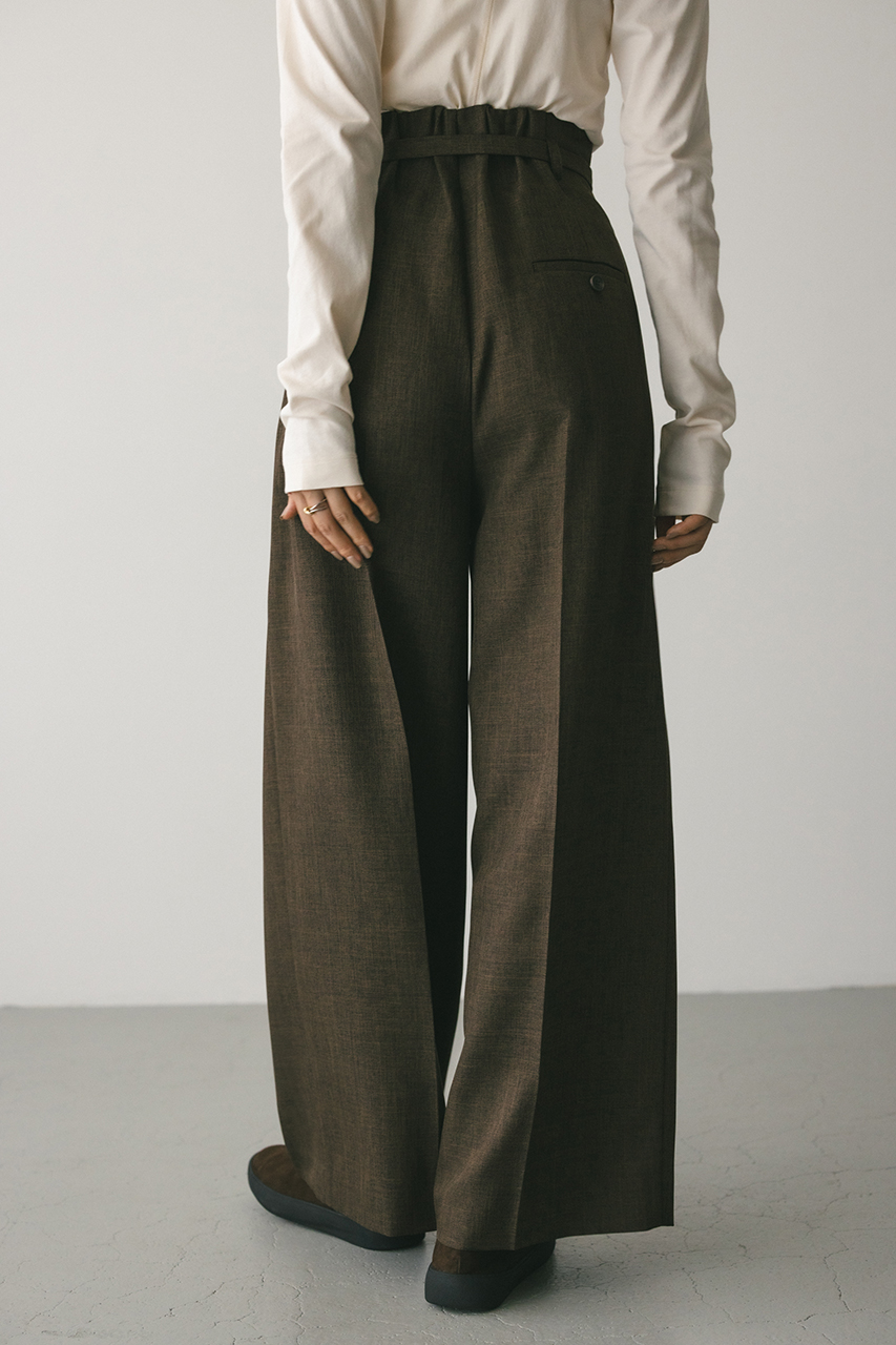 大人の抜け感とおしゃれ見えが叶うハイウエストワイドパンツ。タックとセンタープレスでスタイルアップに導きます。ウエストバックゴム仕様。同素材の細ベルト付き。500IAS30-1691(ボクシーダブルテーラードジャケット)とセットアップ着用可能。透け感なし、ストレッチややあり。