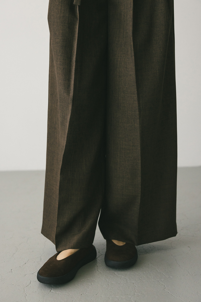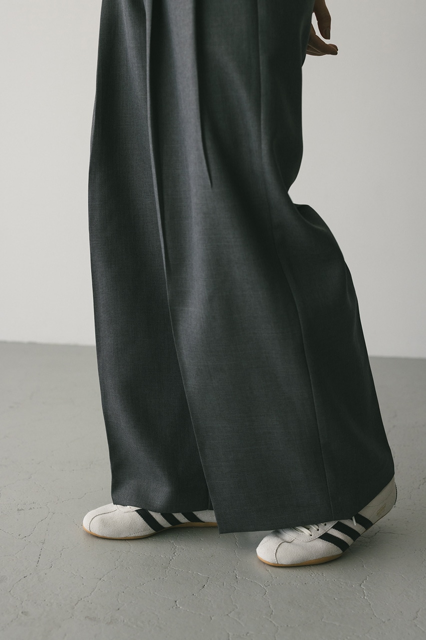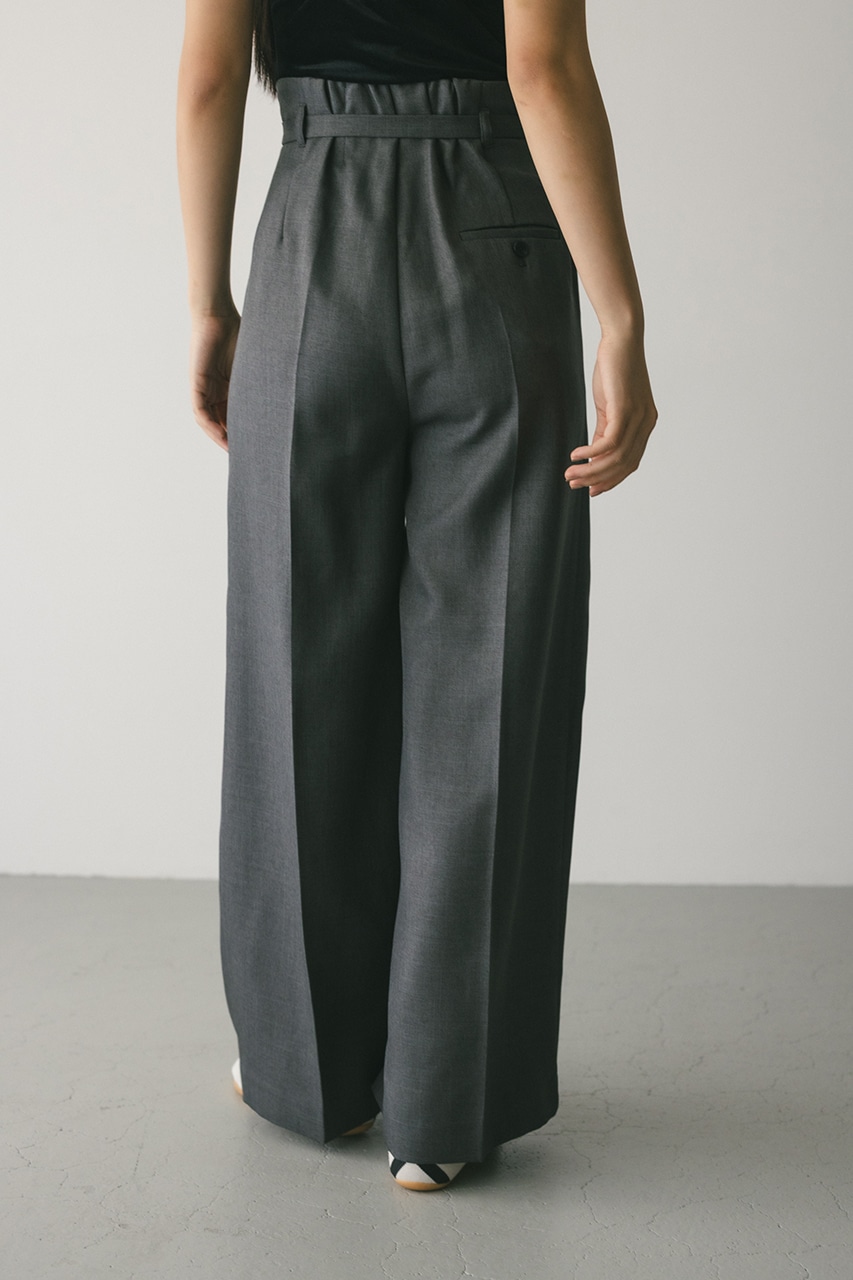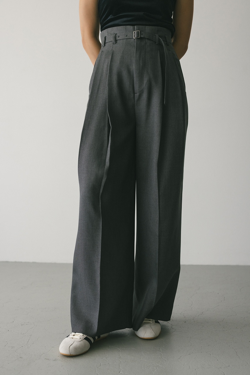 大人の抜け感とおしゃれ見えが叶うハイウエストワイドパンツ。タックとセンタープレスでスタイルアップに導きます。ウエストバックゴム仕様。同素材の細ベルト付き。500IAS30-1691(ボクシーダブルテーラードジャケット)とセットアップ着用可能。透け感なし、ストレッチややあり。