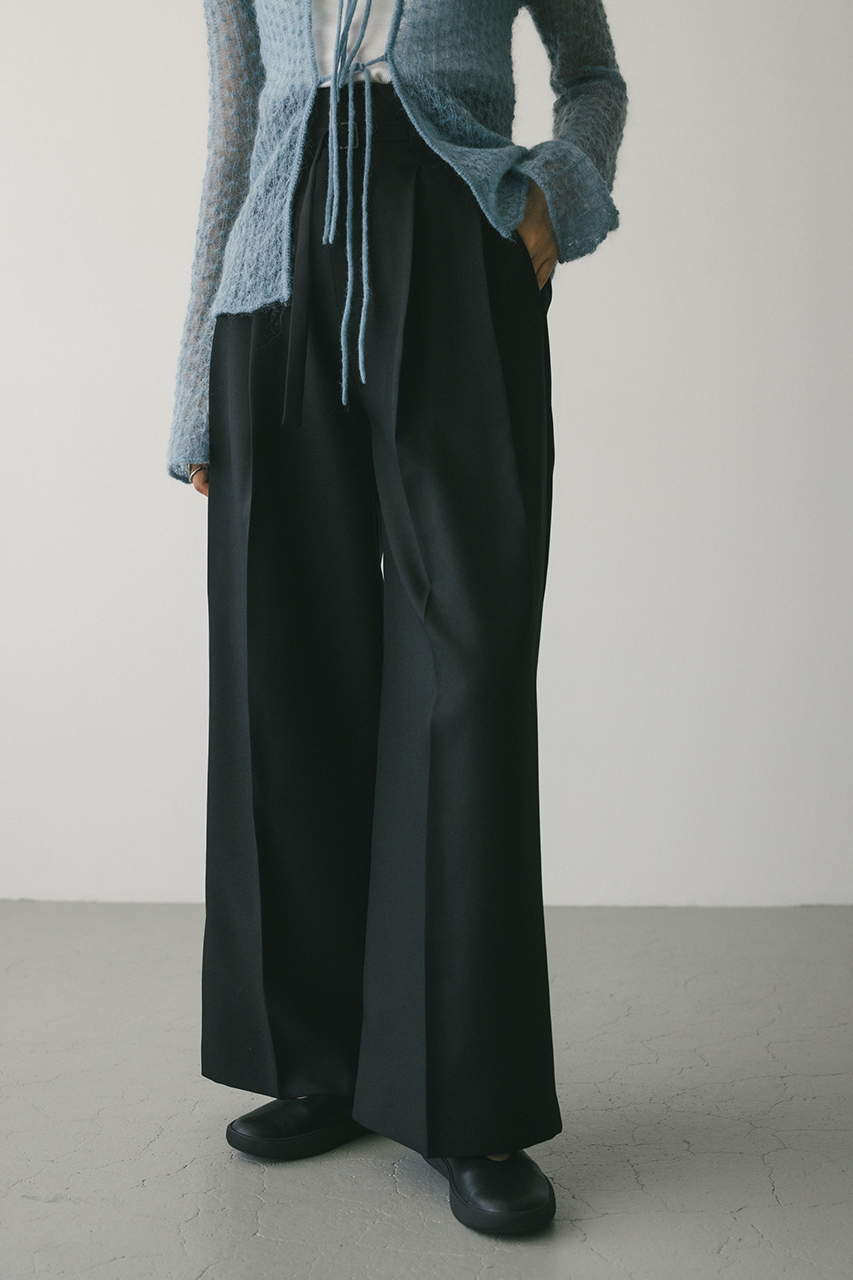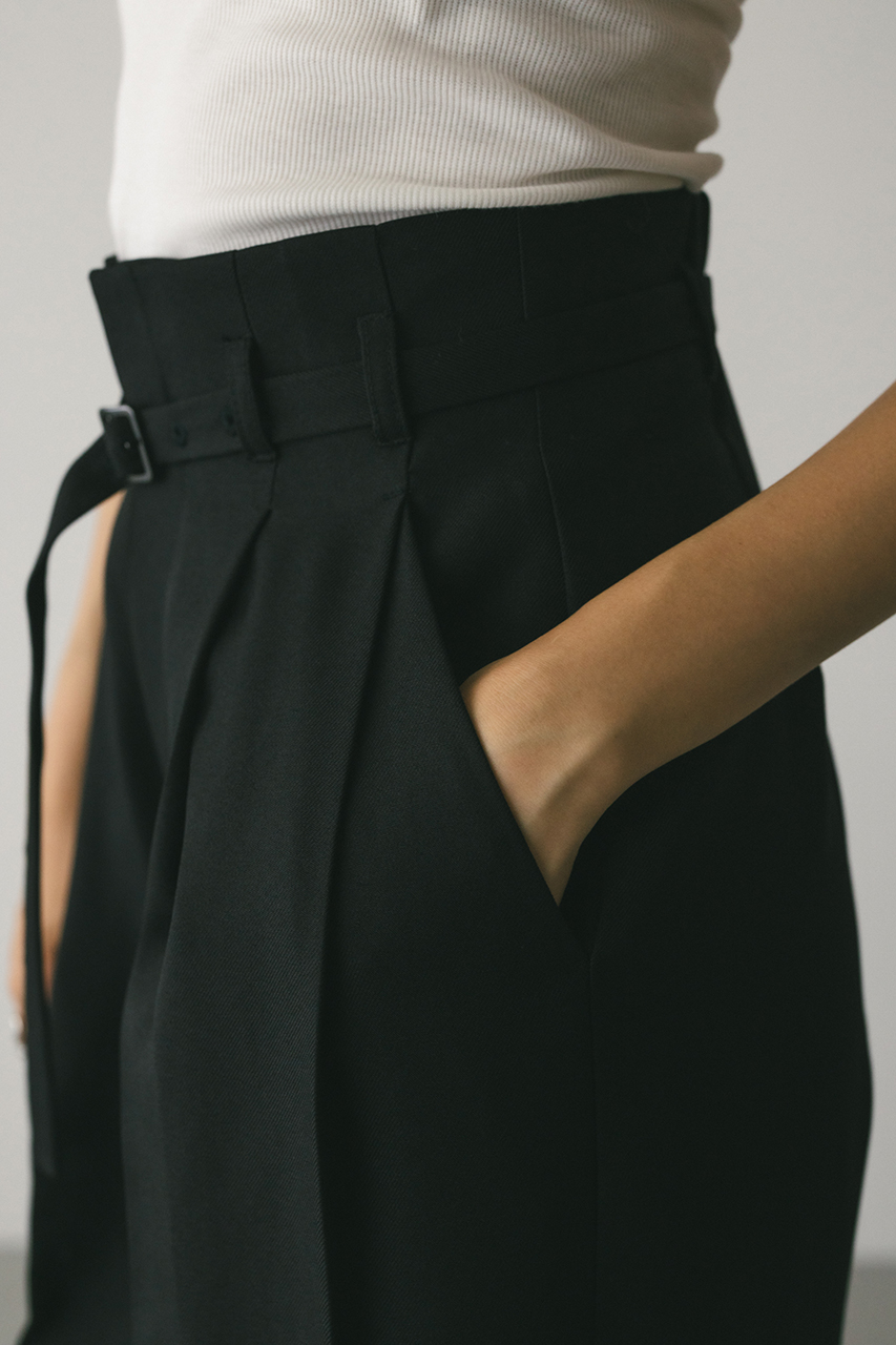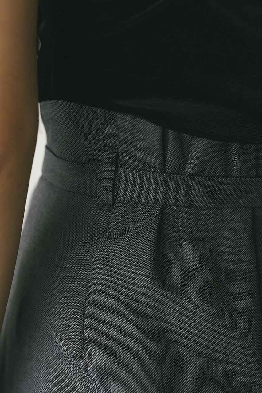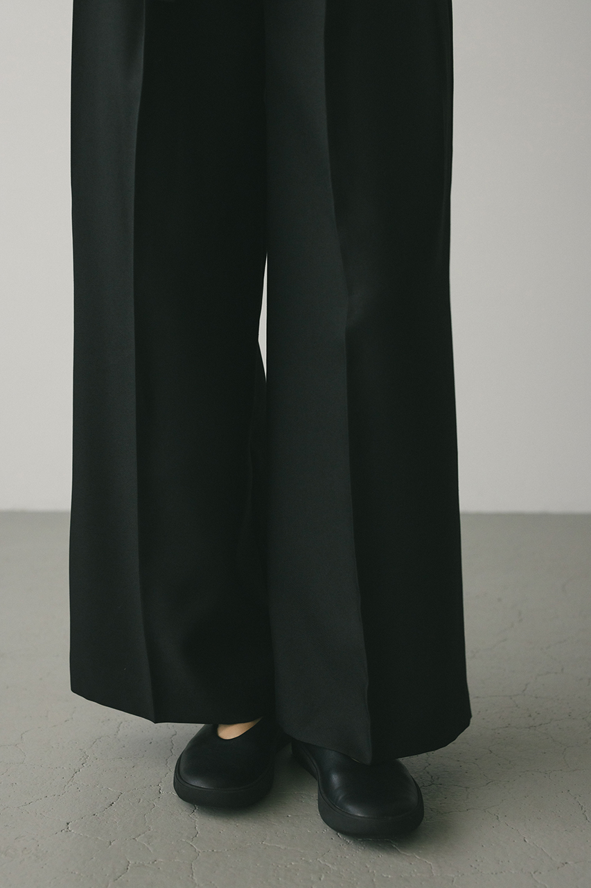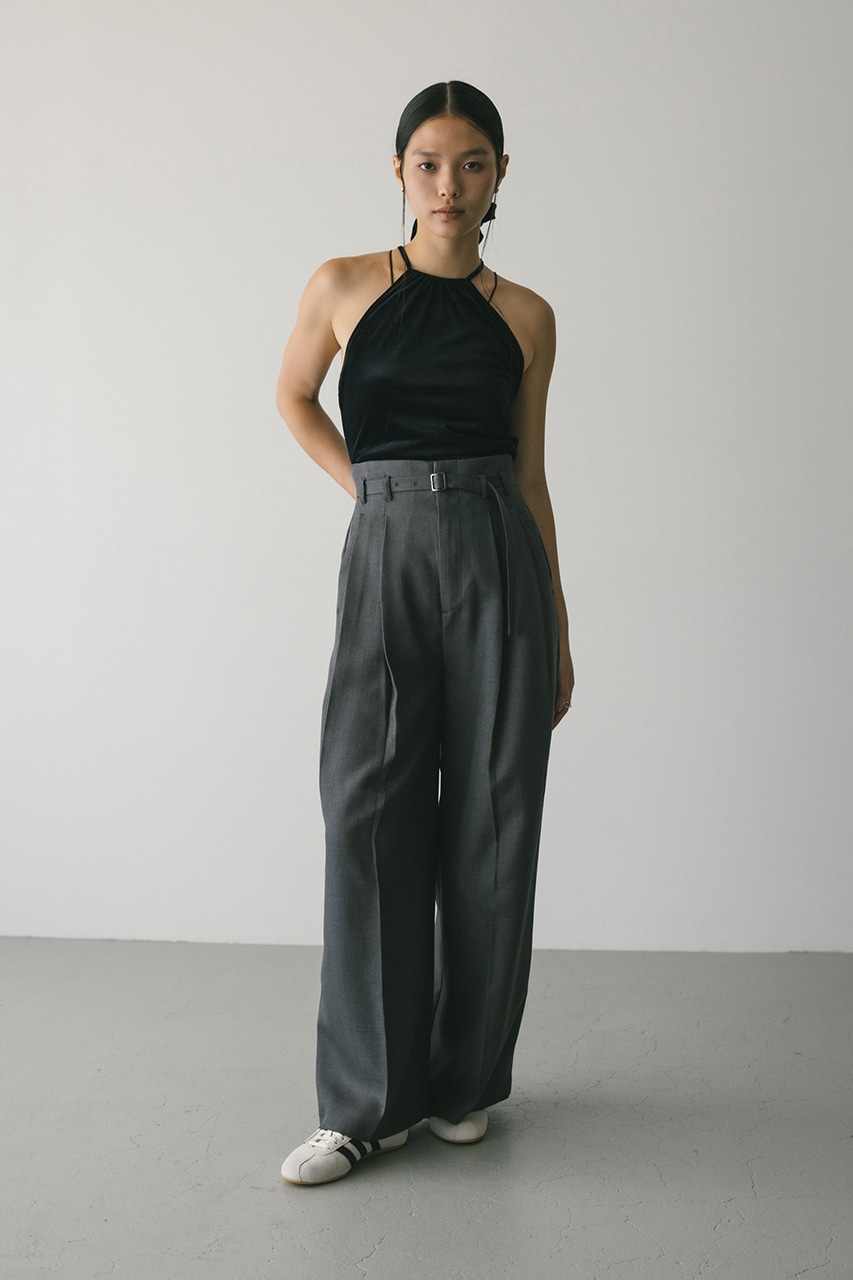 大人の抜け感とおしゃれ見えが叶うハイウエストワイドパンツ。タックとセンタープレスでスタイルアップに導きます。ウエストバックゴム仕様。同素材の細ベルト付き。500IAS30-1691(ボクシーダブルテーラードジャケット)とセットアップ着用可能。透け感なし、ストレッチややあり。