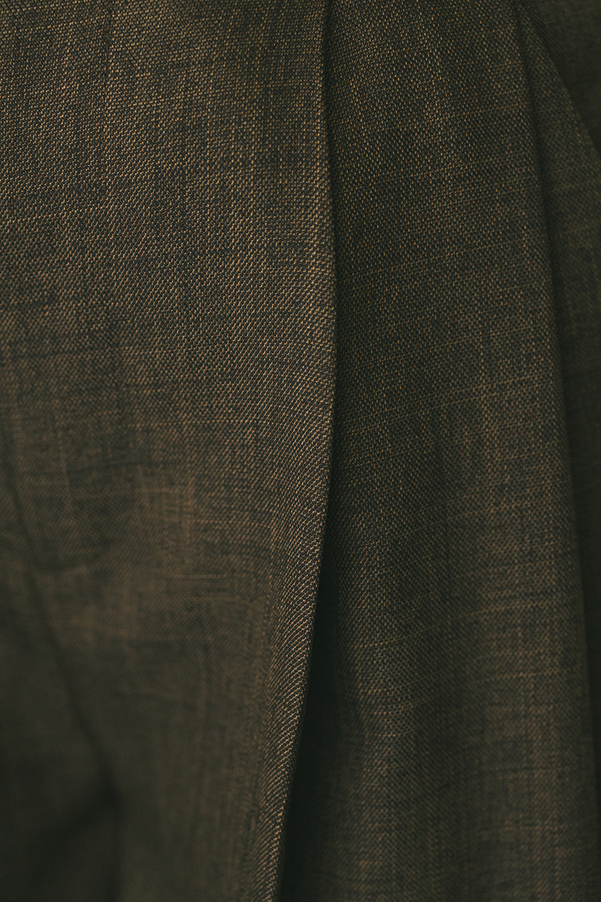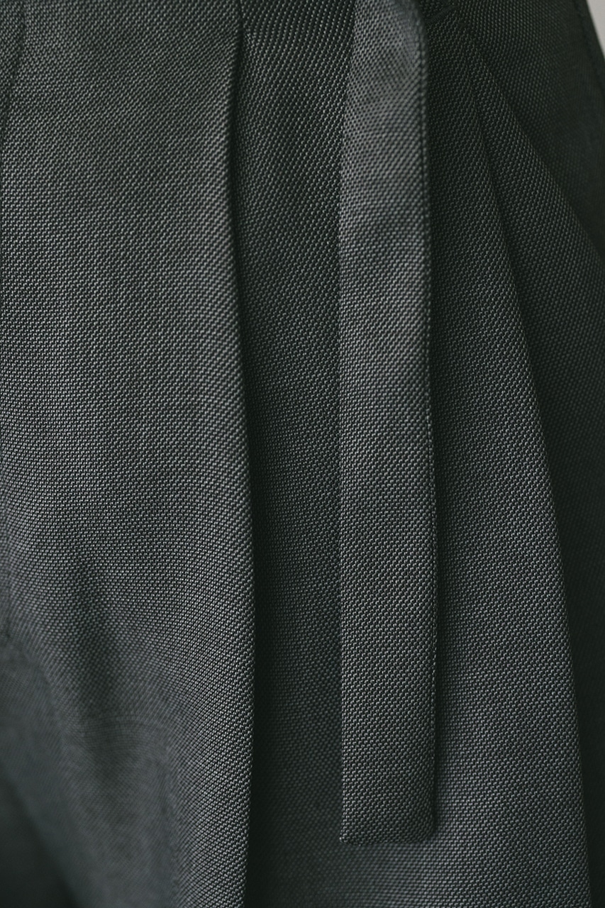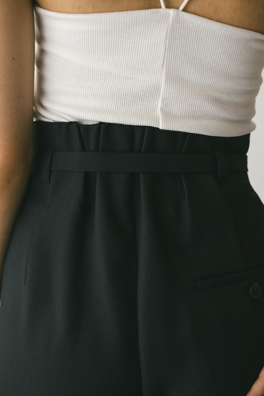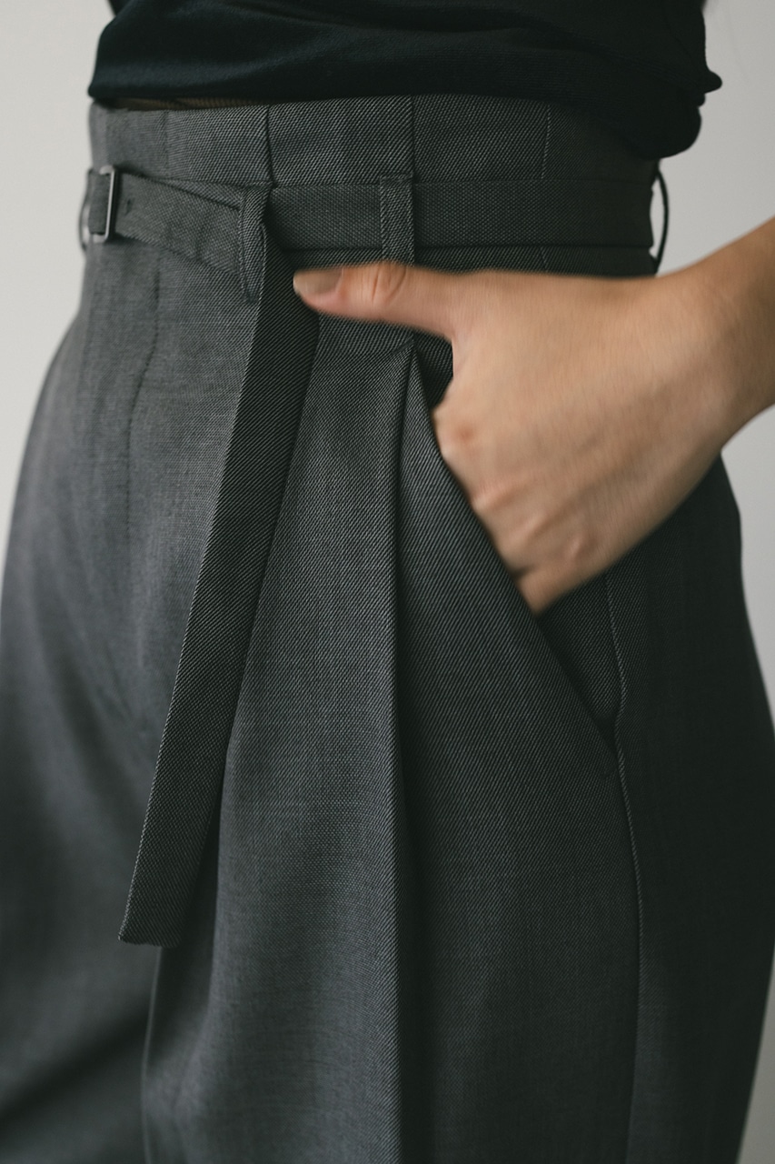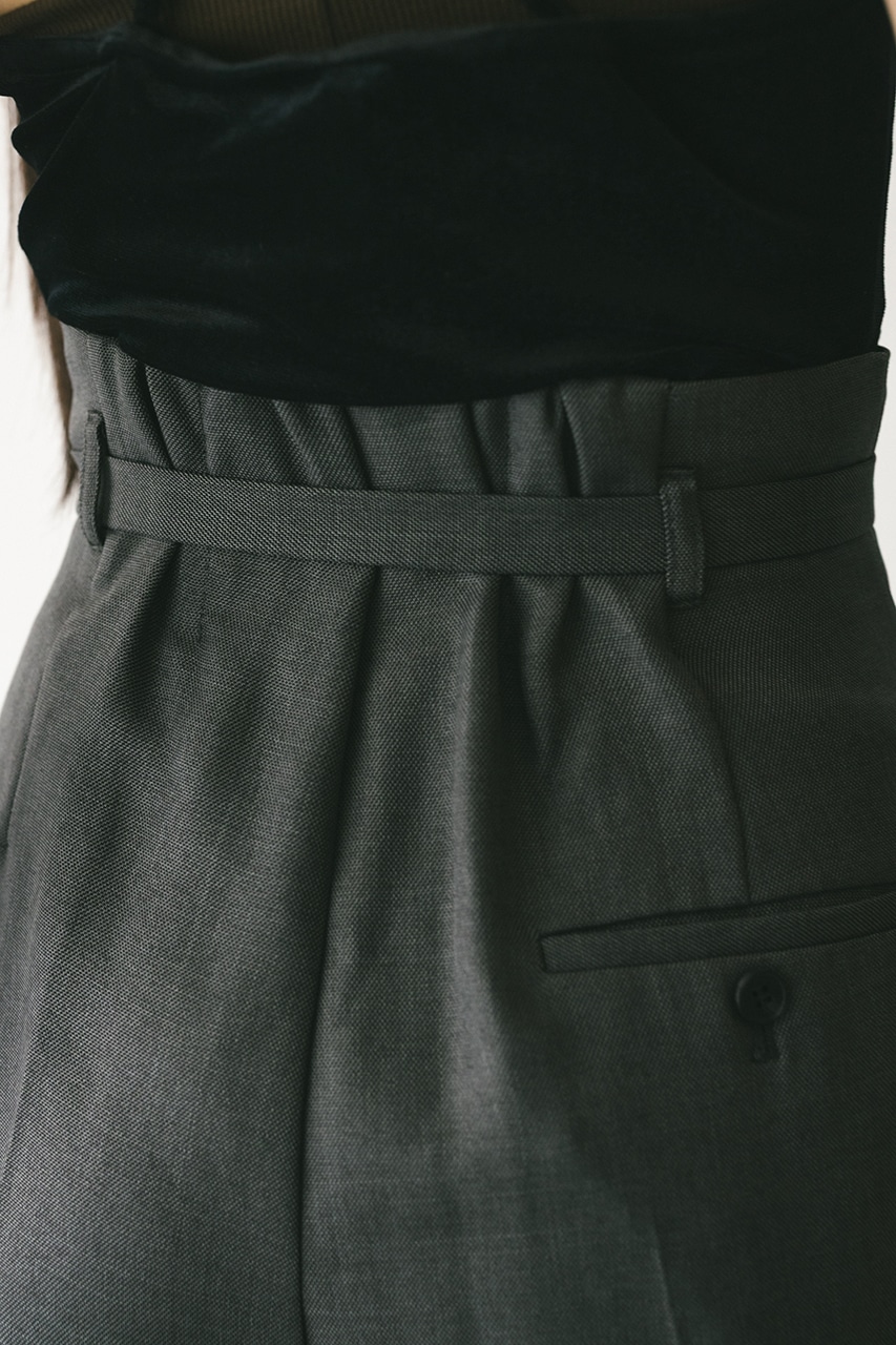大人の抜け感とおしゃれ見えが叶うハイウエストワイドパンツ。タックとセンタープレスでスタイルアップに導きます。ウエストバックゴム仕様。同素材の細ベルト付き。500IAS30-1691(ボクシーダブルテーラードジャケット)とセットアップ着用可能。透け感なし、ストレッチややあり。