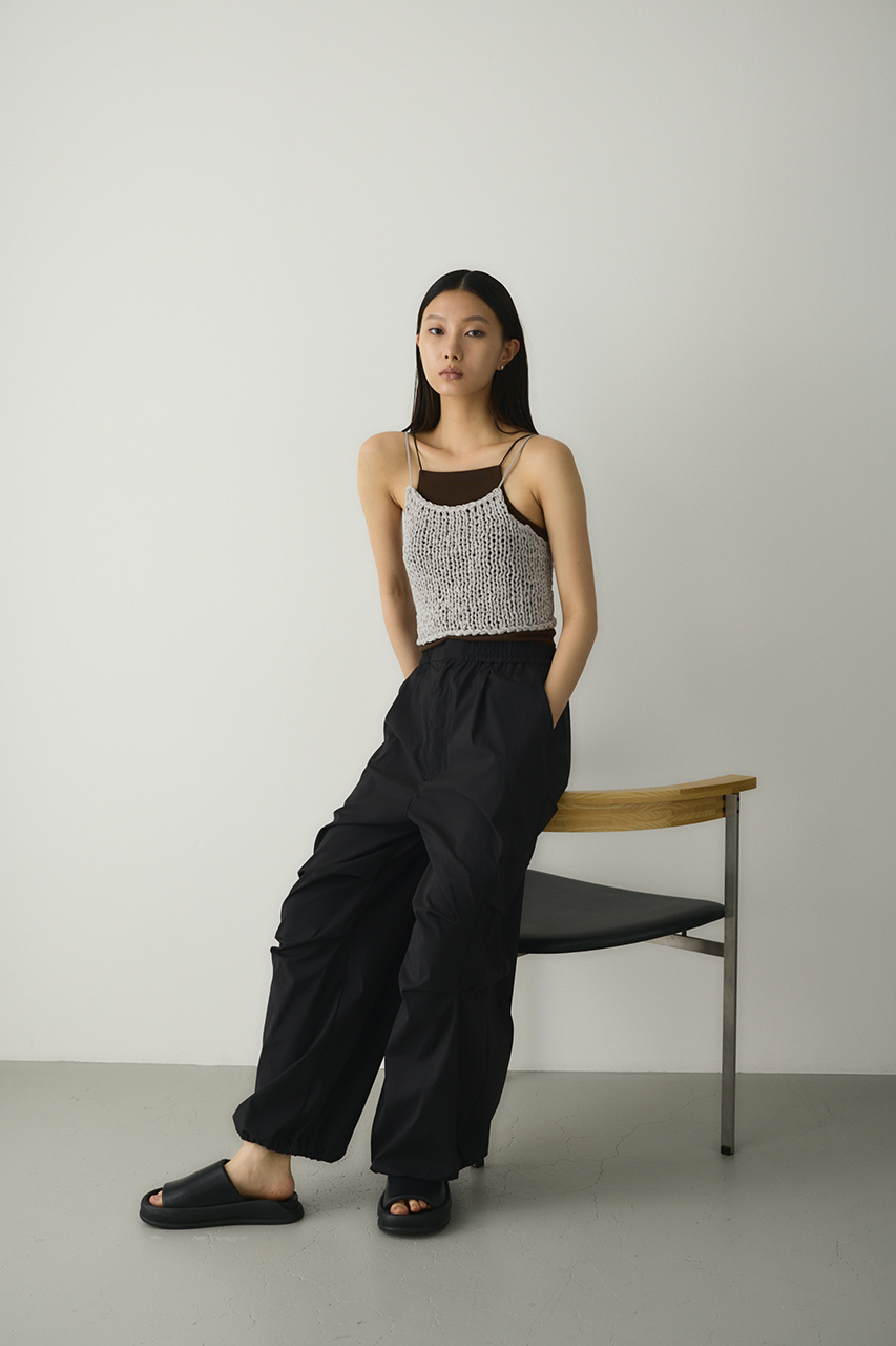 ゆったりとしたワイドシルエットとビックアウトポケット、ダーツデザインが可愛いアクティブパンツ。裾はドロストコードデティールでバルーンシルエットにも調整可能。スタイリングやシーンに合わせて変えられます。ウエストゴム仕様。ストレッチややあり、透け感なし。