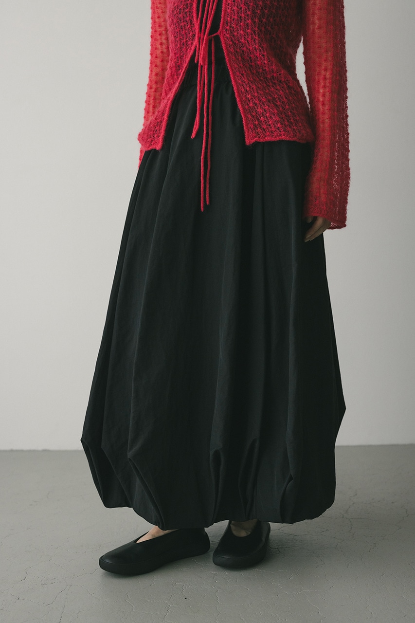 ドライでマットなナイロンタッチ素材でふんわり仕上げた華やかなバルーンギャザースカート。裾にタックを入れ、モードなボリュームにこだわった一枚です。ウエストゴム仕様。透け感なし、ストレッチなし。