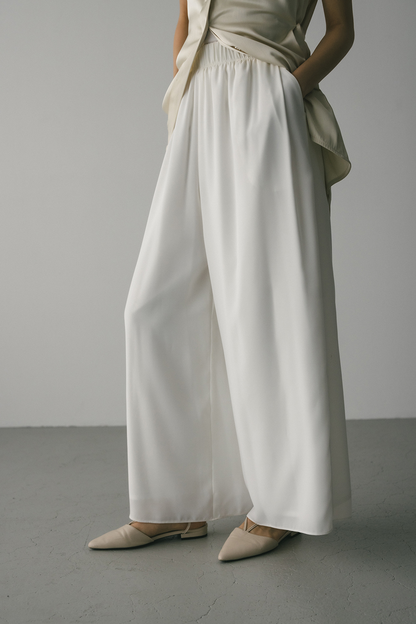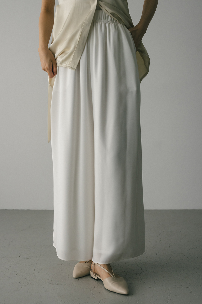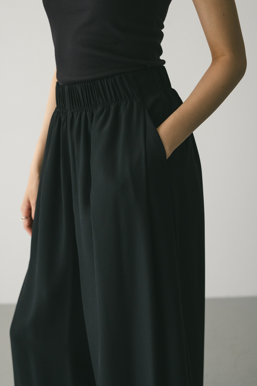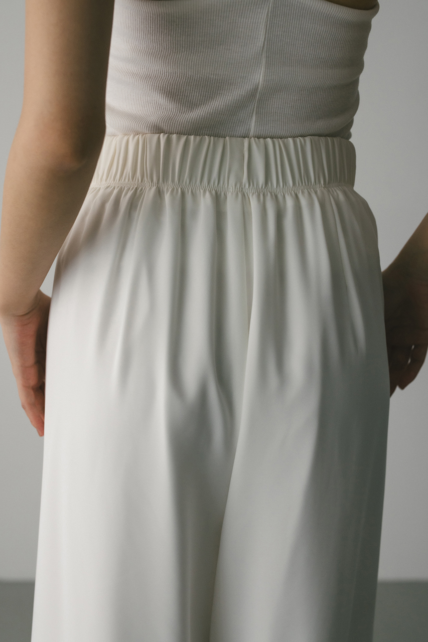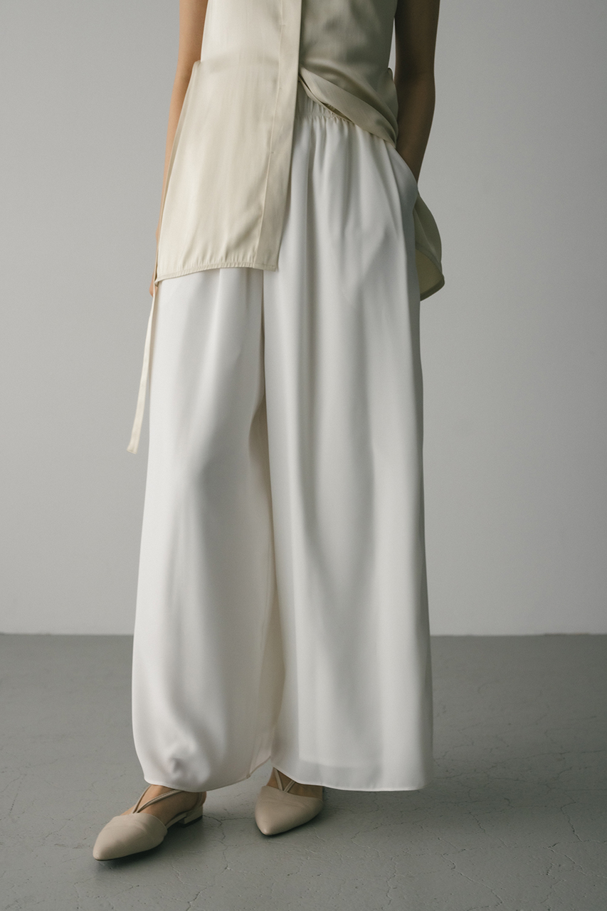 膨らみ感のあるサテンを裏使いにしたリラックスワイドパンツ。素材の落ち感とふくらみが美しいラインを作ります。ウエストゴム仕様、ウエスト内側には調整可能な紐付き。透け感なし、ストレッチなし。
