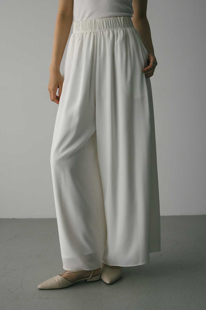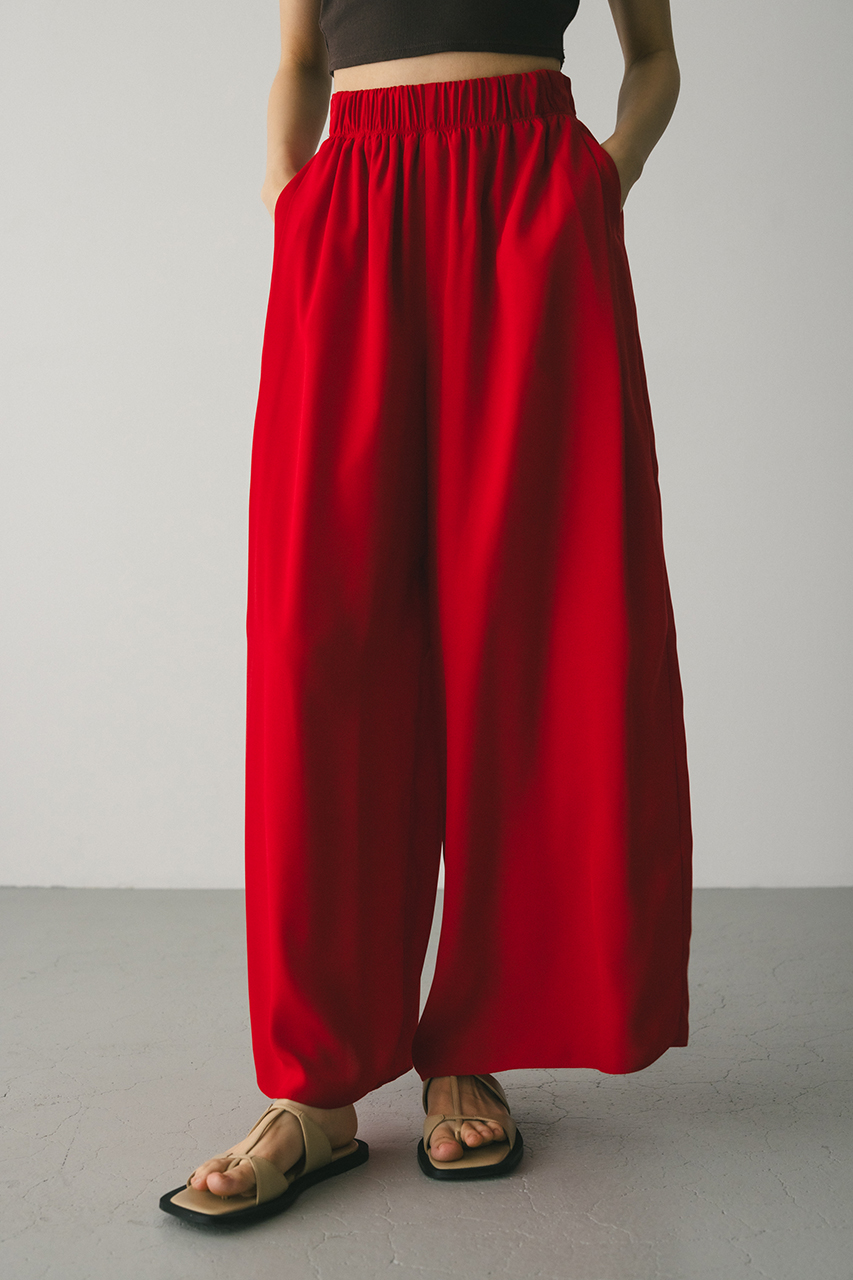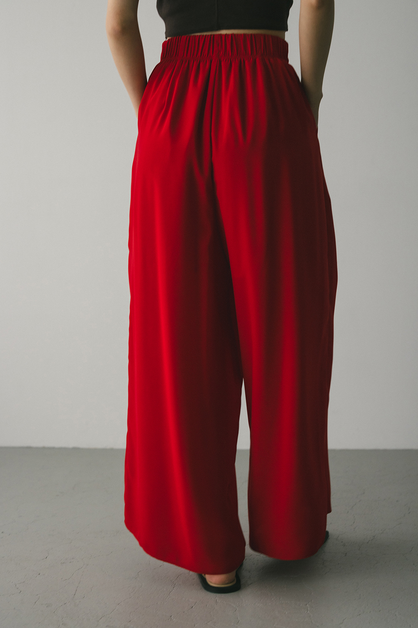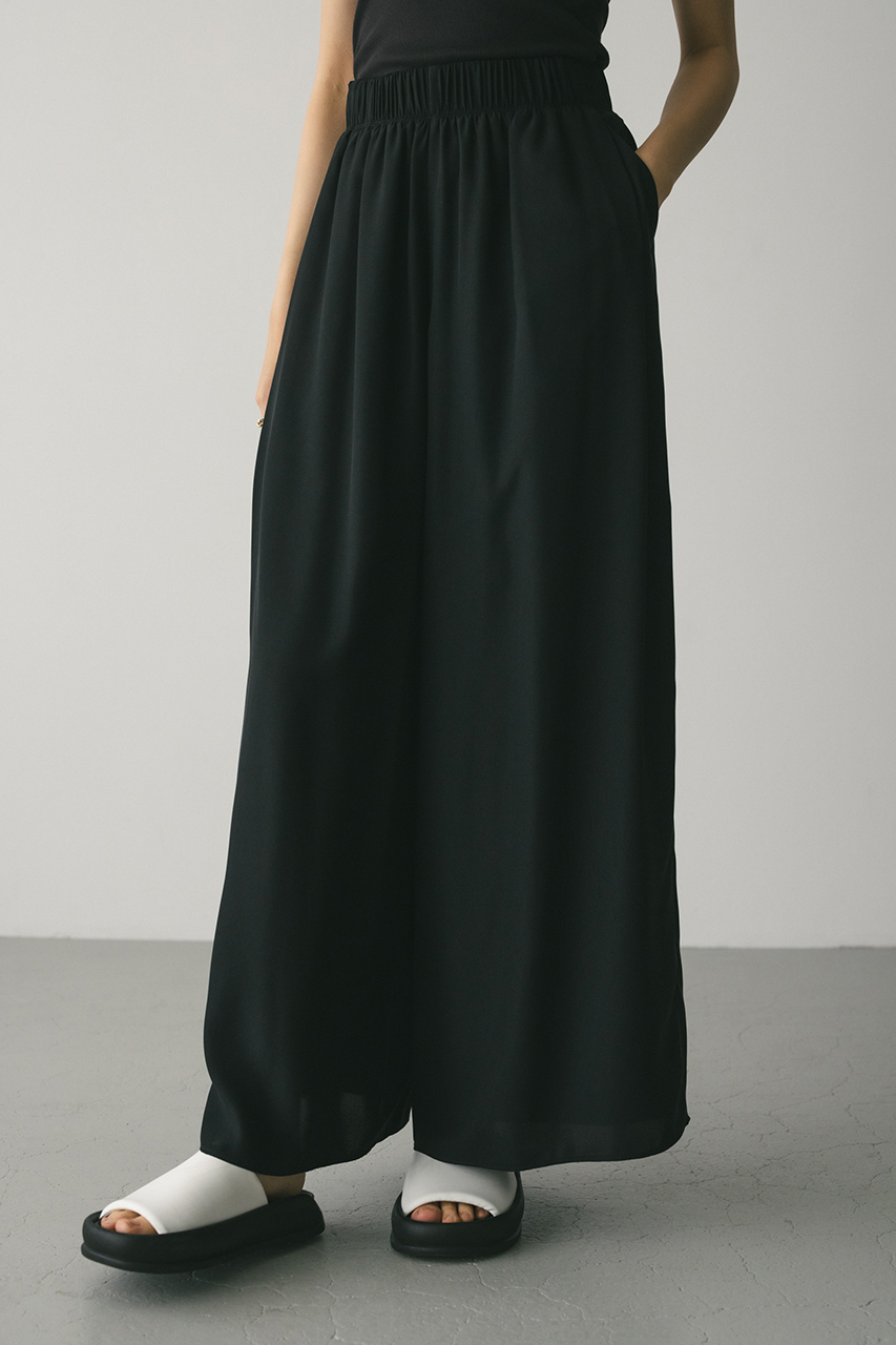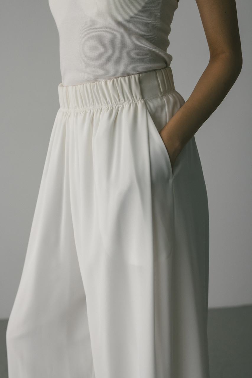 膨らみ感のあるサテンを裏使いにしたリラックスワイドパンツ。素材の落ち感とふくらみが美しいラインを作ります。ウエストゴム仕様、ウエスト内側には調整可能な紐付き。透け感なし、ストレッチなし。