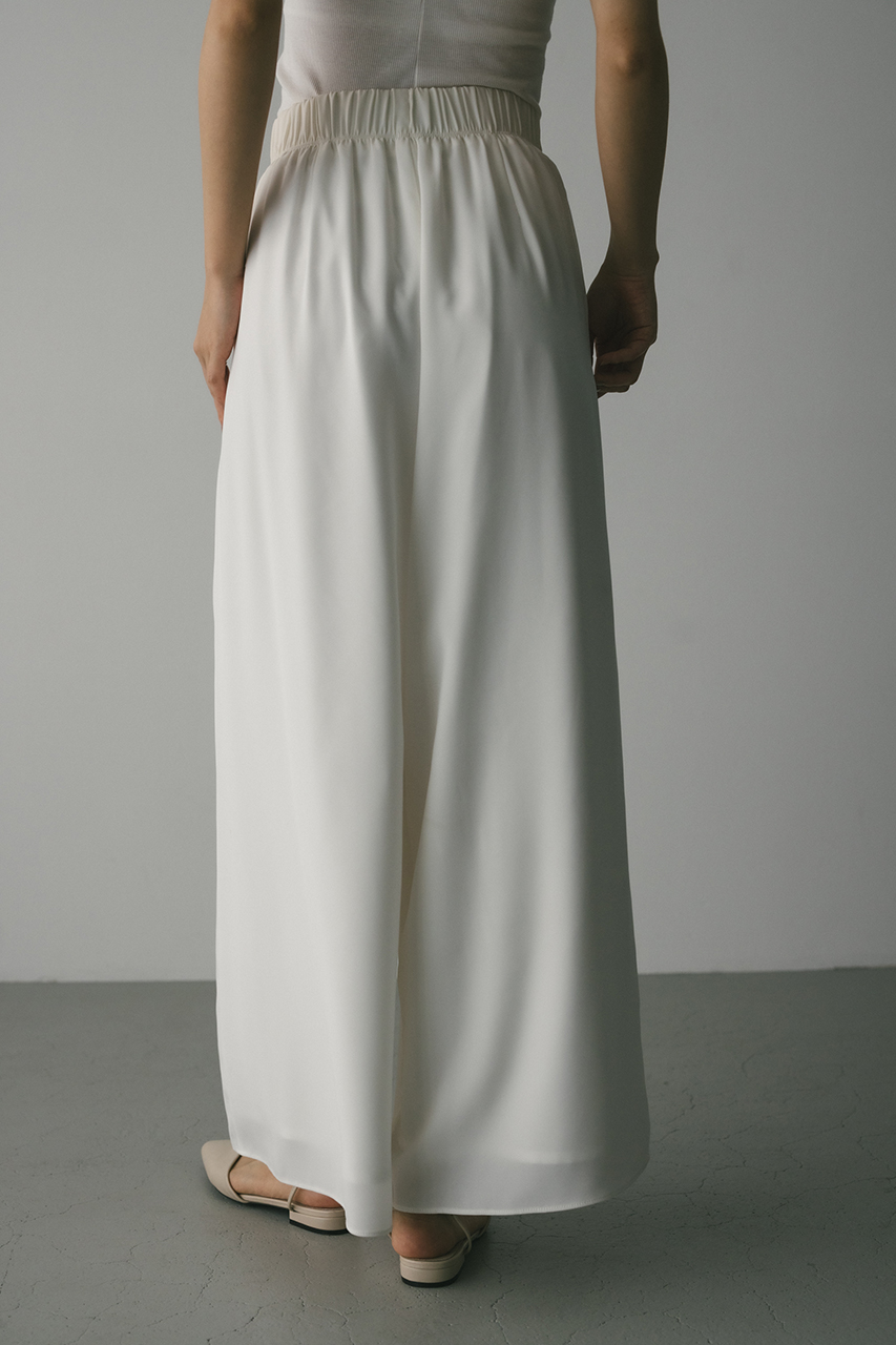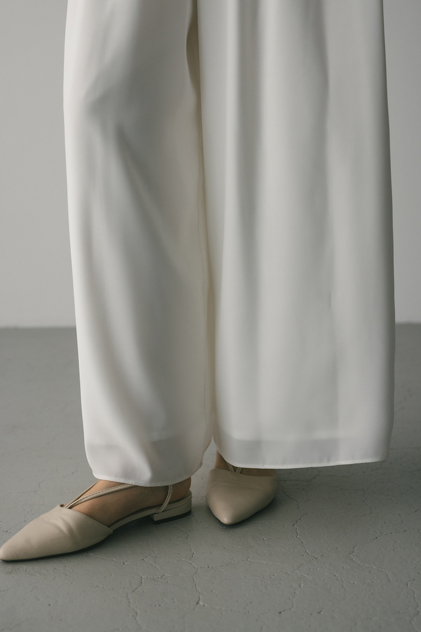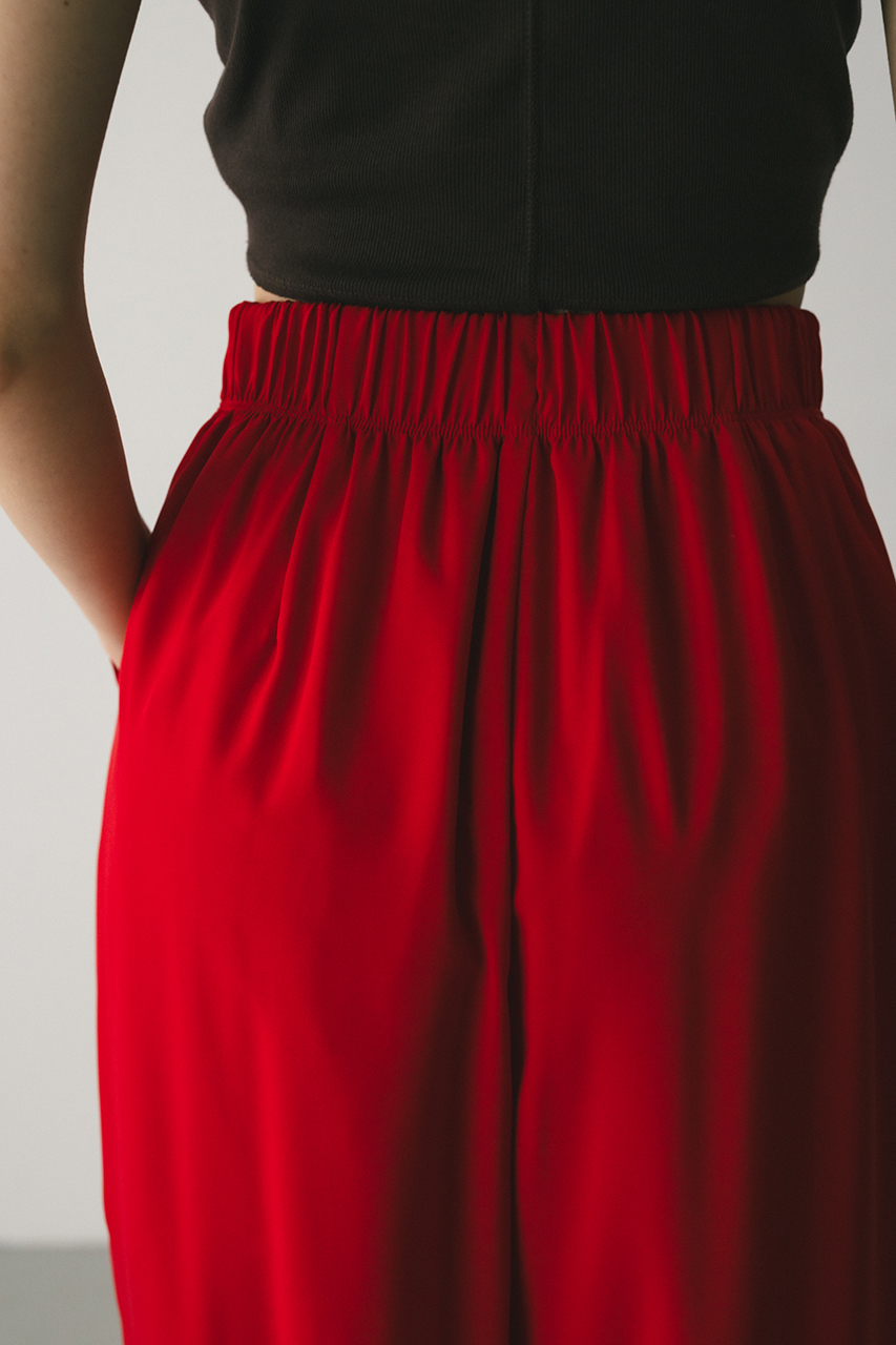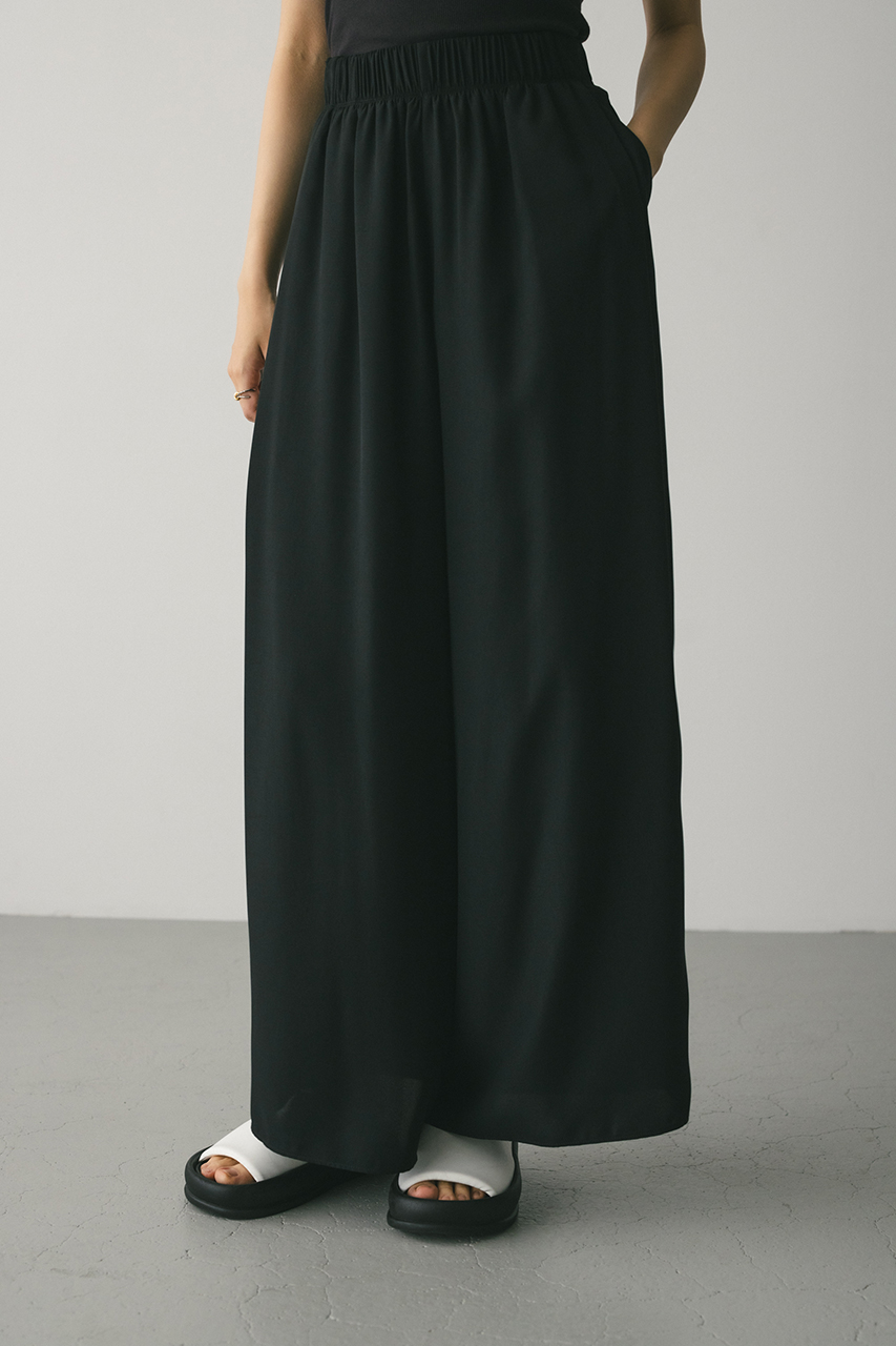 膨らみ感のあるサテンを裏使いにしたリラックスワイドパンツ。素材の落ち感とふくらみが美しいラインを作ります。ウエストゴム仕様、ウエスト内側には調整可能な紐付き。透け感なし、ストレッチなし。