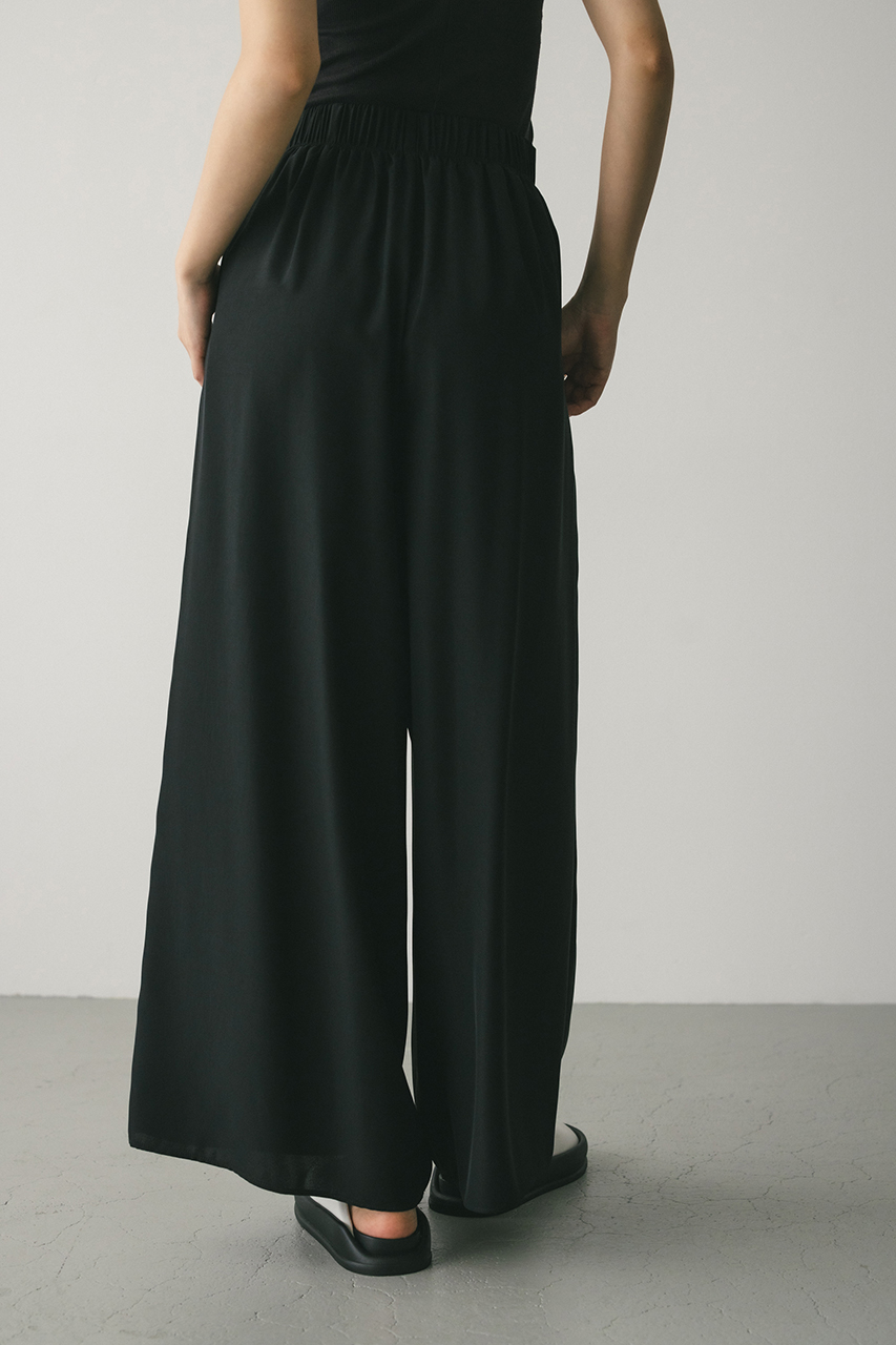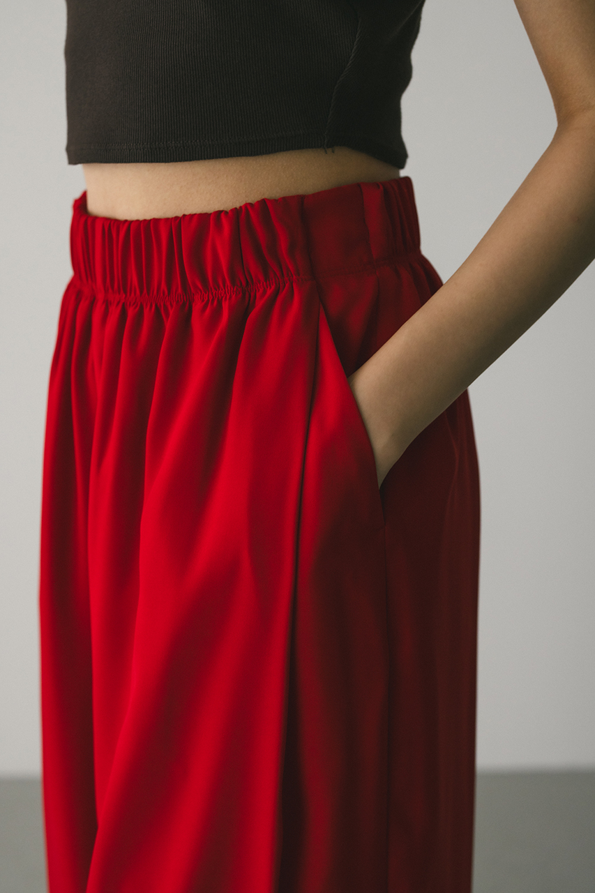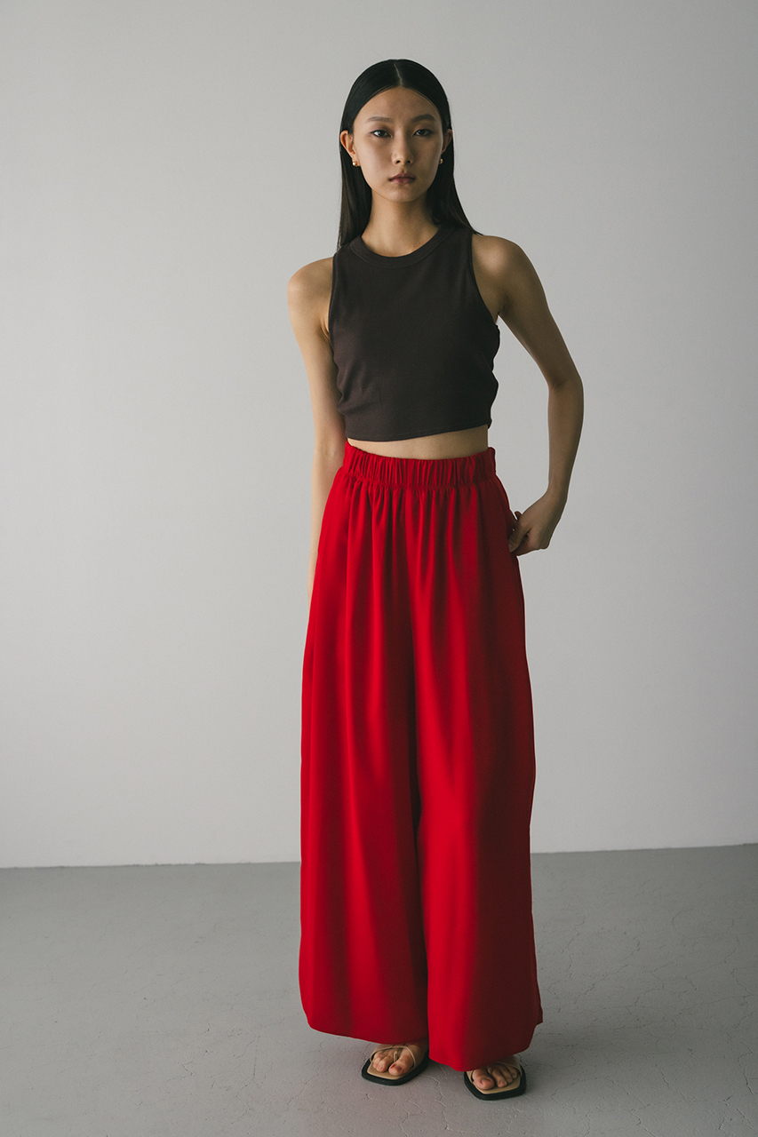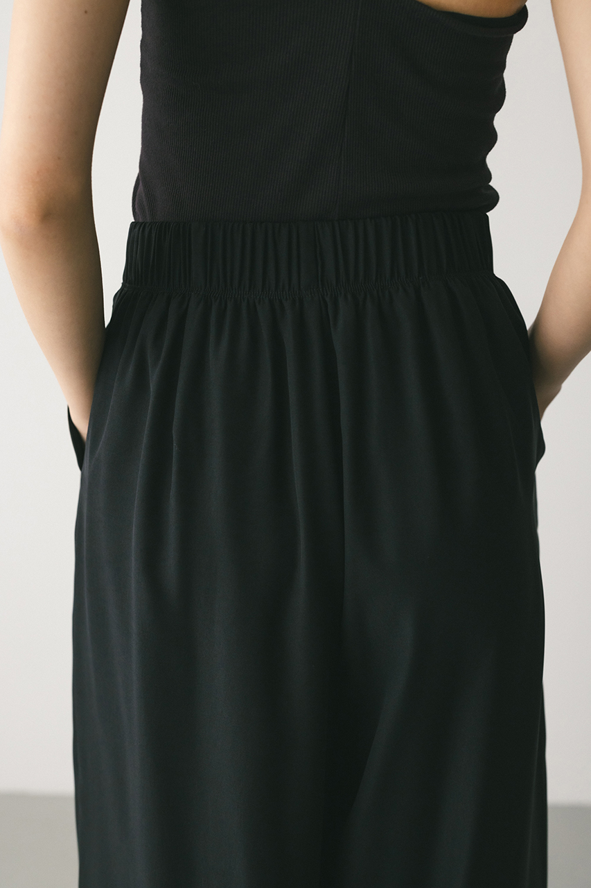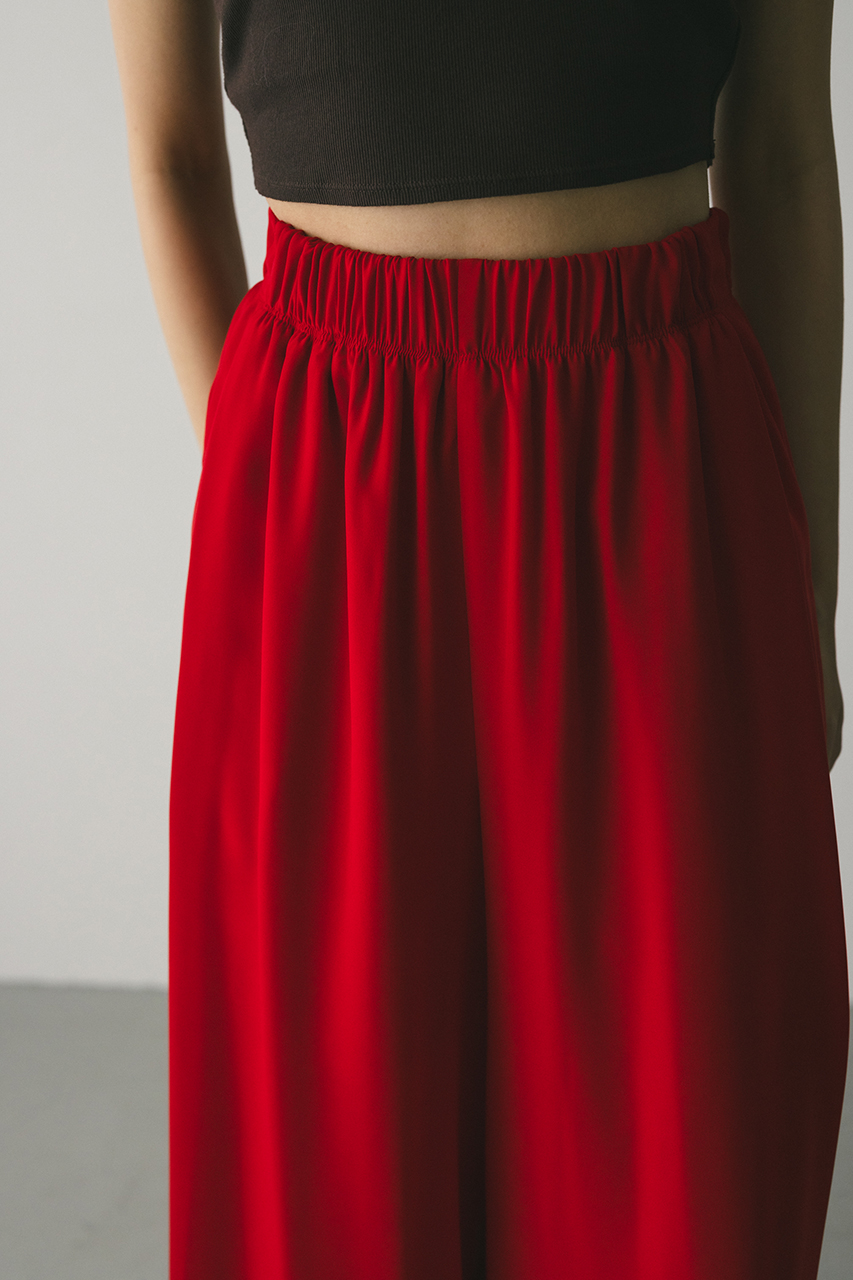 膨らみ感のあるサテンを裏使いにしたリラックスワイドパンツ。素材の落ち感とふくらみが美しいラインを作ります。ウエストゴム仕様、ウエスト内側には調整可能な紐付き。透け感なし、ストレッチなし。