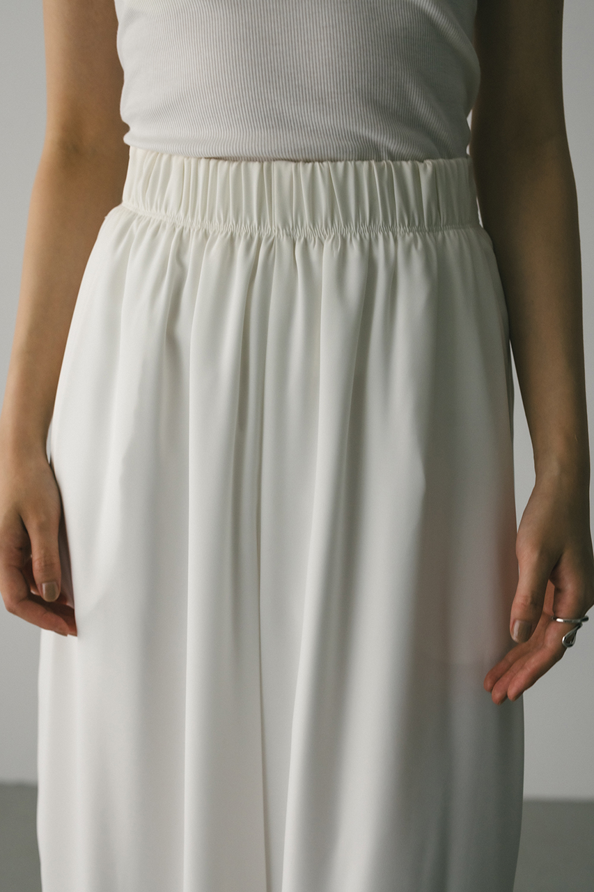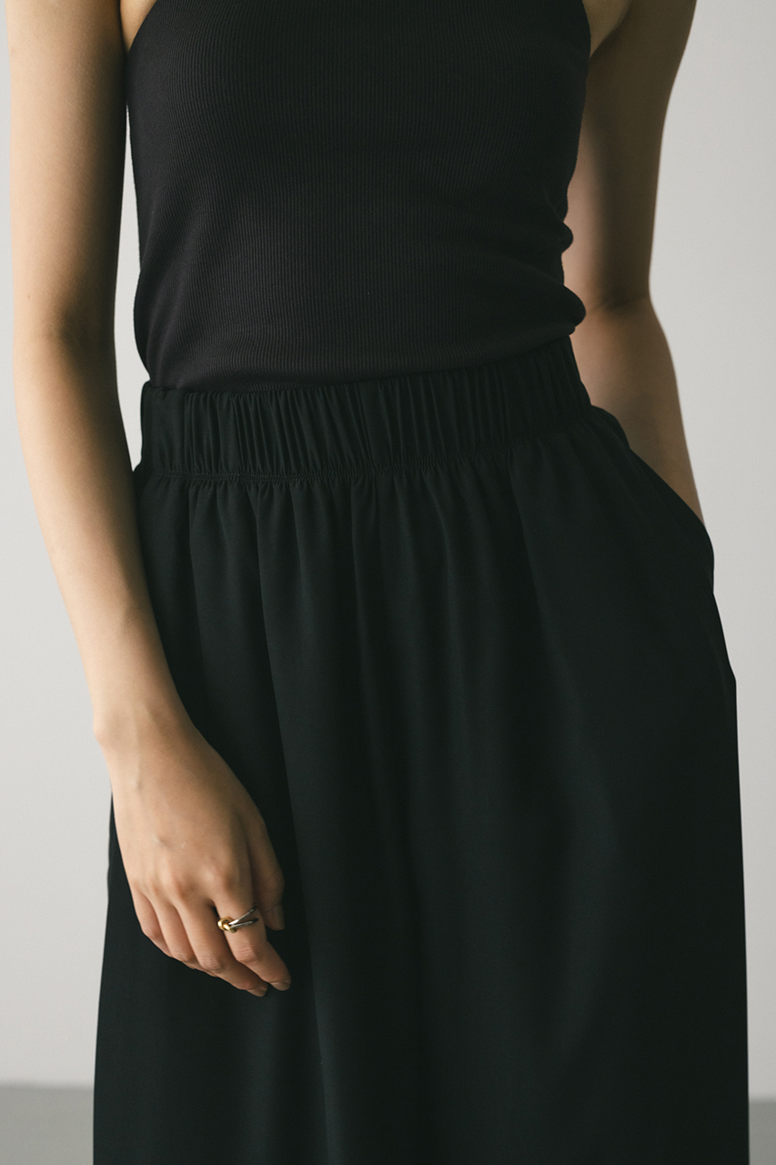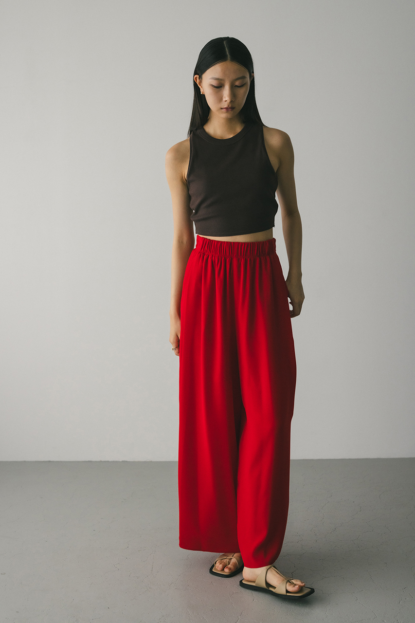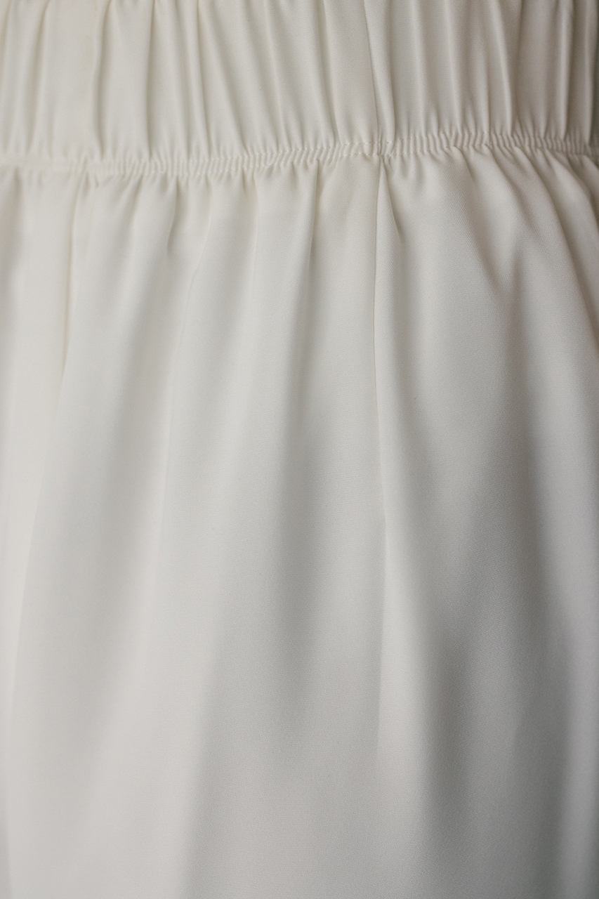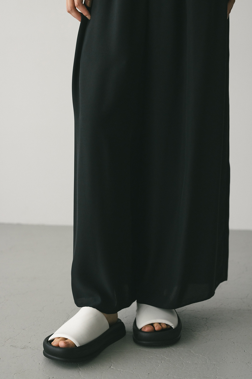 膨らみ感のあるサテンを裏使いにしたリラックスワイドパンツ。素材の落ち感とふくらみが美しいラインを作ります。ウエストゴム仕様、ウエスト内側には調整可能な紐付き。透け感なし、ストレッチなし。