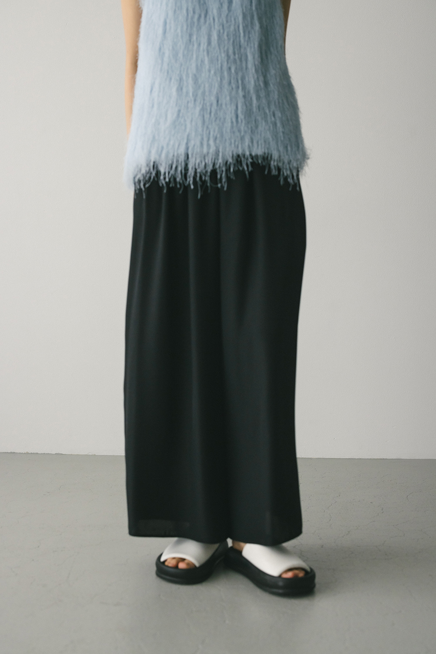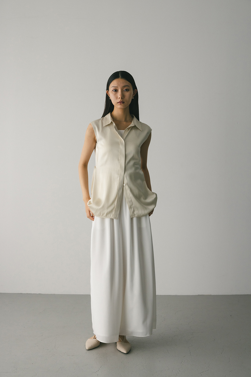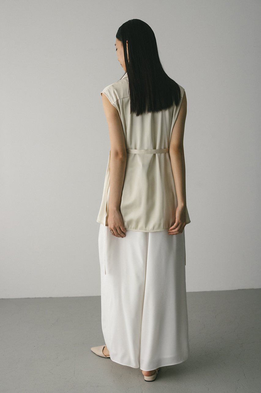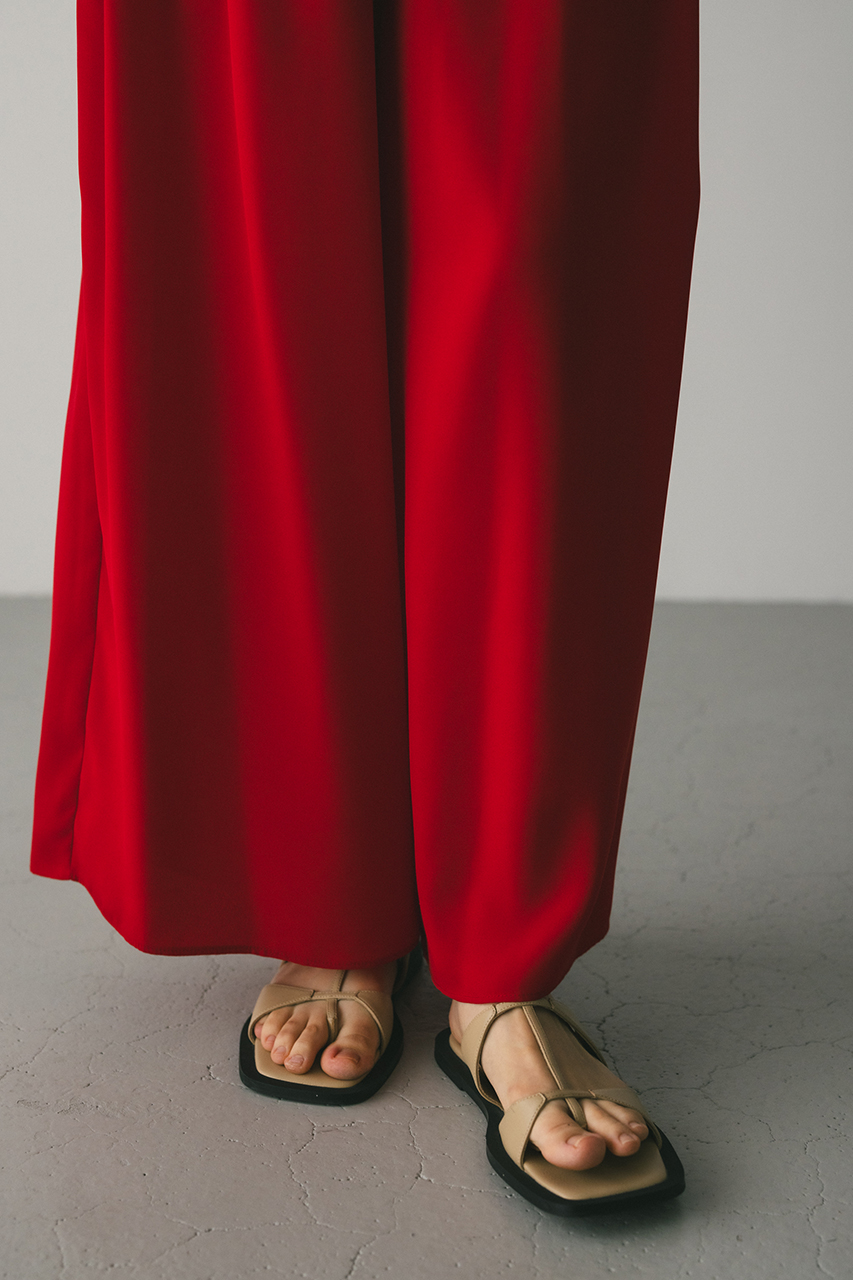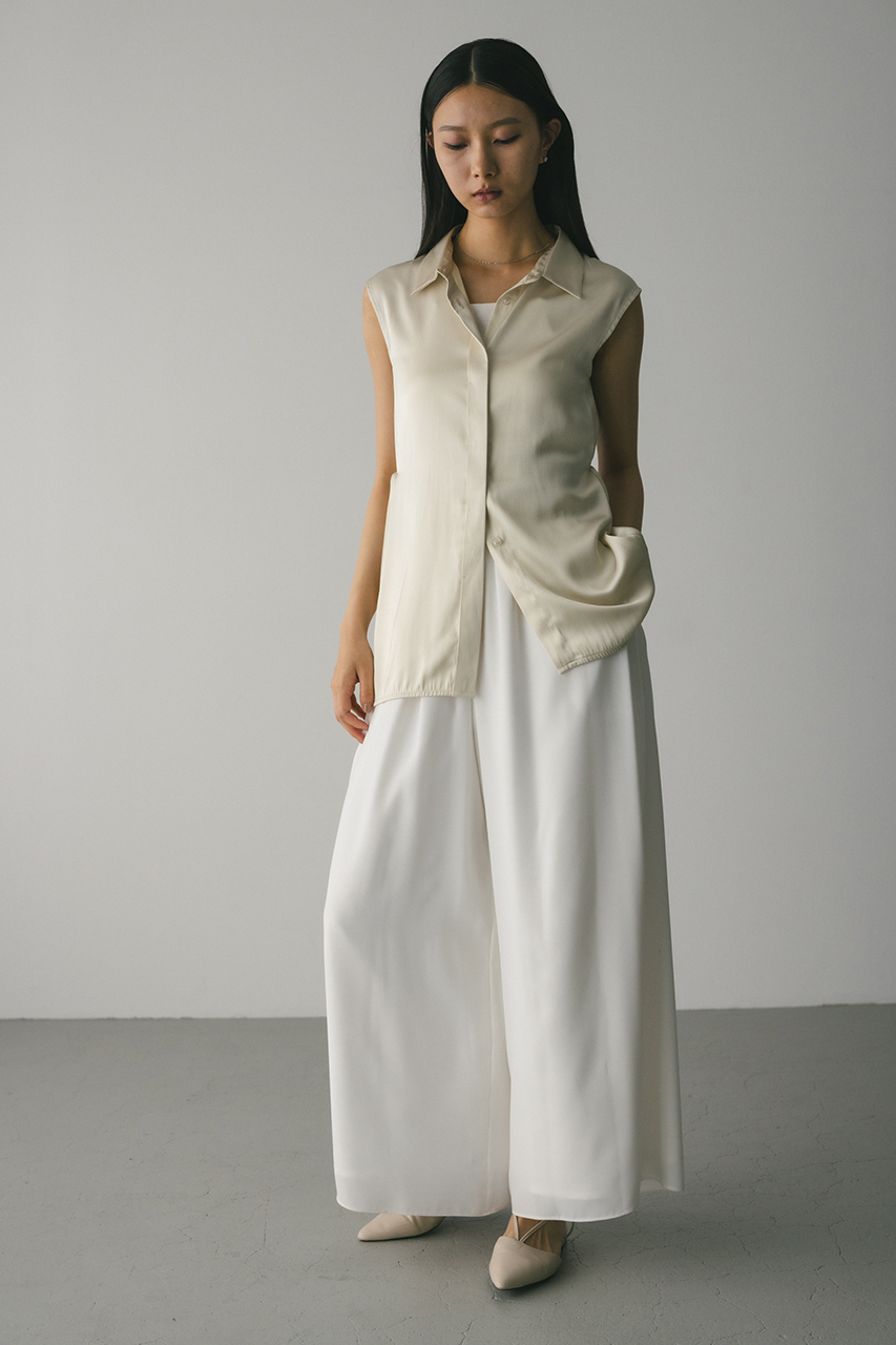 膨らみ感のあるサテンを裏使いにしたリラックスワイドパンツ。素材の落ち感とふくらみが美しいラインを作ります。ウエストゴム仕様、ウエスト内側には調整可能な紐付き。透け感なし、ストレッチなし。