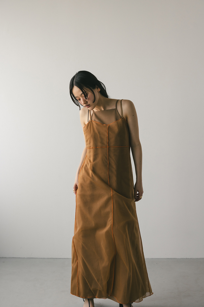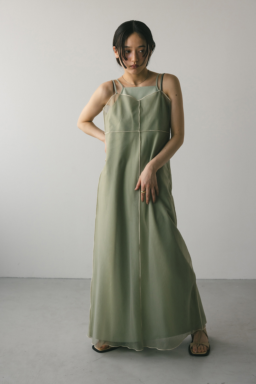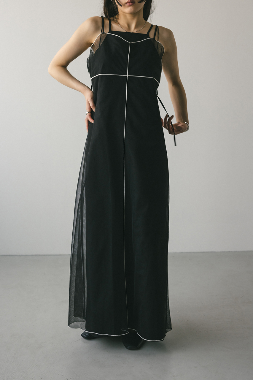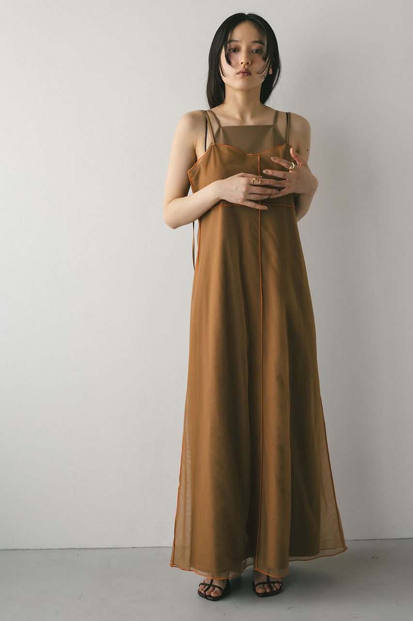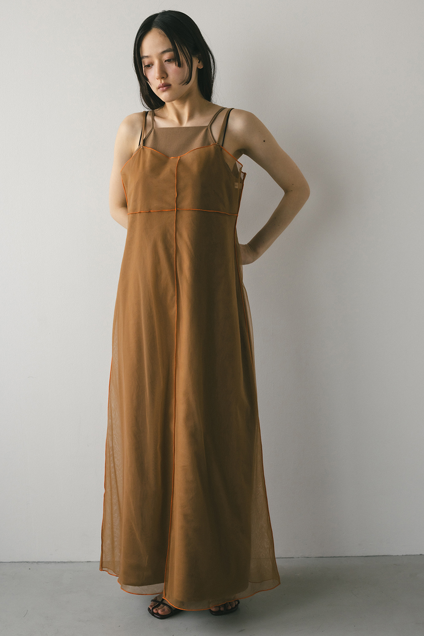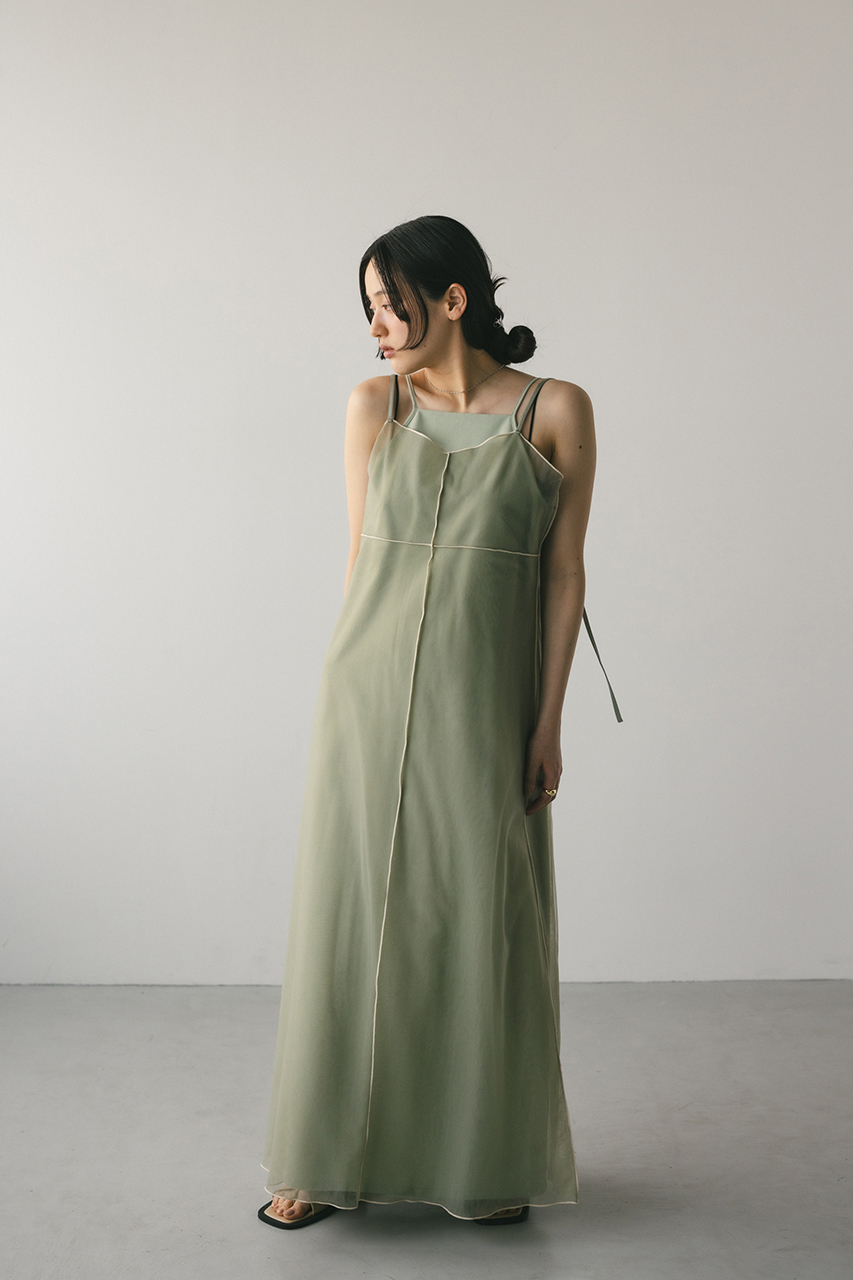 映えるチュールコンビワンピース。すとんとした美しいラインで仕上げたインナーワンピースはスクエアネックとバックVネックがデザインポイント。重ねるチュールワンピースは、配色メローがポイント。ニュアンスのある表情感が可愛い一枚です。チュールワンピースはデニムやスラックスなどと合わせての着用もおすすめです。透け感あり(チュールワンピース)、ストレッチあり(インナーワンピース)。