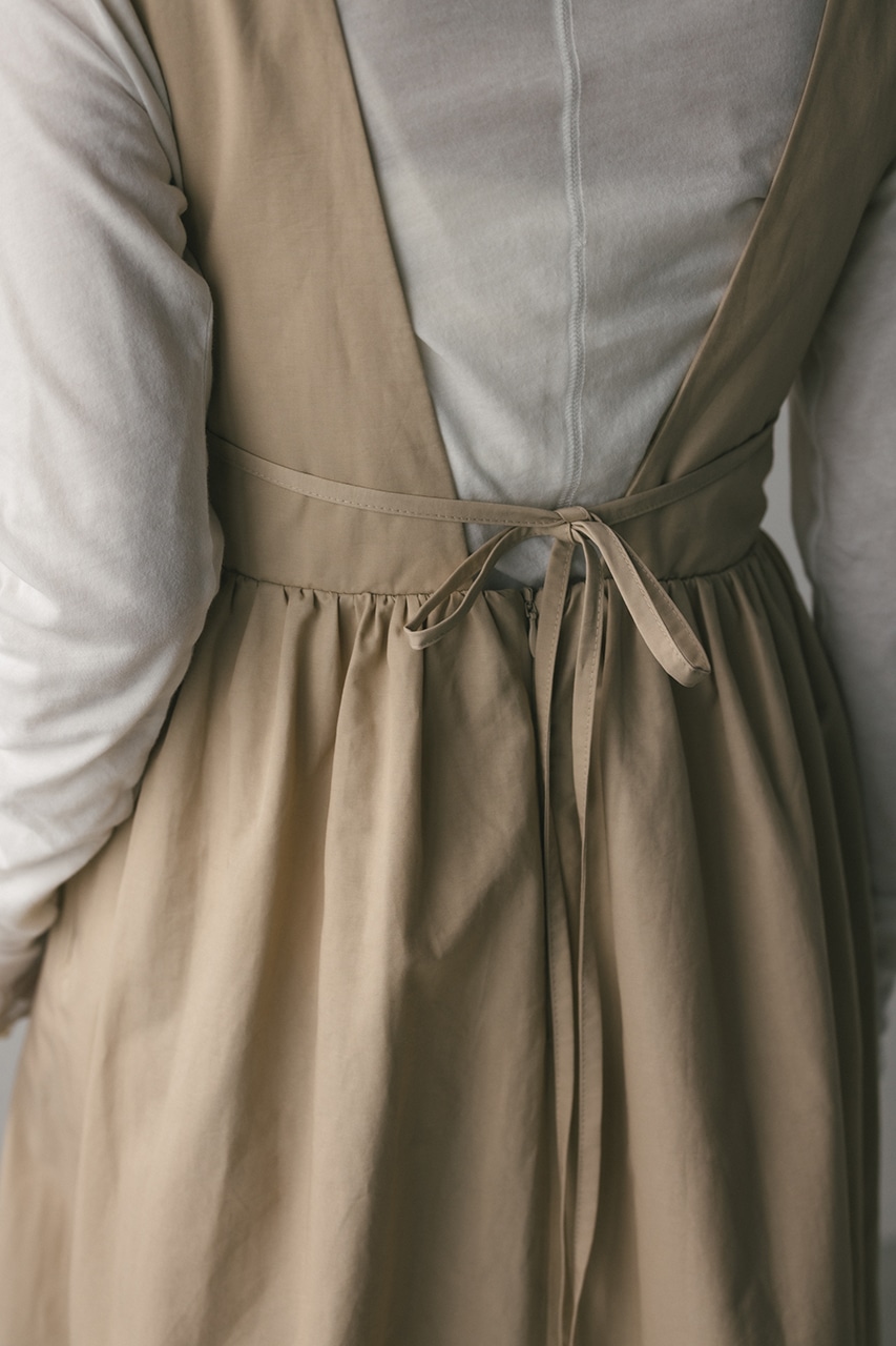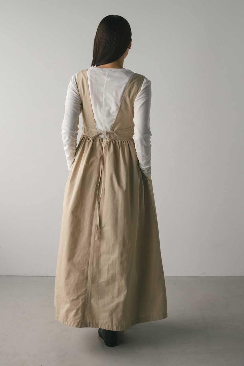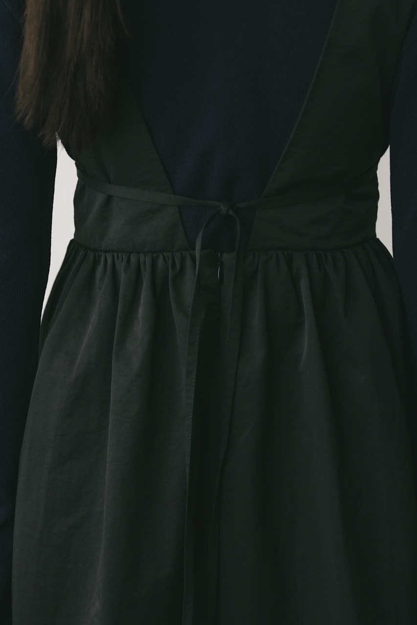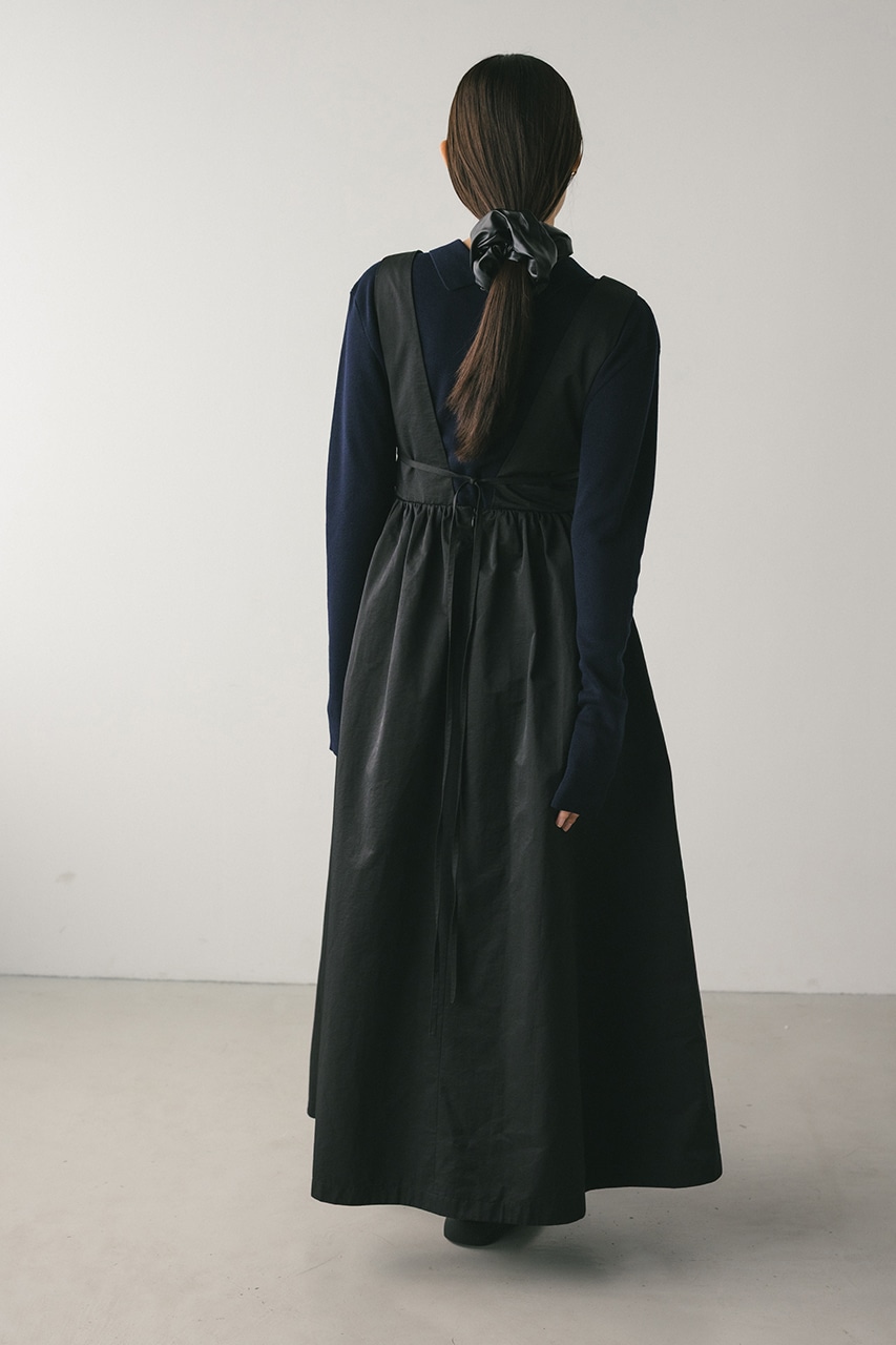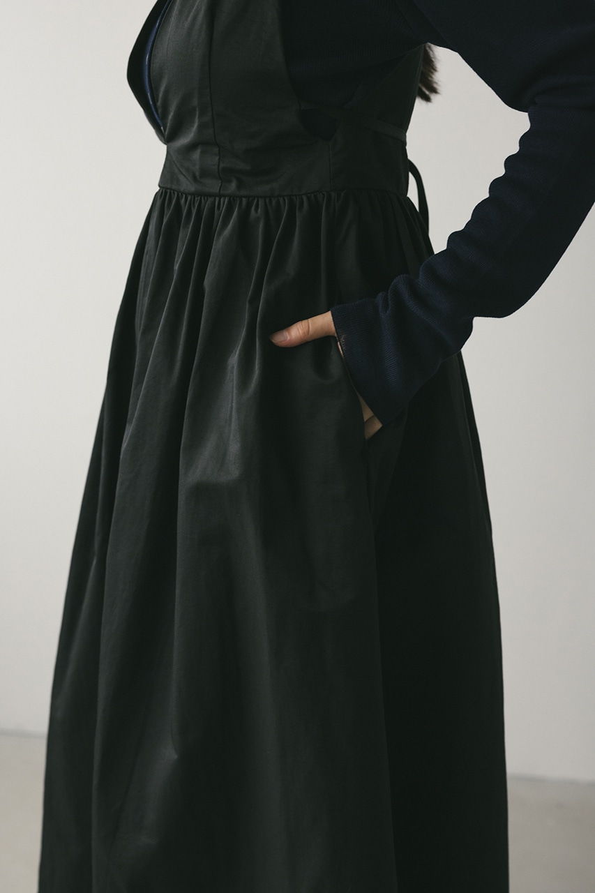 ハリ感が可愛い素材感で仕立てたスタイルアップボリュームジャンパースカート。バックリボンがデザインポイント。深いカーブネックで女性らしい抜け感をプラスしたメリハリのあるシルエットでスタイルアップ見せが叶う一枚です。透け感なし、ストレッチなし。