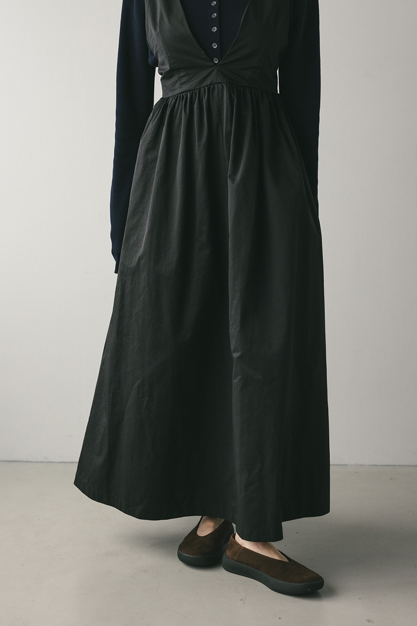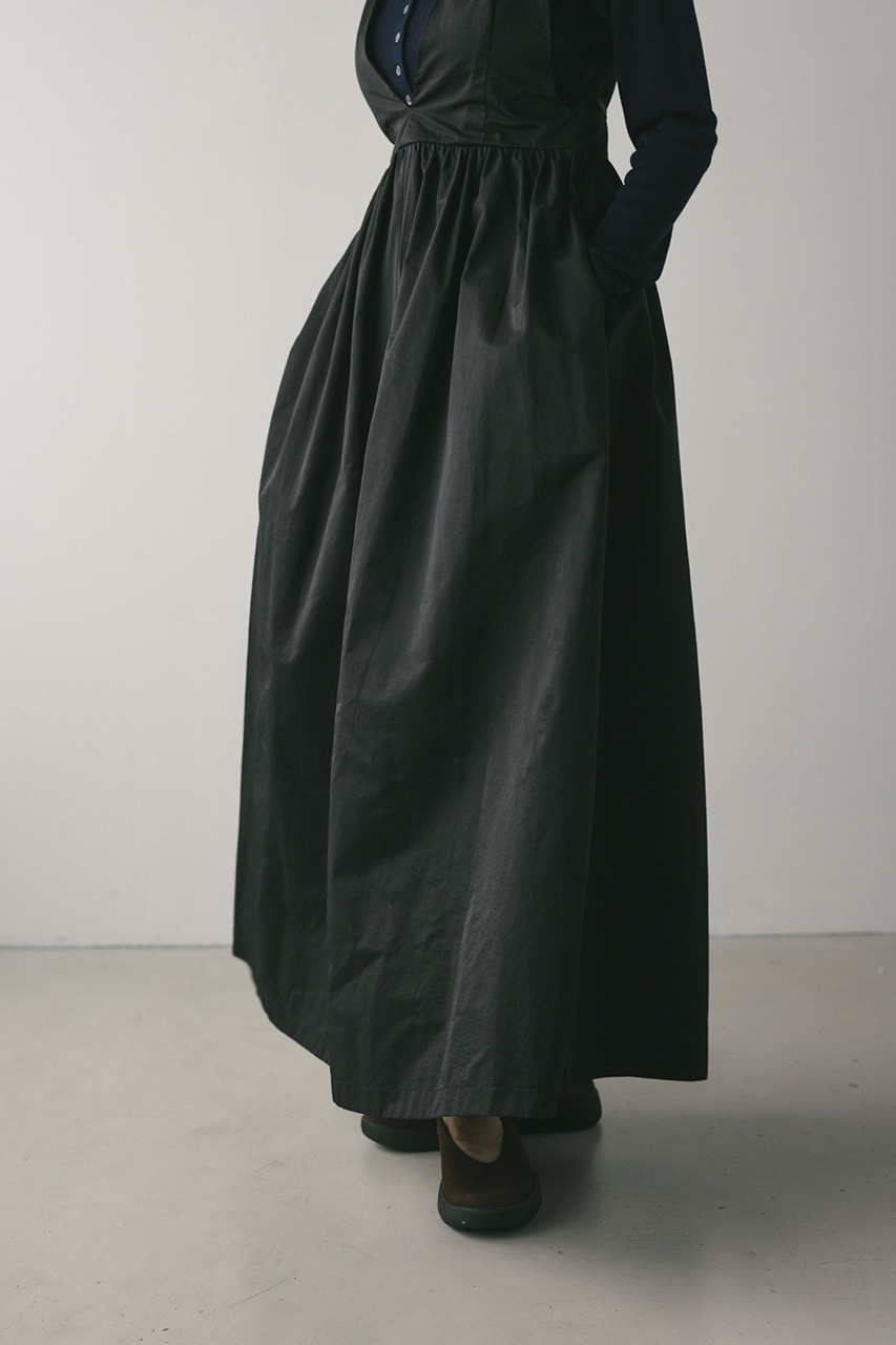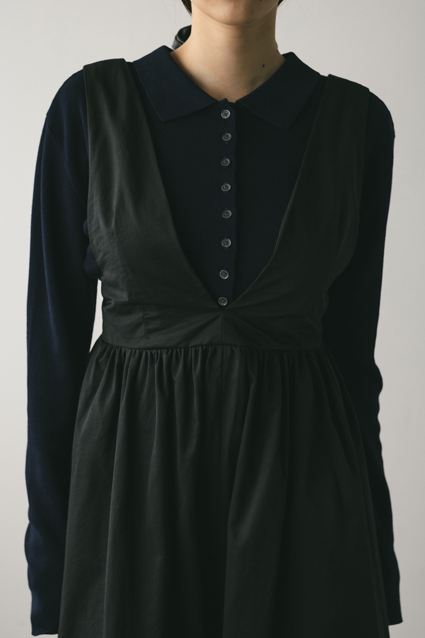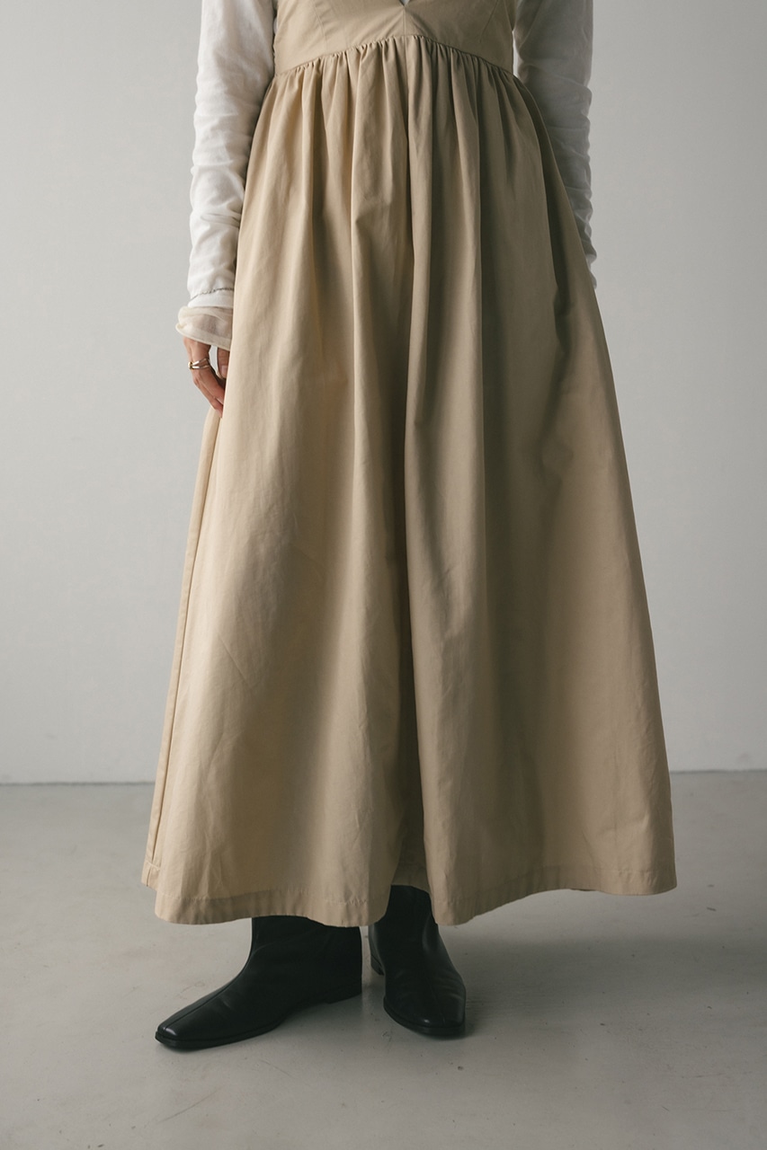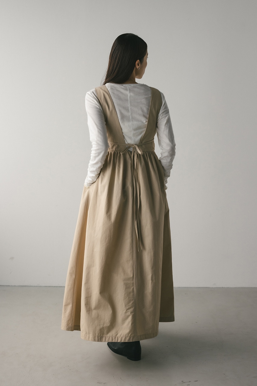 ハリ感が可愛い素材感で仕立てたスタイルアップボリュームジャンパースカート。バックリボンがデザインポイント。深いカーブネックで女性らしい抜け感をプラスしたメリハリのあるシルエットでスタイルアップ見せが叶う一枚です。透け感なし、ストレッチなし。