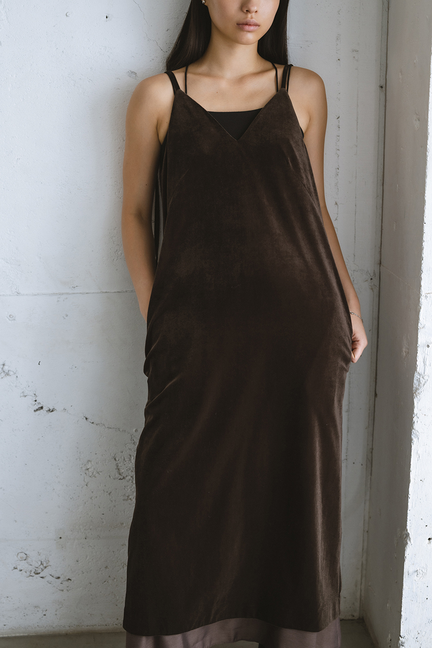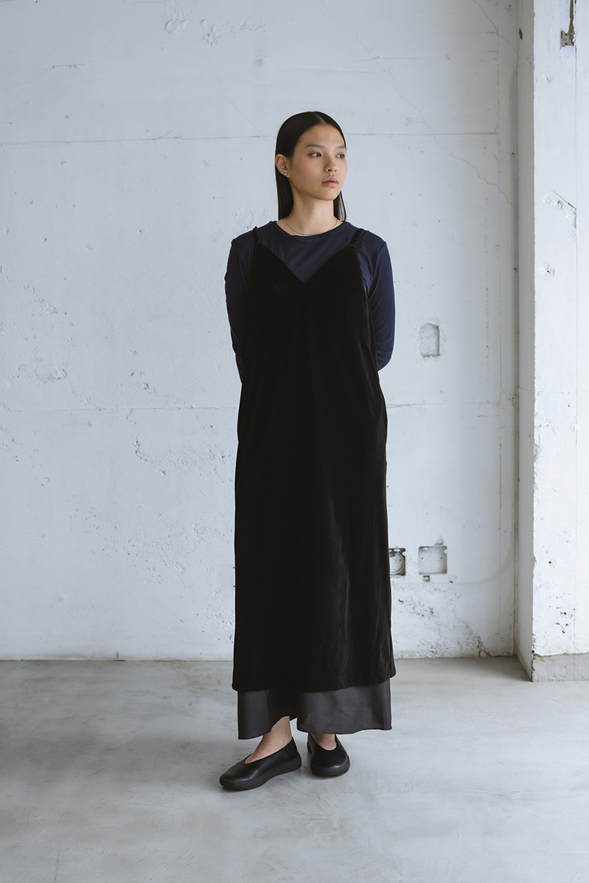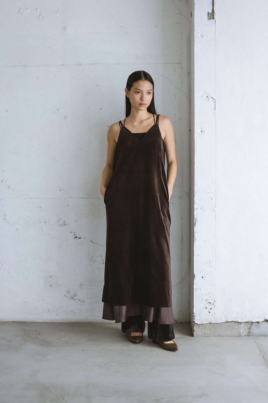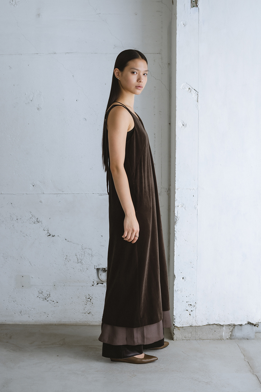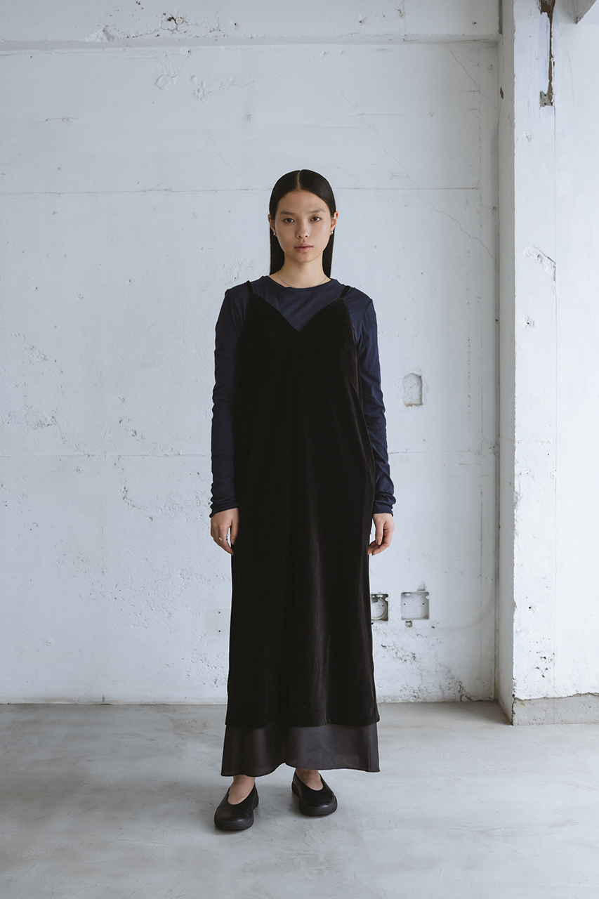 ストレッチの効いた軽くてしなやかなメッシュベロアと天然見えの布帛ラッフルヘムのレイヤーデザインが可愛いキャミワンピース。落ち着いたカラーとフレア分量を変えて動きをプラスした裾がデザインポイント。インナー次第でロングシーズン着用頂けます。透け感なし、ストレッチあり(表地)/なし(裏地)。