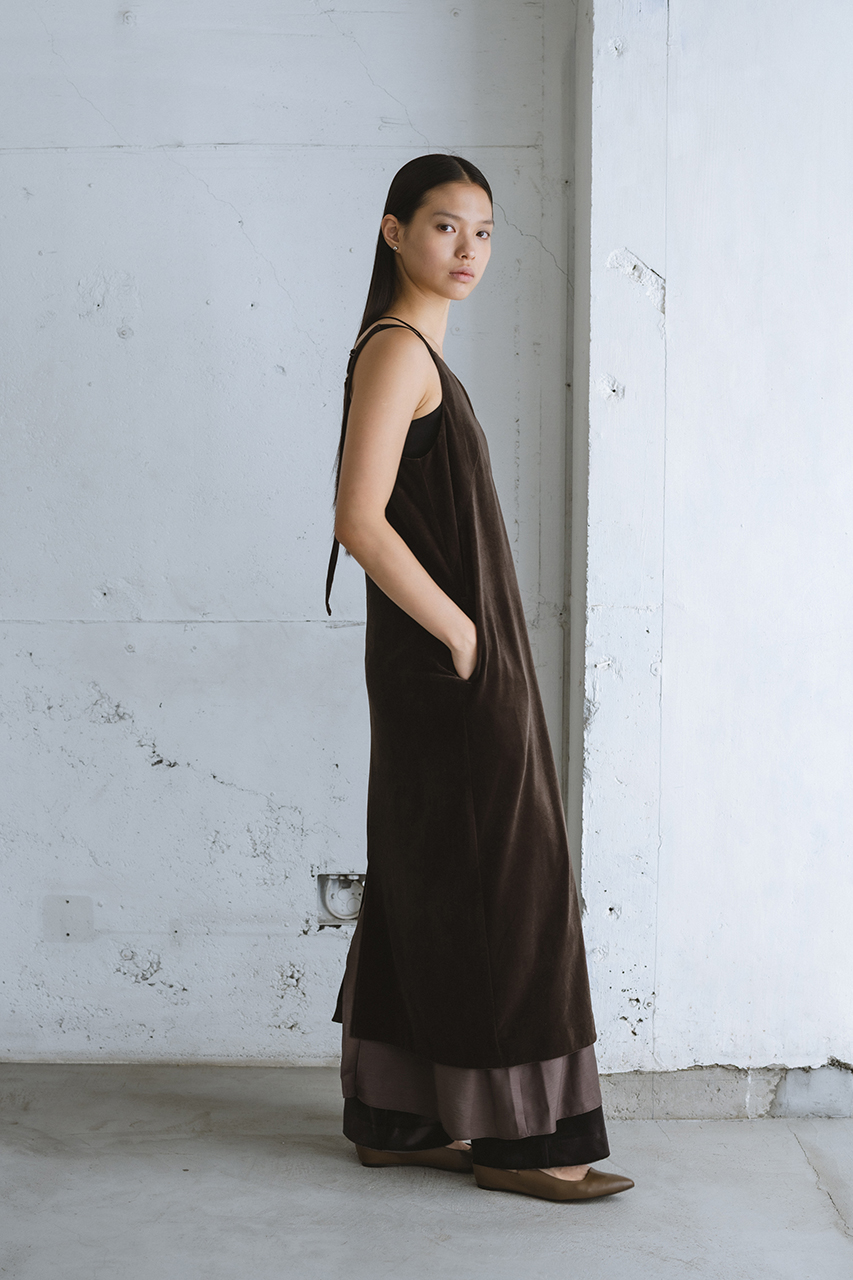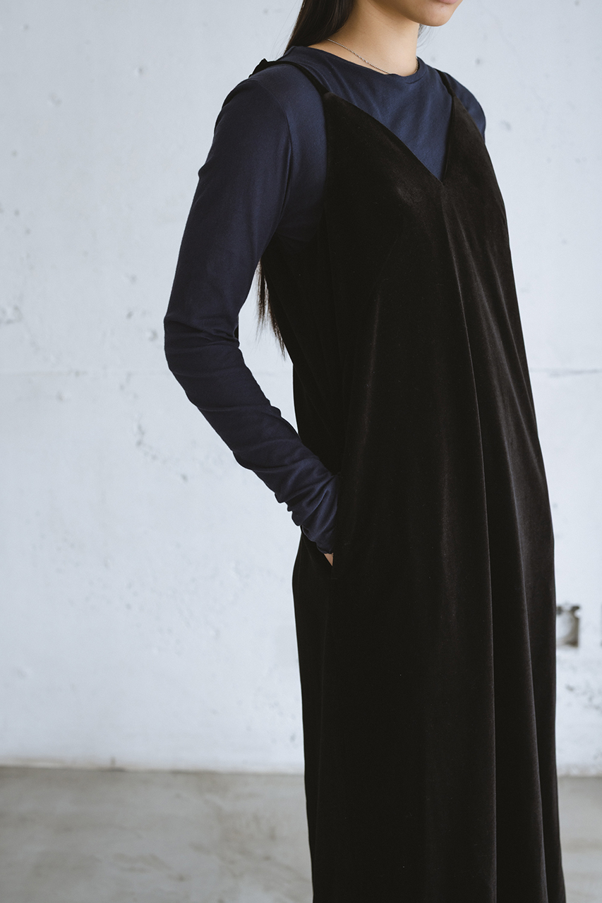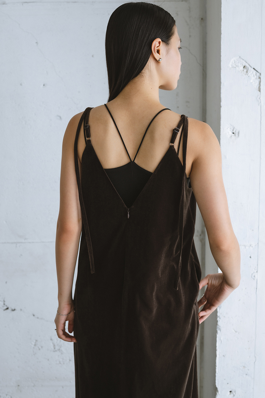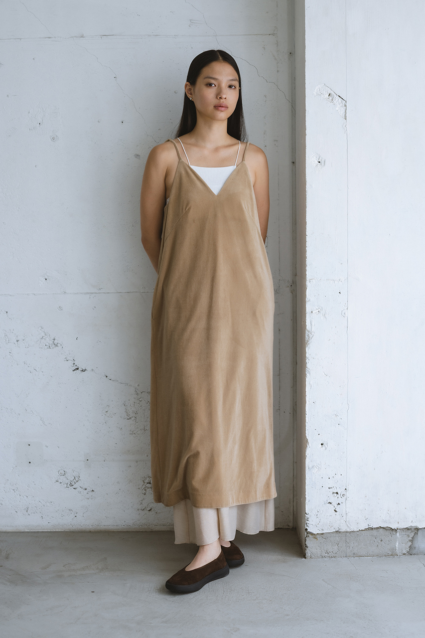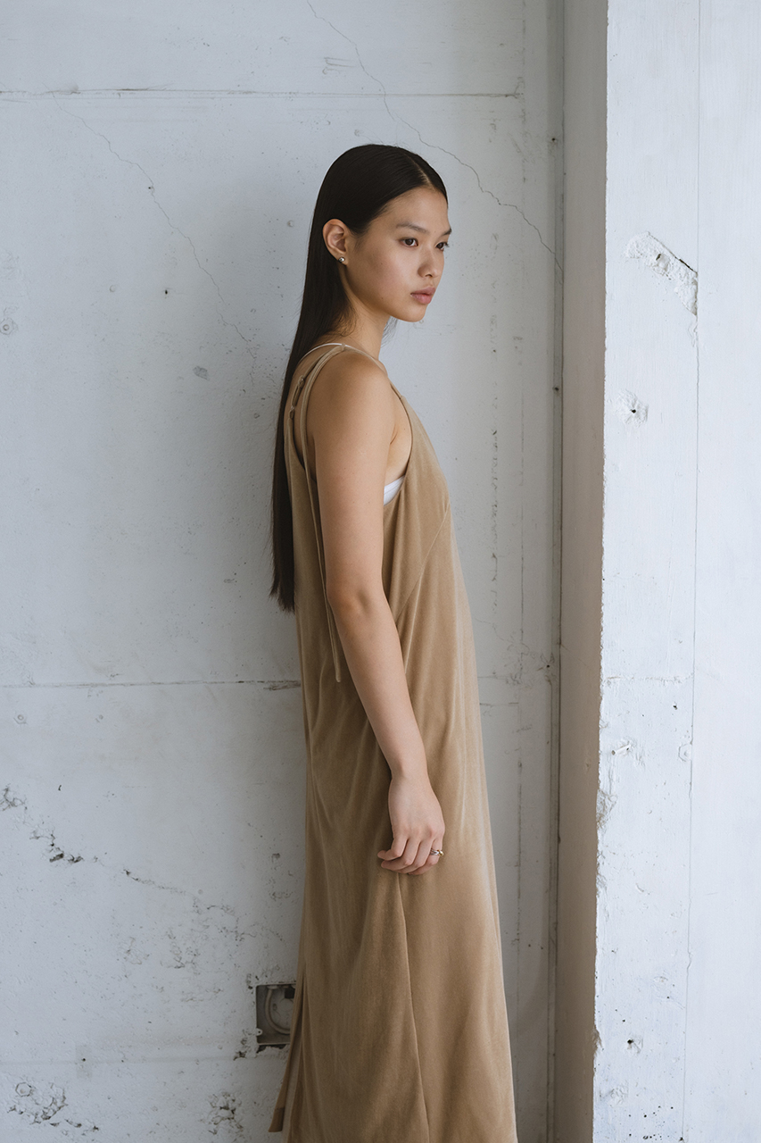 ストレッチの効いた軽くてしなやかなメッシュベロアと天然見えの布帛ラッフルヘムのレイヤーデザインが可愛いキャミワンピース。落ち着いたカラーとフレア分量を変えて動きをプラスした裾がデザインポイント。インナー次第でロングシーズン着用頂けます。透け感なし、ストレッチあり(表地)/なし(裏地)。