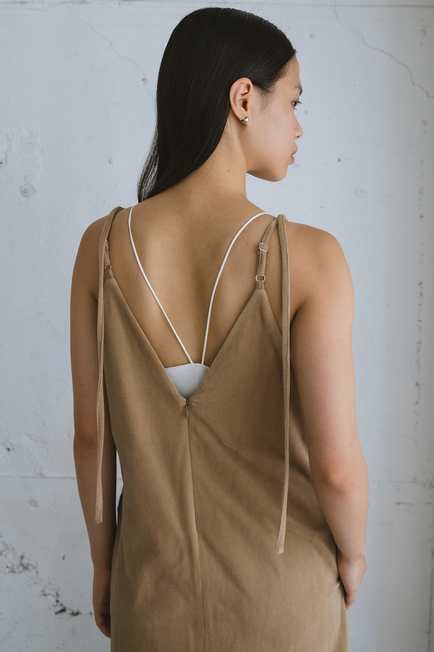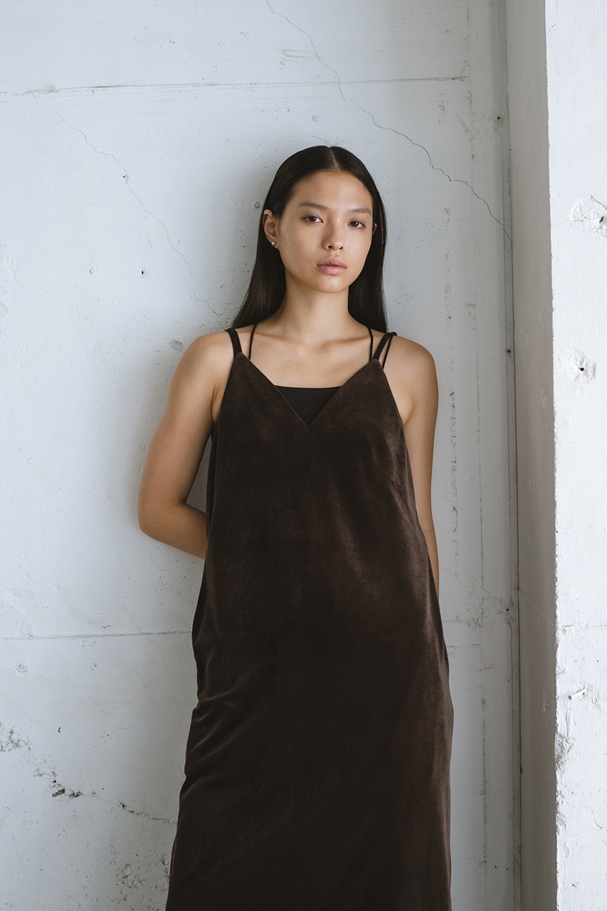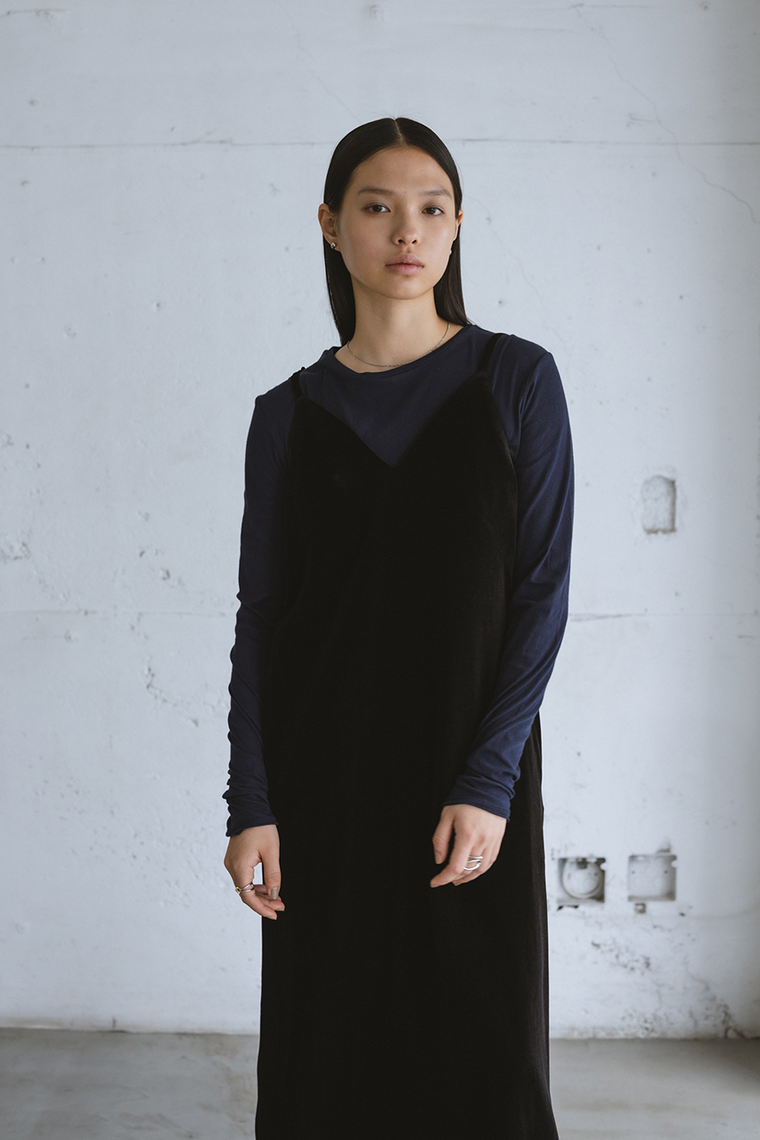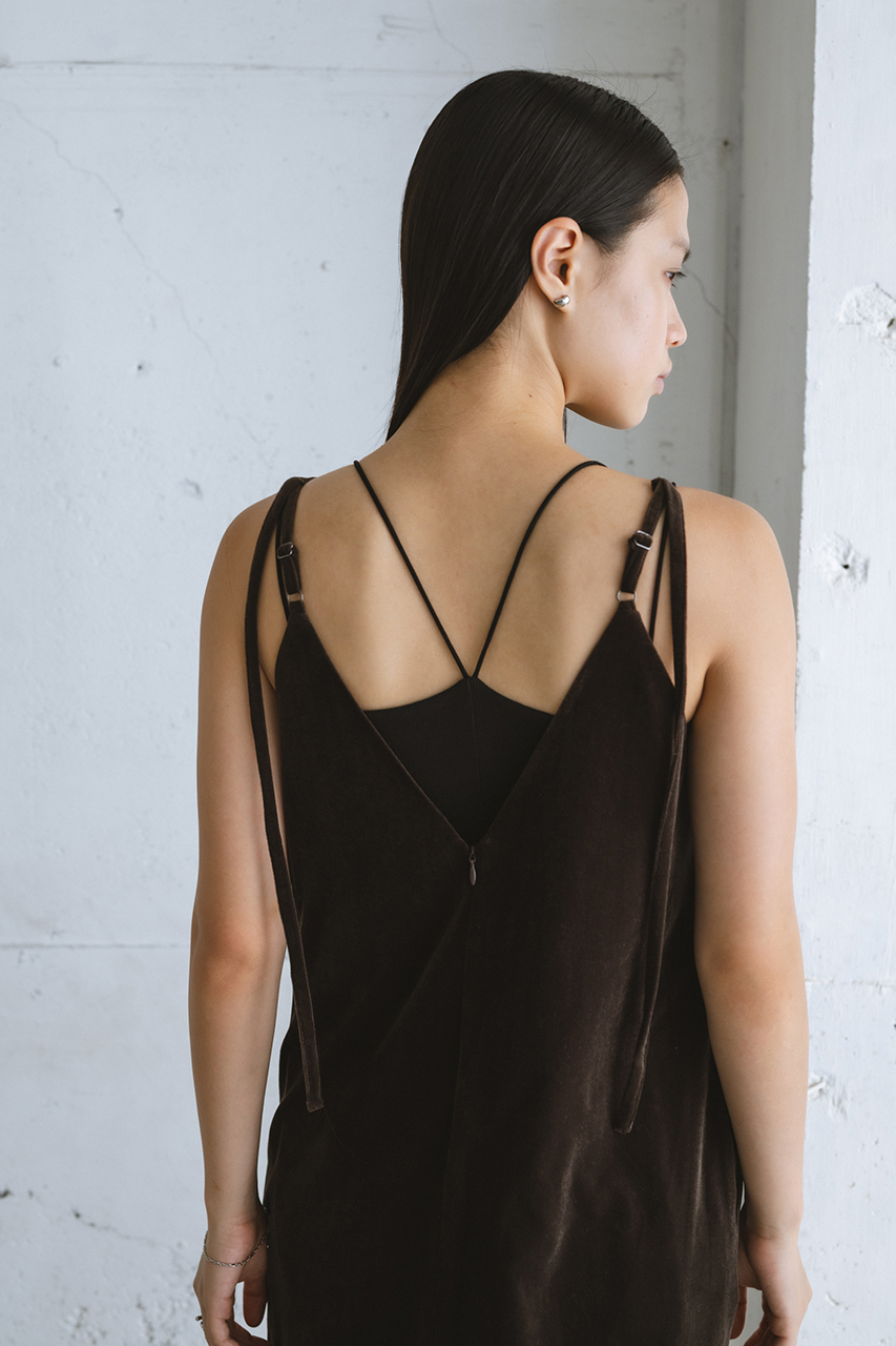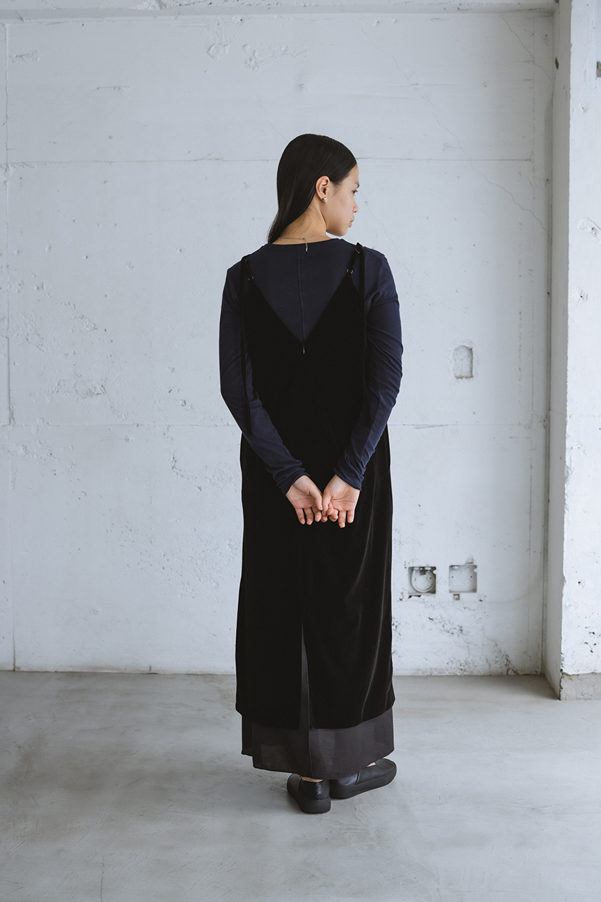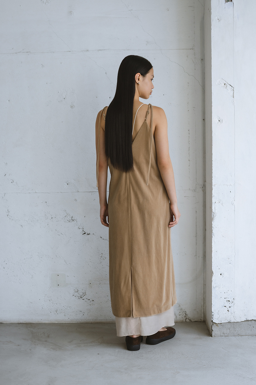 ストレッチの効いた軽くてしなやかなメッシュベロアと天然見えの布帛ラッフルヘムのレイヤーデザインが可愛いキャミワンピース。落ち着いたカラーとフレア分量を変えて動きをプラスした裾がデザインポイント。インナー次第でロングシーズン着用頂けます。透け感なし、ストレッチあり(表地)/なし(裏地)。