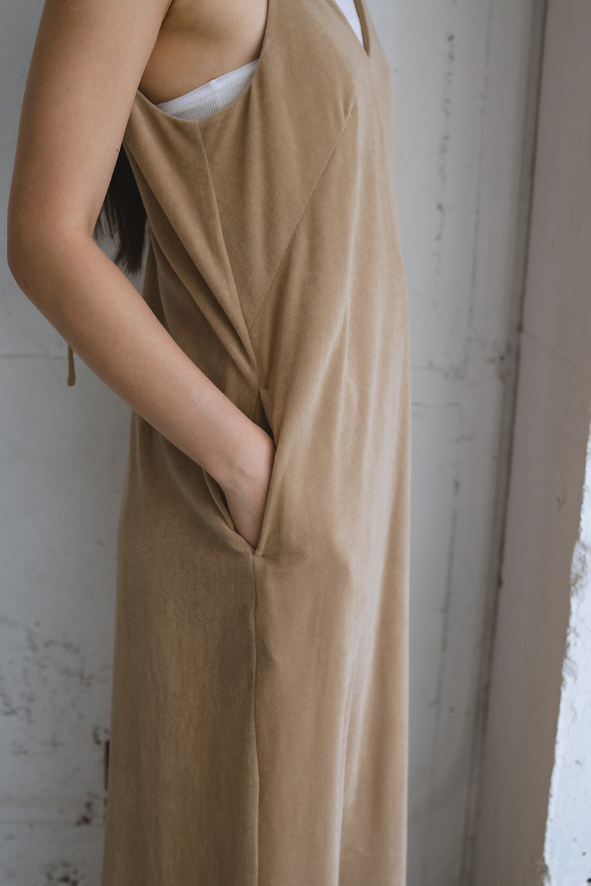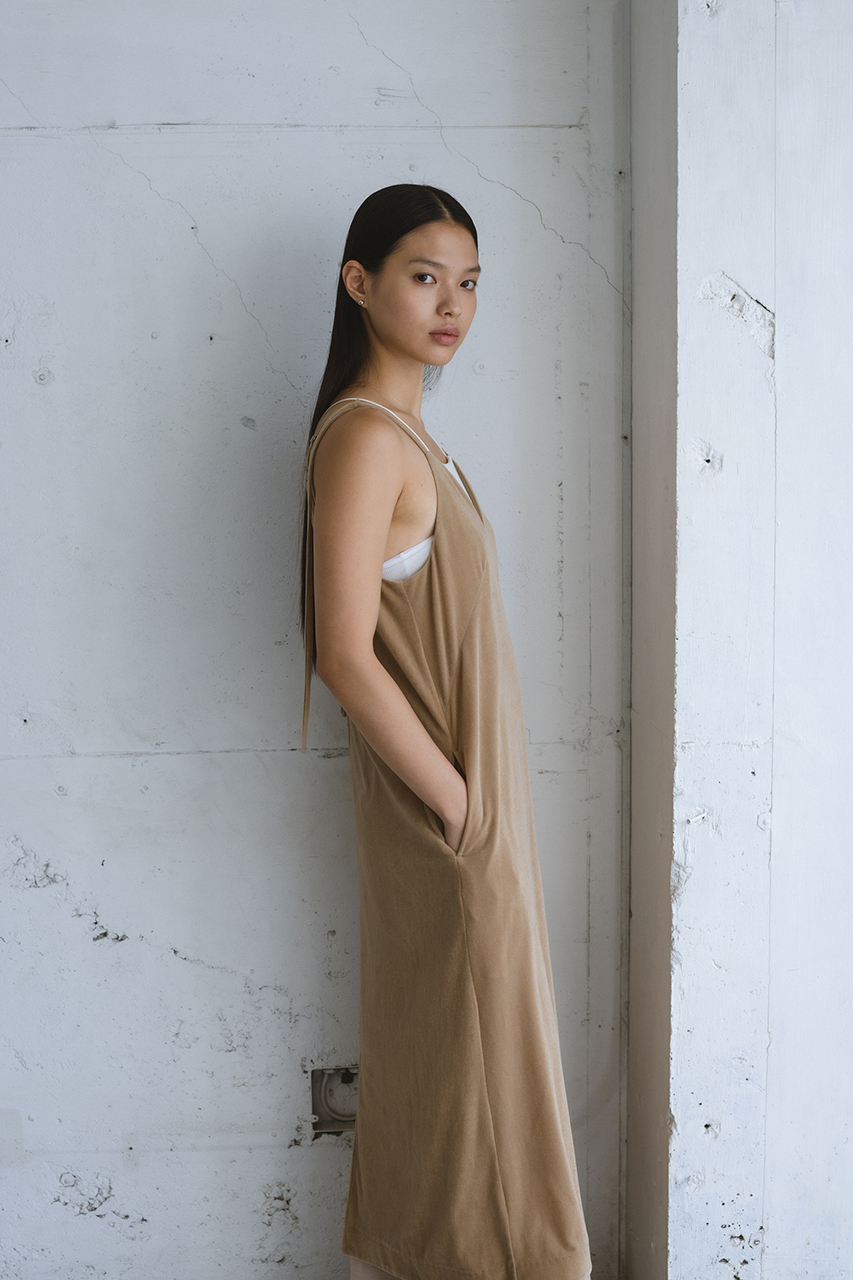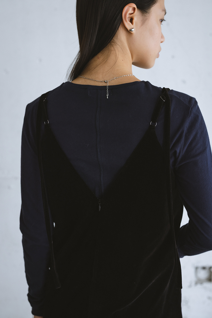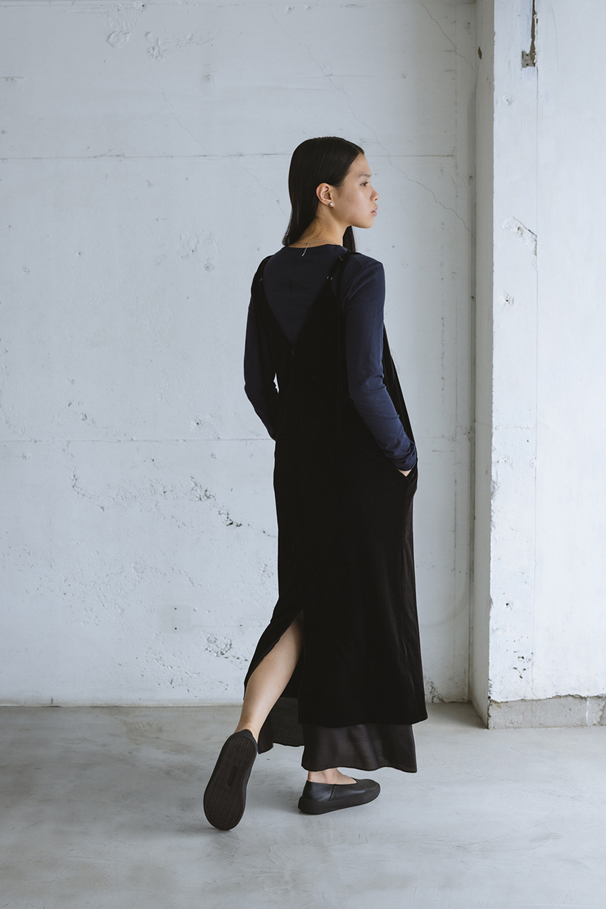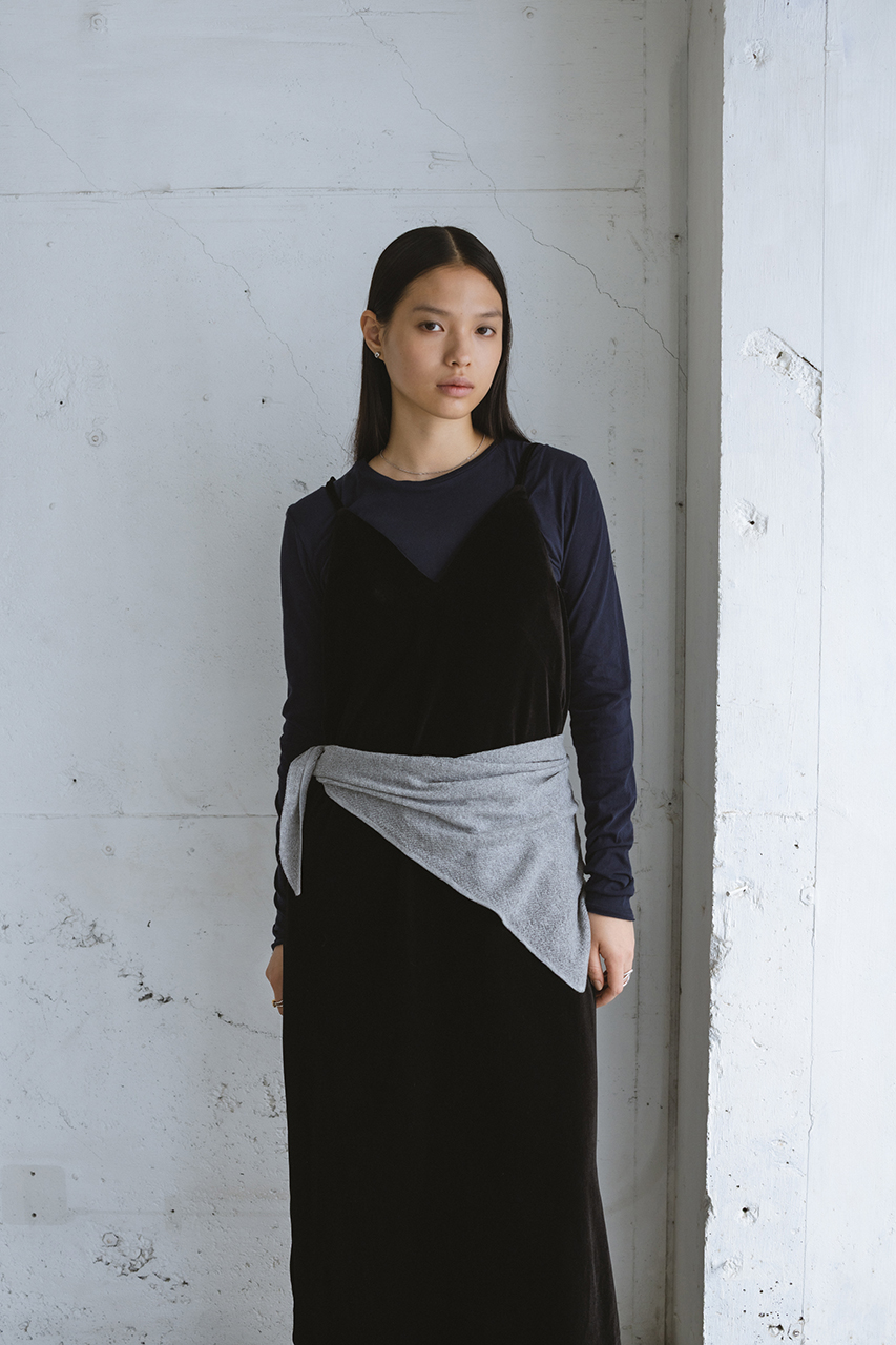 ストレッチの効いた軽くてしなやかなメッシュベロアと天然見えの布帛ラッフルヘムのレイヤーデザインが可愛いキャミワンピース。落ち着いたカラーとフレア分量を変えて動きをプラスした裾がデザインポイント。インナー次第でロングシーズン着用頂けます。透け感なし、ストレッチあり(表地)/なし(裏地)。
