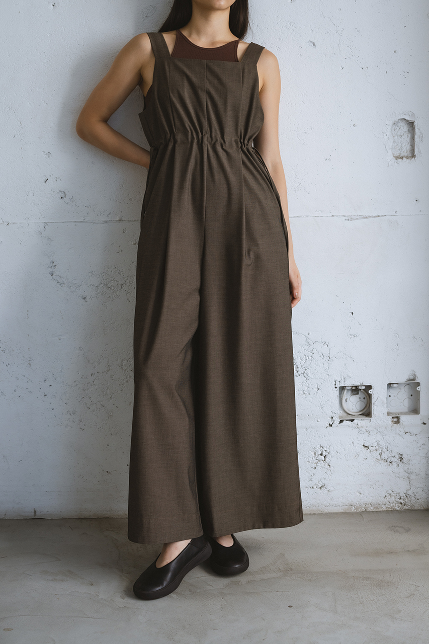 ゆったりルーズなサイジングのワイドロンパース。ウエストドロストを絞ったり、垂らしたりとシルエット変化を楽しめます。高見えするドライタッチな素材を使用。インナー次第でロングシーズン着用頂けます。透け感なし、ストレッチややあり。