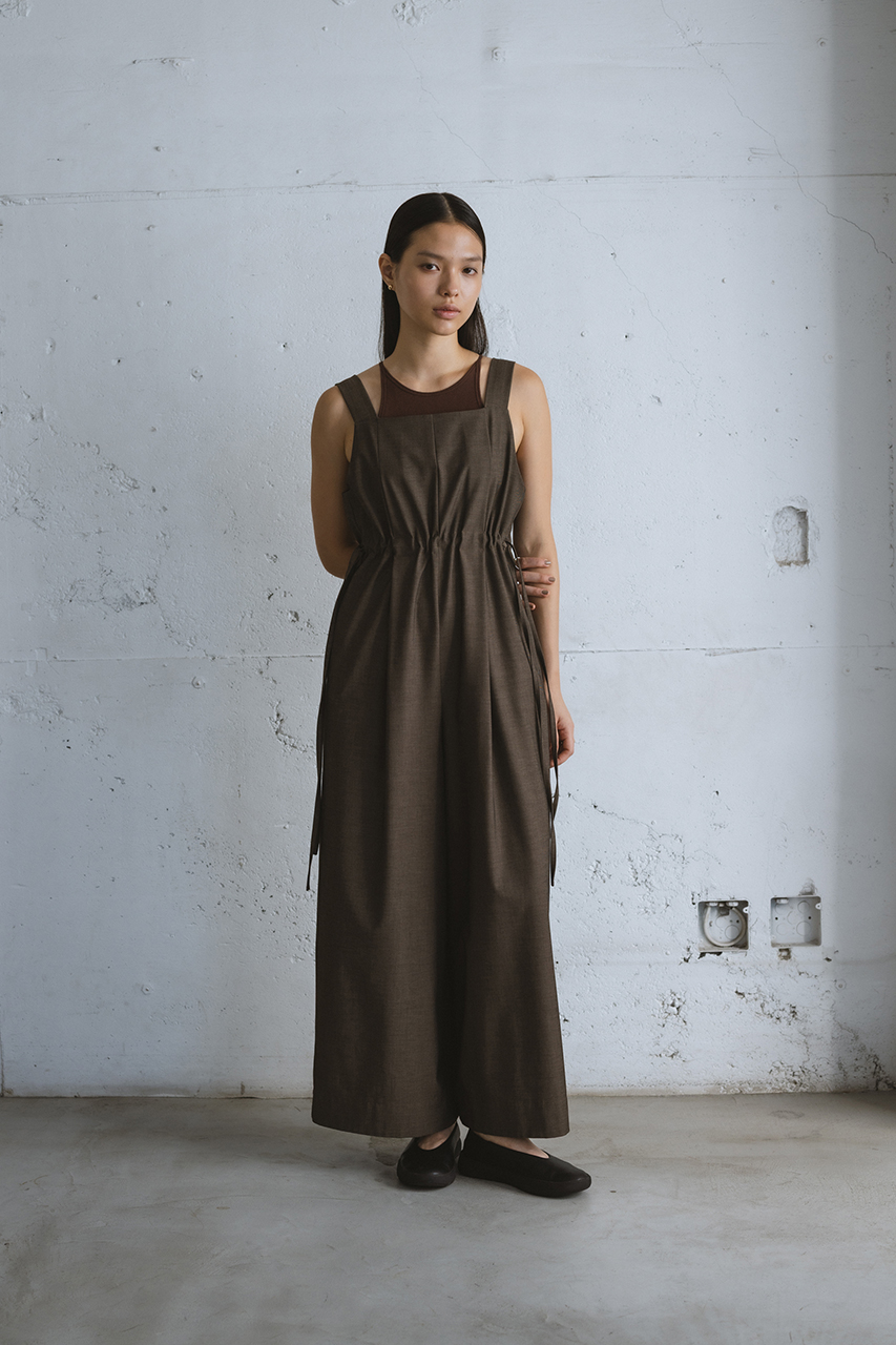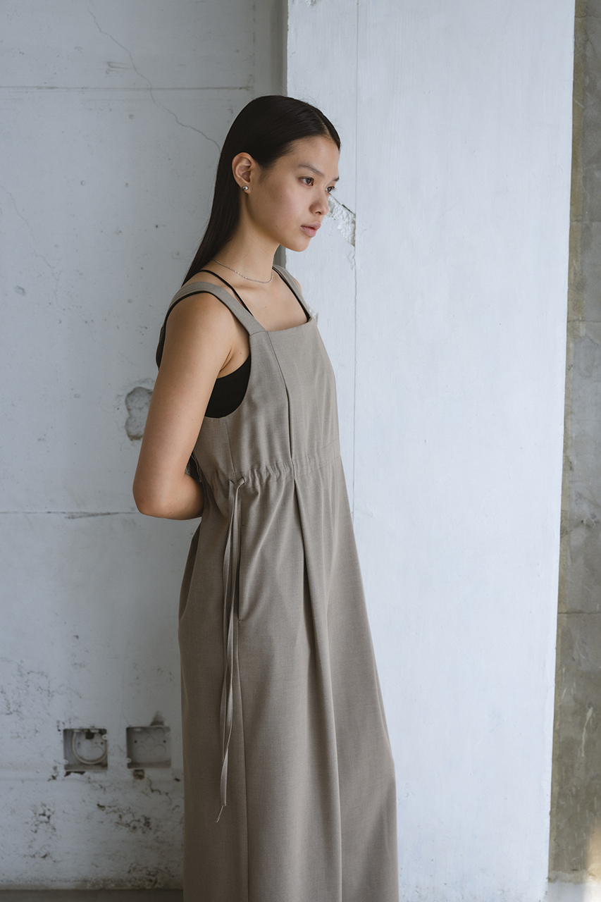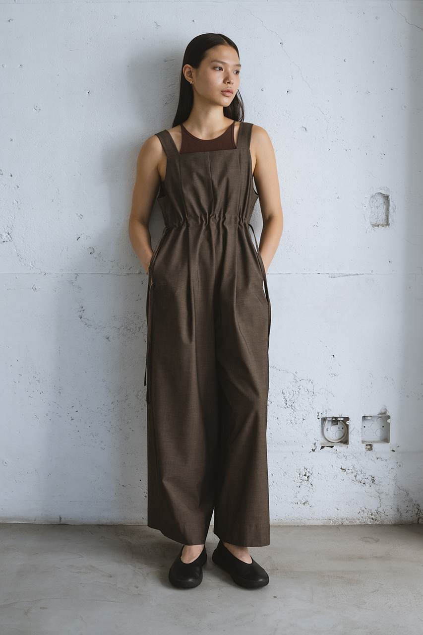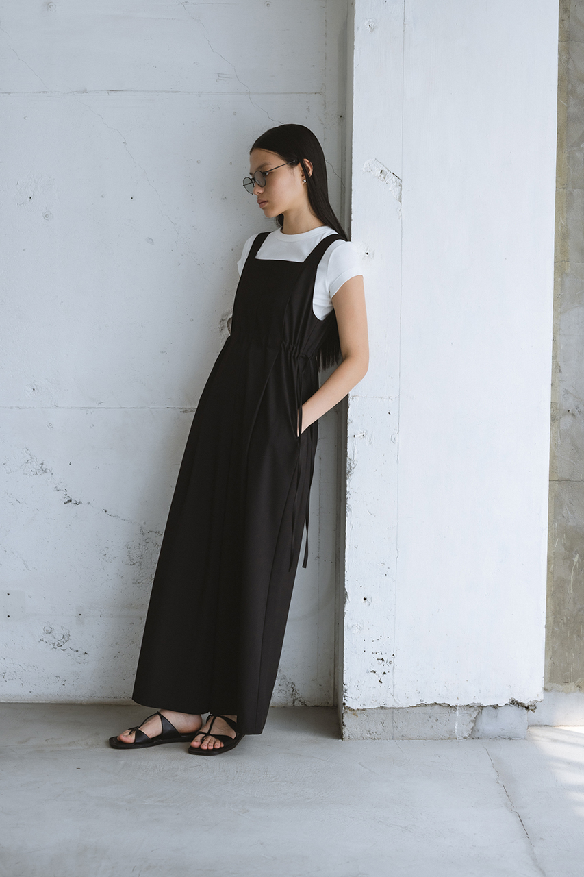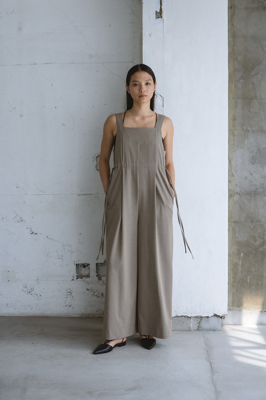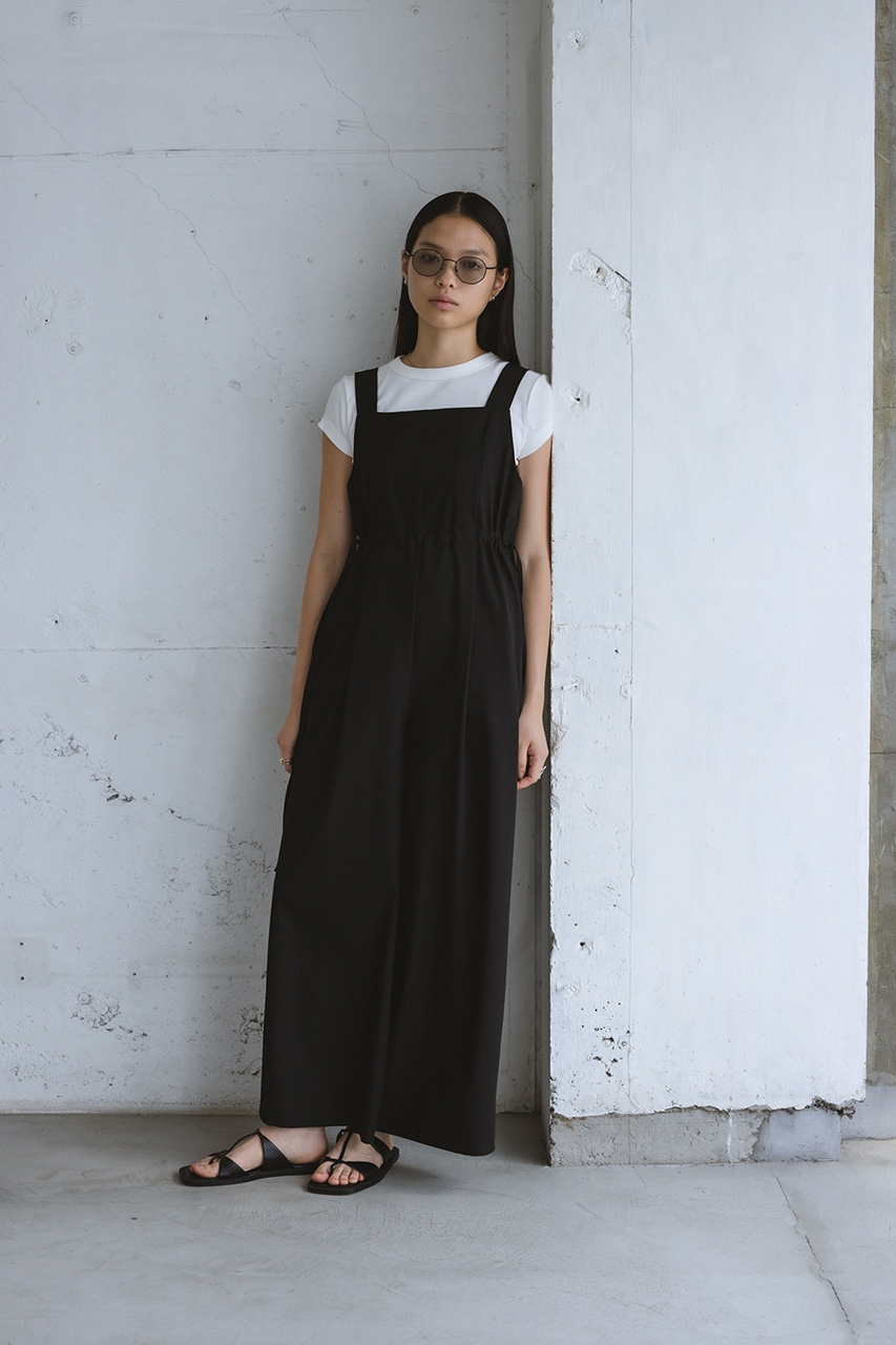 ゆったりルーズなサイジングのワイドロンパース。ウエストドロストを絞ったり、垂らしたりとシルエット変化を楽しめます。高見えするドライタッチな素材を使用。インナー次第でロングシーズン着用頂けます。透け感なし、ストレッチややあり。